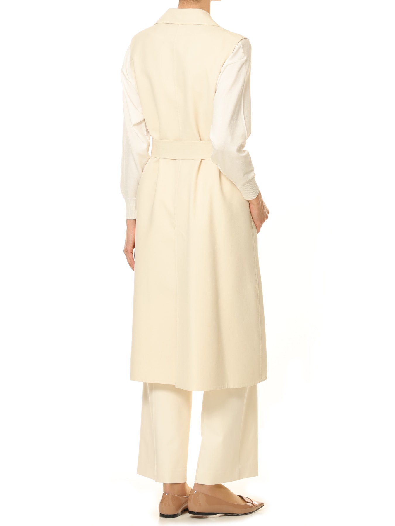 馴染みの良いIVORYカラーが目を惹く、綺麗目な雰囲気のロングジレ。綿のようなナチュラルなタッチの素材感は、ストレッチが効いており、しわになりにくいのも嬉しいところ。ダブルクロスの程よいふくらみ感と美しいシルエットを残しながらも、圧倒的な軽さも魅力の一つです。いつものコーディネートに取り入れていただくだけで洒落感がプラスされ、Iラインシルエットが生まれることでスタイルアップしてお召いただけます。ボタンレスのジレは着流していただくのは勿論、ウエストでベルトマークし女性らしく着こなしていただくのもお勧めです。ロング丈ですが、バックの深めのベンツ開きによって動きやすく、ボトムが覗くことでレイヤードが映えます。 ・共地ベルトあり(両脇ベルトループあり) ・リバー縫製 ・ポケットあり ・スチーム可能 ・ややゆとりのあるフィット。通常サイズをお勧めします。 ・重量約440g 【お問い合わせ品番】 A240-602