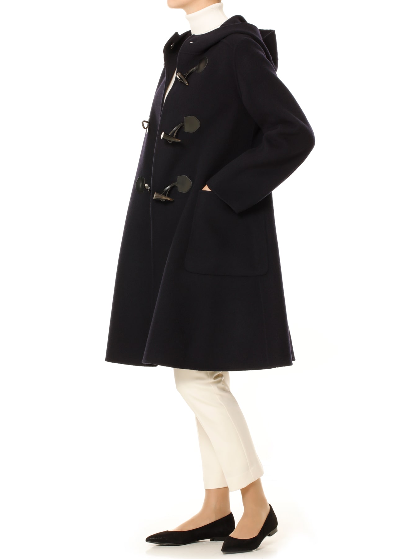 存在感を醸すフーディと水牛のトグルボタンがデザインポイントのダッフルコート。裾に向かって広がるたっぷりと分量感のあるフレアシルエットは、動くたびに揺れ女性らしくエレガントな雰囲気。ミドル丈によってバランスも取りやすくお召いただけます。最高峰であり高級素材として扱われるオーストラリアのジーロン地方で採取されるジーロンラムズウールをブレンドした、柔らかく滑らかな肌触りが魅力の素材感が抜群の着心地を与えてくれます。スリーブにのみ裏地を施すことで袖通しがし易く、身頃は裏地のないリバー素材ならではの軽い着心地が嬉しいところ。ダッフルコートは一着取り入れるだけで洒落感がプラスでき、シーズンムードを高めてくれる一着です。 ・オリジナル素材使用 ・袖のみ裏地あり ・ポケットあり ・フロントはトグルボタン開きのみ ・ややゆとりのあるフィット。通常サイズをお勧めします。 ・重量約1180g 【お問い合わせ品番】 A241-007