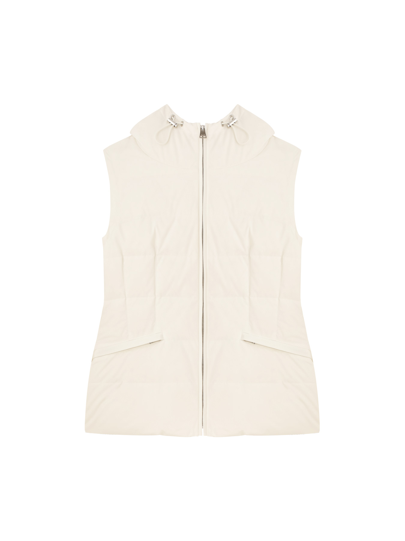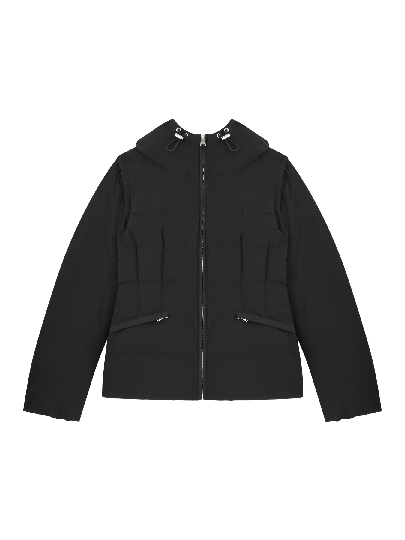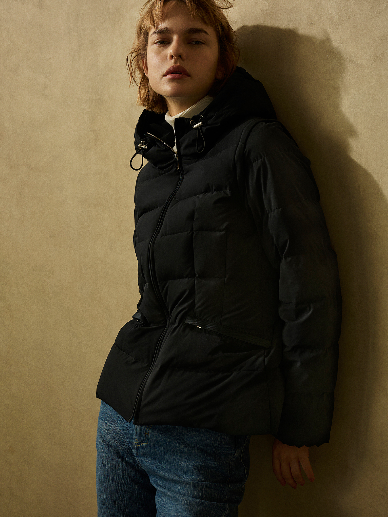 コンパクトなシルエットと上品な艶感が際立つ、エレガントなショートダウンコート。袖を取り外してベストとしても着用できる2WAY仕様で、シーンや気温に合わせて幅広く活躍します。バックウエスト部分のギャザーが女性らしい立体的なシルエットを生み、軽やかさの中にも洗練された印象をプラス。パンツを合わせれば都会的でモードなスタイリングに、スカートを合わせれば柔らかくフェミニンな印象に。フードまわりのメタルパーツがさりげないアクセントとなり、デイリーからお出かけまで上品に寄り添う一着です。 ※こちらの商品は、デザインの都合上、脇下部分に開きがあります。何卒ご了承ください。 ・袖はファスナーで取り外し可能(脇下に空きがあります) ・裏地あり ・ファスナー付きポケットあり ・重量約640g ・ジャストフィット。通常サイズをおすすめします。 【お問い合わせ品番】 A246-001