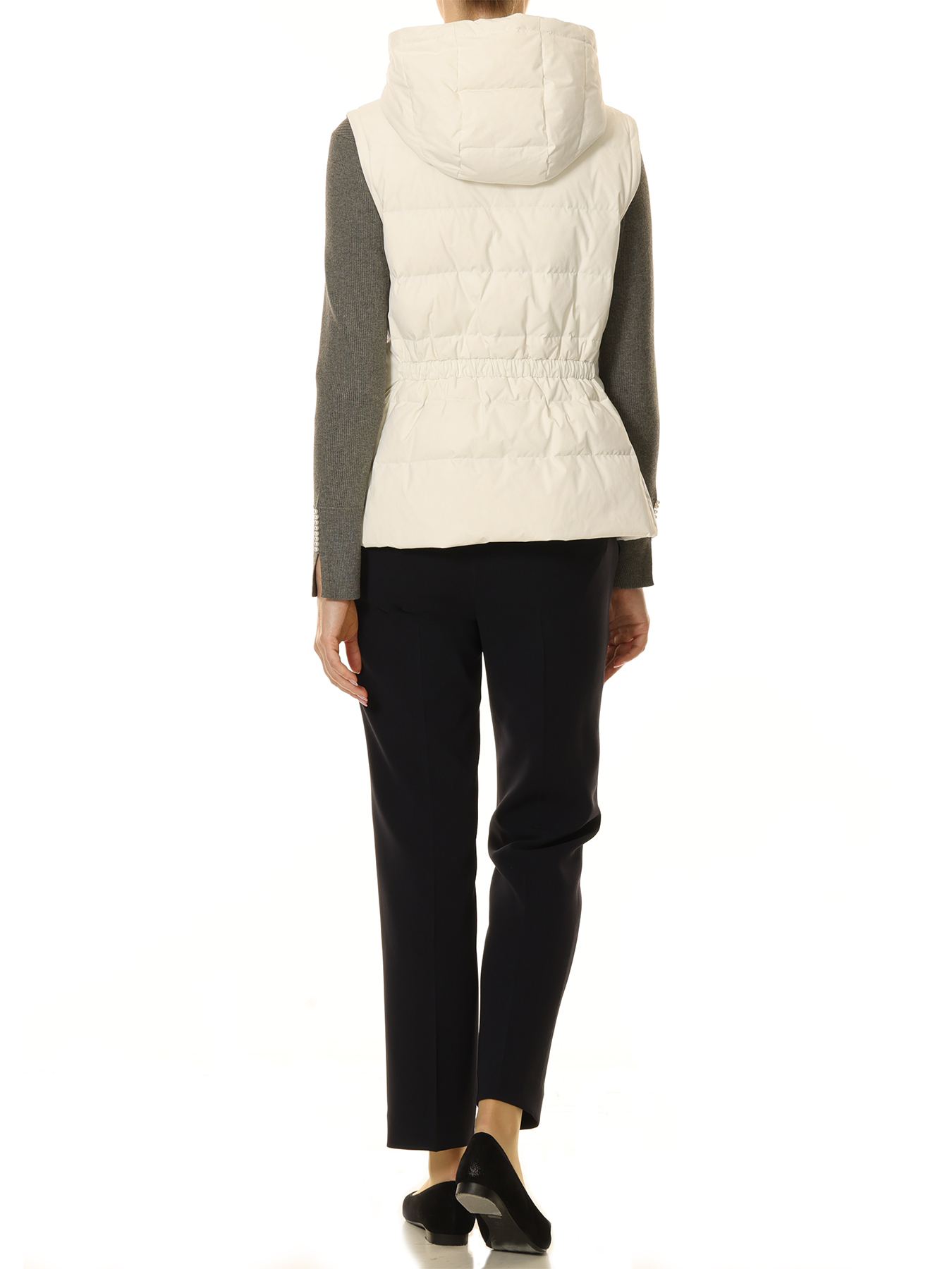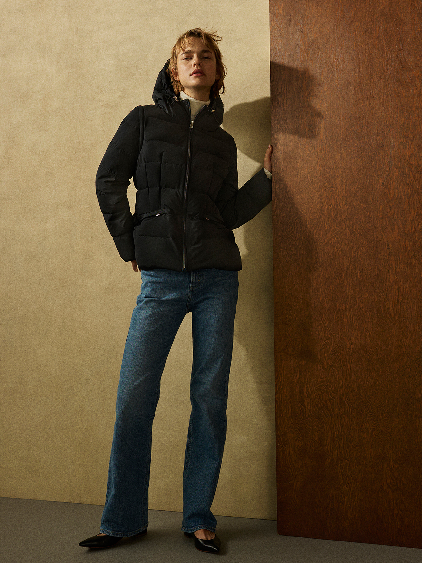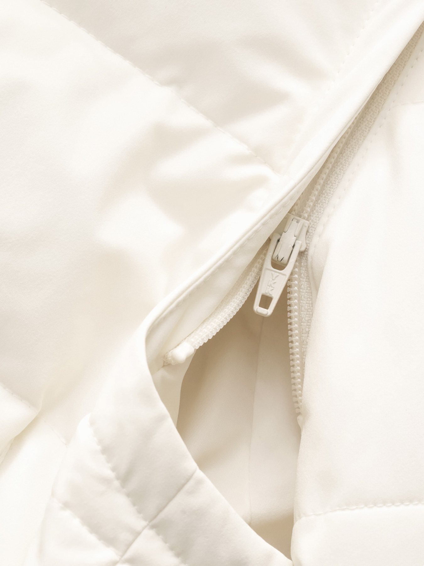 コンパクトなシルエットと上品な艶感が際立つ、エレガントなショートダウンコート。袖を取り外してベストとしても着用できる2WAY仕様で、シーンや気温に合わせて幅広く活躍します。バックウエスト部分のギャザーが女性らしい立体的なシルエットを生み、軽やかさの中にも洗練された印象をプラス。パンツを合わせれば都会的でモードなスタイリングに、スカートを合わせれば柔らかくフェミニンな印象に。フードまわりのメタルパーツがさりげないアクセントとなり、デイリーからお出かけまで上品に寄り添う一着です。 ※こちらの商品は、デザインの都合上、脇下部分に開きがあります。何卒ご了承ください。 ・袖はファスナーで取り外し可能(脇下に空きがあります) ・裏地あり ・ファスナー付きポケットあり ・重量約640g ・ジャストフィット。通常サイズをおすすめします。 【お問い合わせ品番】 A246-001