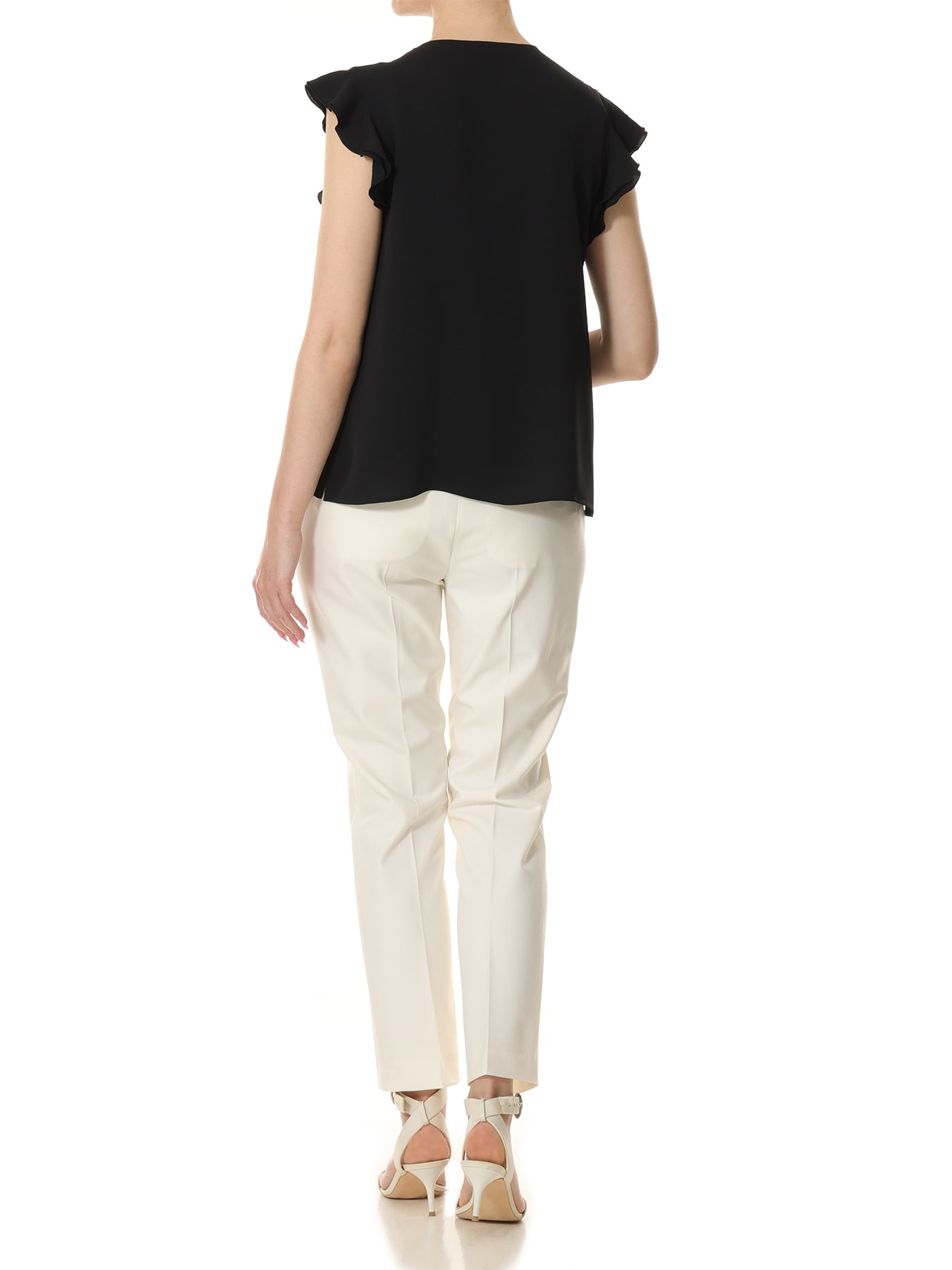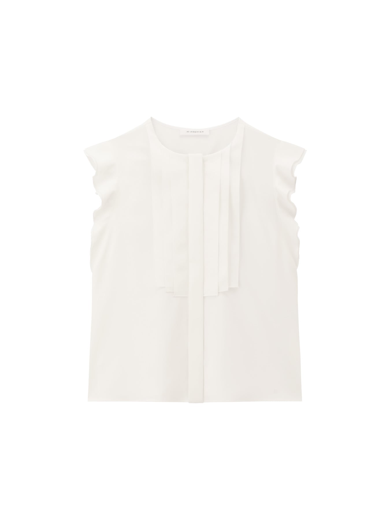しなやかな落ち感と美しい表面感が際立つ梨地素材を使用した、エレガントなノースリーブブラウス。フロントに施された前立て脇の立体的なデザインが縦のラインを強調し、すっきりと洗練された印象へと導きます。動くたびにさりげなく揺れるディテールが、シンプルな中にも奥行きと華やぎを添える一着です。肩先にかかる程よいフレアスリーブが、二の腕を自然にカバーしながら女性らしい柔らかさを演出します。UVカットに加え、吸水・速乾・遮熱機能、さらに接触冷感素材を備えた機能性の高さも魅力。暑い季節でも快適な着心地を叶えつつ、見た目の上品さを損なわない、デイリーに頼れる一枚です。スカートスタイルには、タックやフレアシルエットのスカートと合わせて、軽やかで品のあるフェミニンスタイルに。トップスの縦ラインデザインがウエスト周りをすっきり見せ、スタイルアップ効果も期待できます。パンツスタイルには、センタープレスパンツやテーパードパンツを合わせて、きちんと感のある洗練された着こなしに。足元をヒールで引き締めることで、より都会的でエレガントな印象に仕上がります。デニムと合わせれば、程よくカジュアルダウンしながらも上品さを保った、大人のきれいめスタイルをお楽しみいただけます。 ・ご家庭で手洗いが可能 ・UVカット加工素材 ・吸水・速乾・遮熱素材 ・接触冷感素材 ・WHITEは透け感あり ・フロント比翼ボタン開き ・スチーム可能 ・ジャストフィット。通常サイズをおすすめします。 ・モデル身長171cm/バスト82cm/ウエスト60cm/ヒップ88cm/38サイズ着用 【お問い合わせ品番】 WHITE:A347-012 BLACK:A347-013