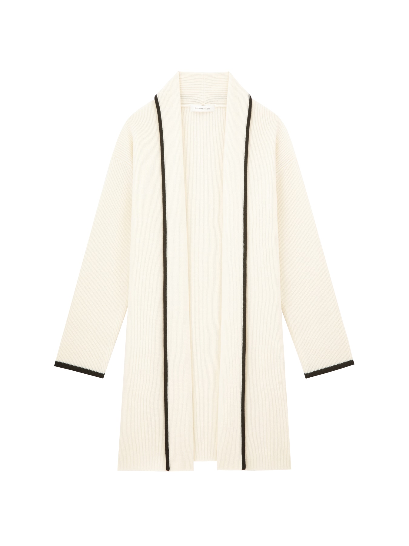 肩の力を抜いたこなれ感漂うショールカラーのカーディガン。前立てに釦がない着流しタイプで程良い厚みがあり、季節の変わり目の羽織としても活躍する一枚。膝上程のロング丈はバランスが取りやすく、サイドのスリットもポイントに。ボディを暖かく包み込むウールとカシミヤブレンドのリブ編みニットは、軽量で肌触りの良さも魅力の一つ。袖口と襟のバイカラーのデザインがシックでクラシカルな雰囲気を添えてくれます。コンパクトなボトムと合わせてすっきりお召しいただくのがお勧めで、オンオフ問わずに着まわしていただけます。 ・WHITEはやや透け感あり ・ややゆとりのあるフィット。通常サイズをお勧めします。 ・モデル身長171cm/バスト82cm/ウエスト60cm/ヒップ88cm/36サイズ着用 【お問い合わせ品番】 A738-013