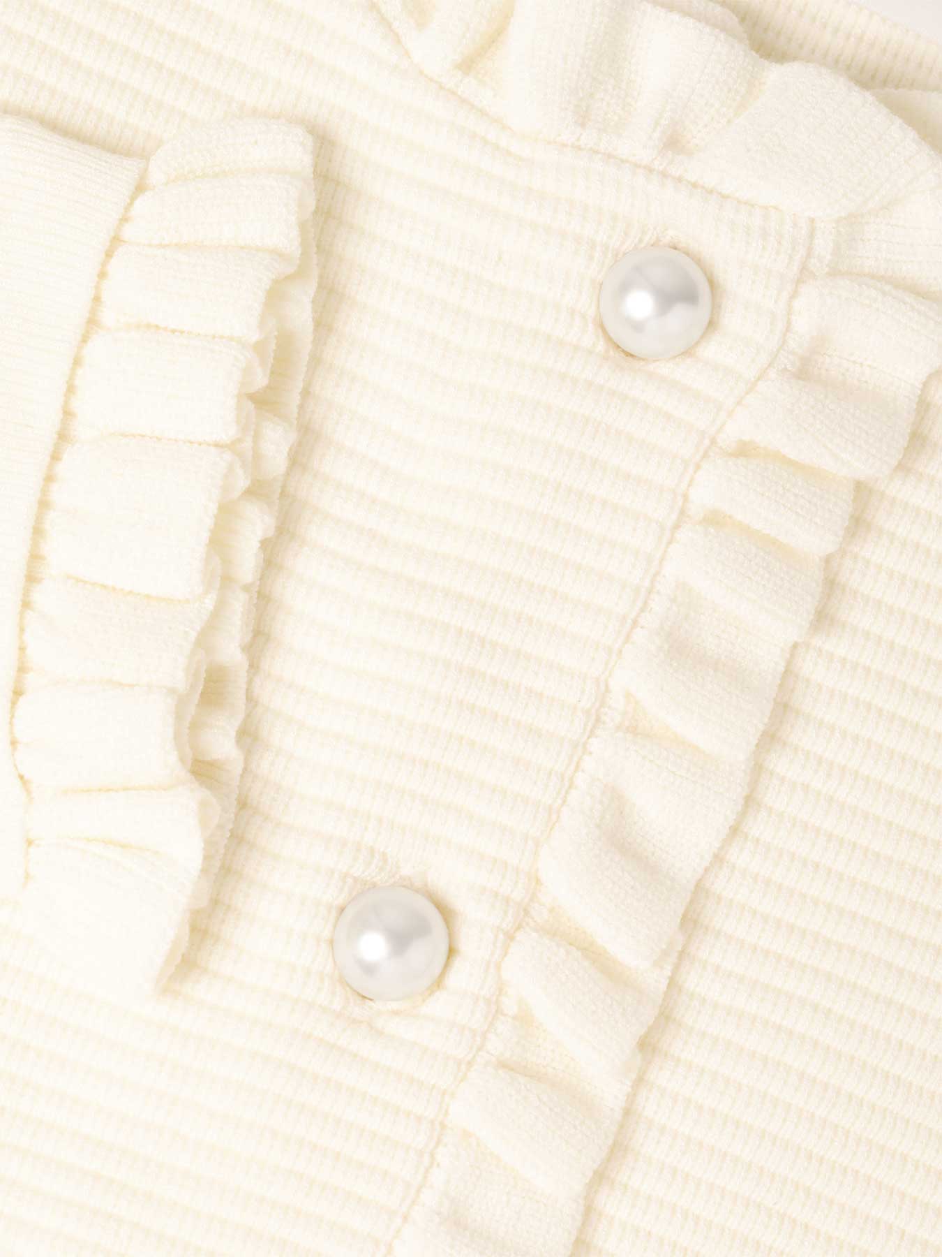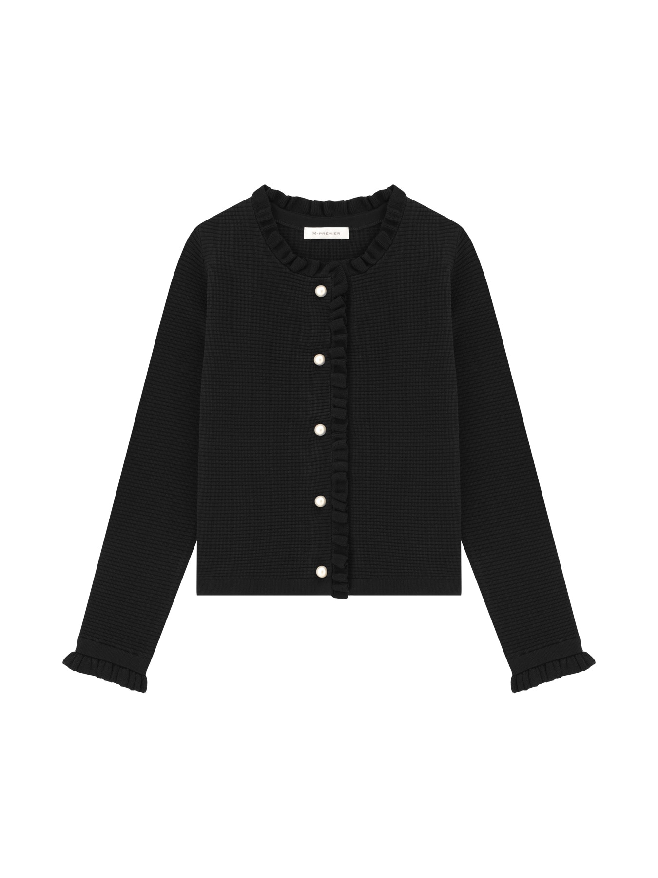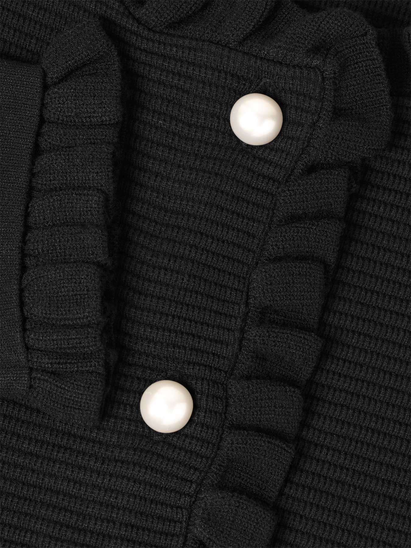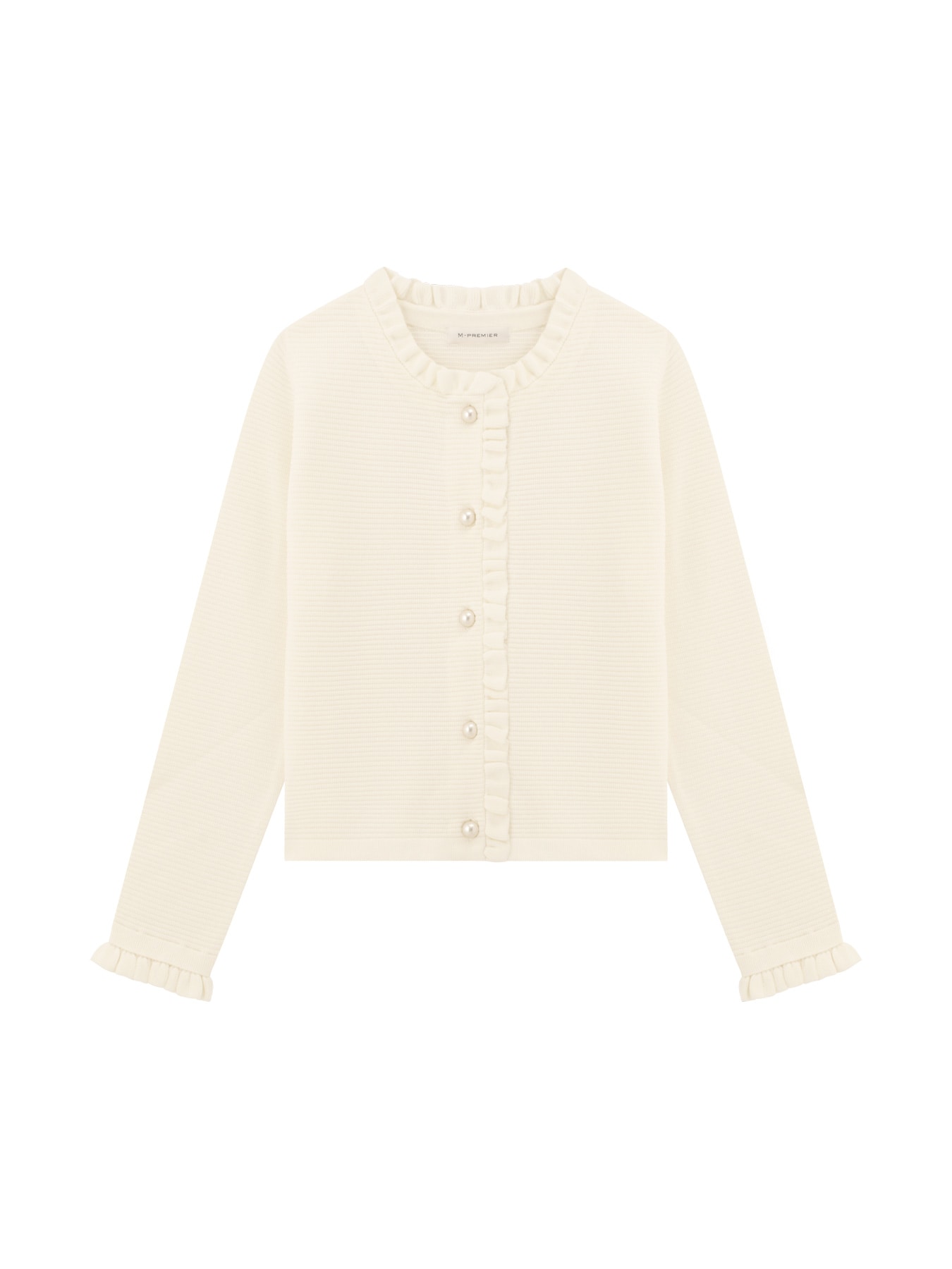 凹凸感のある立体的な編地が上質感を漂わせるニットジャケット。フロントに並ぶパールボタンと襟元・袖口のフリルが、エレガントな華やぎを添える一枚です。軽やかな着心地ながらきちんと見えが叶うデザインで、ジャケット感覚で羽織るだけでなく、一枚でトップスとしても活躍。スカートに合わせればフェミニンでクラシカルな装いに、パンツスタイルと組み合わせればモード感漂うスタイリングに仕上がります。オンからオフまで幅広いシーンでお楽しみいただける万能アイテムです。 ・ご家庭で手洗いが可能 ・WHITEは透け感あり ・パールボタン部分にアイロンをあてますと、傷が入る可能性がございますので、ご注意ください。 ・ジャストフィット。通常サイズをお勧めします。 【お問い合わせ品番】 A746-005