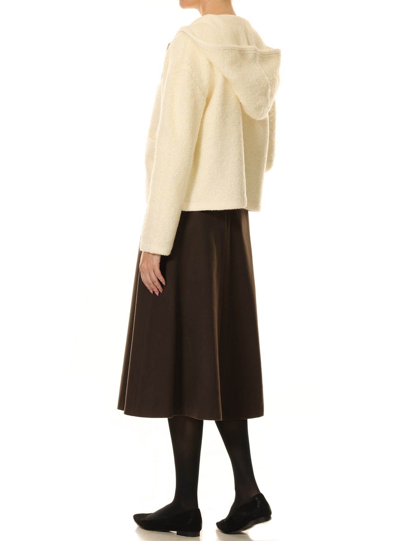 ふっくらとしたローゲージ編みの風合いが、季節感と暖かみを添えるニットパーカー。軽やかさの中に上質さが漂うループ状の編地が、シンプルなデザインをエレガントに昇華します。フード付きのリラクシーなシルエットながら、コンパクトな丈感とミニマルなジップデザインで、すっきりとした印象に。スカートに合わせれば女性らしく柔らかなムードに、パンツスタイルに合わせればモードで都会的な着こなしに。デイリーにもお出かけにも活躍する、着回し力に優れた一枚です。 ・ポケットあり ・フロントファスナー開き ・ジャストフィット。通常サイズをお勧めします。 【お問い合わせ品番】 A746-006