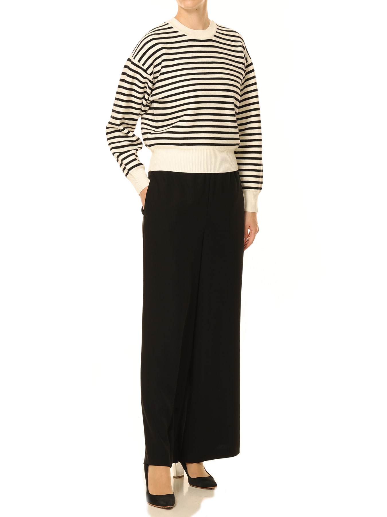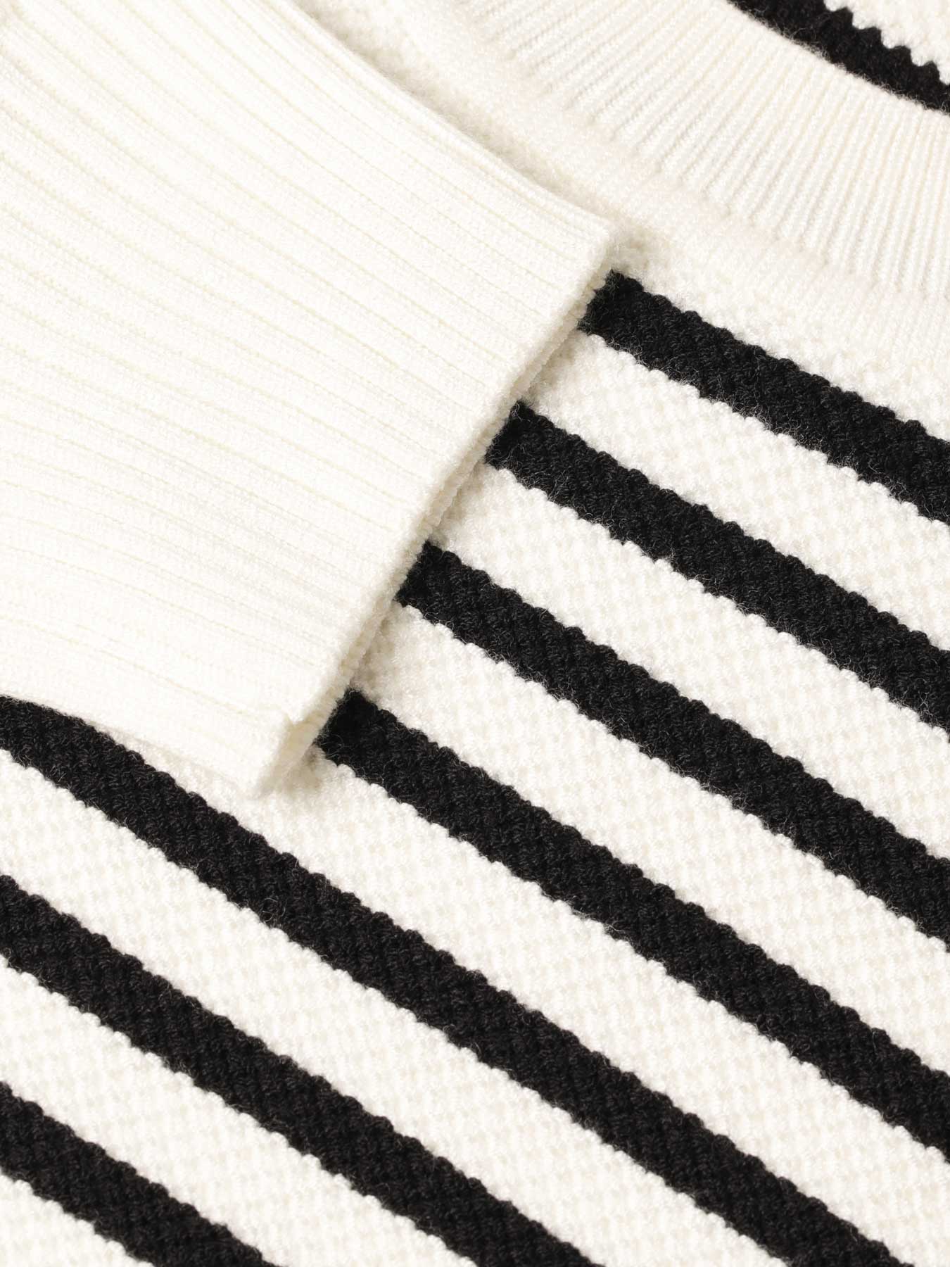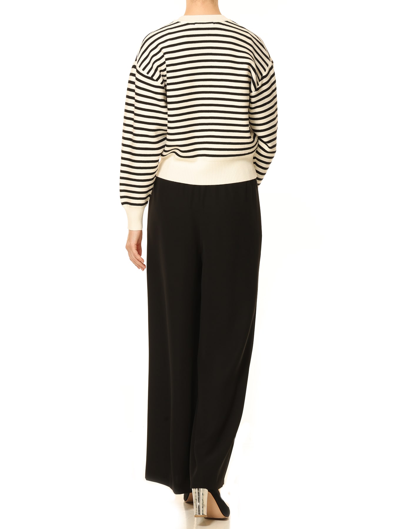 モノトーンのボーダーが洗練された印象を与えるクルーネックニット。ややゆとりのある身幅と抜け感のあるドロップショルダーに対し、コンパクトな丈感でバランス良く仕上げており、シンプルながらもスタイルアップを叶えてくれる一枚です。レーヨンベースならではのしなやかな風合いと上品な艶感を持ち、手洗い可能な扱いやすさも魅力。オンシーンではタイトスカートに合わせて洗練された着こなしに、オフシーンではワイドパンツやデニムと合わせてモードなエフォートレススタイルに。スカートとパンツ、どちらにも合わせやすい汎用性の高さで、ワードローブに加えておきたいエレガントなボーダーニットです。 ・ご家庭で手洗い可能 ・ややゆとりのあるフィット。通常サイズをお勧めします。 【お問い合わせ品番】 A746-017