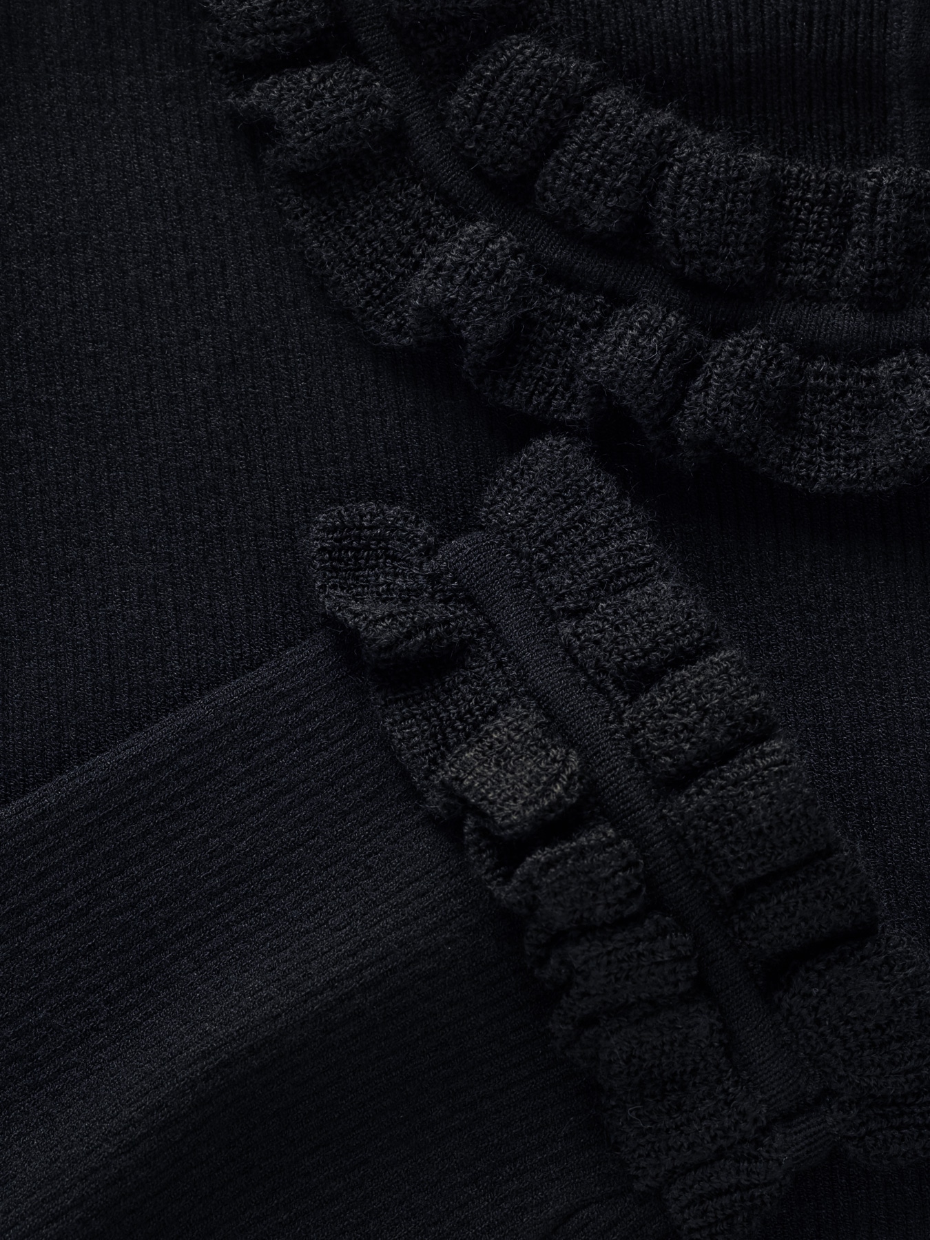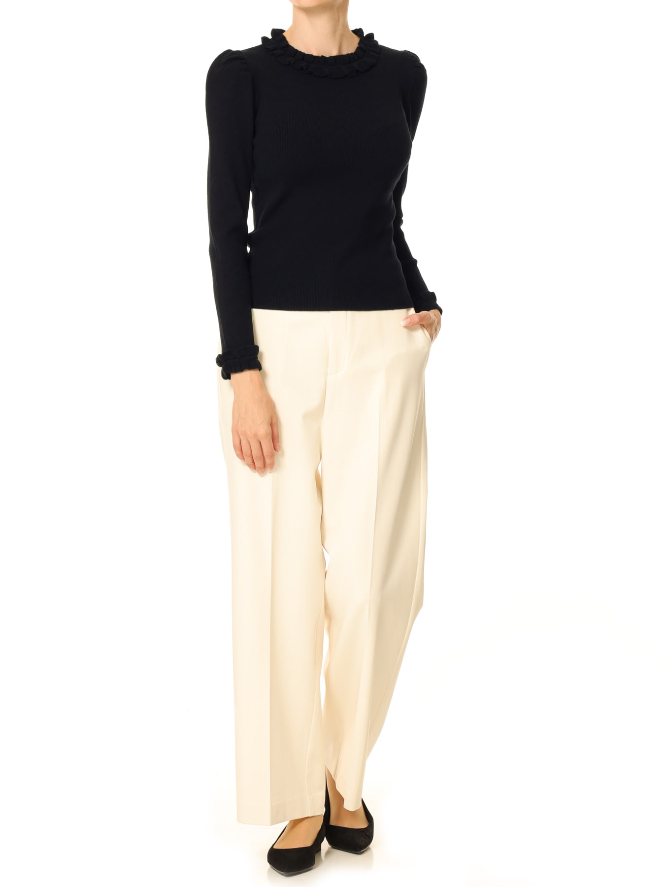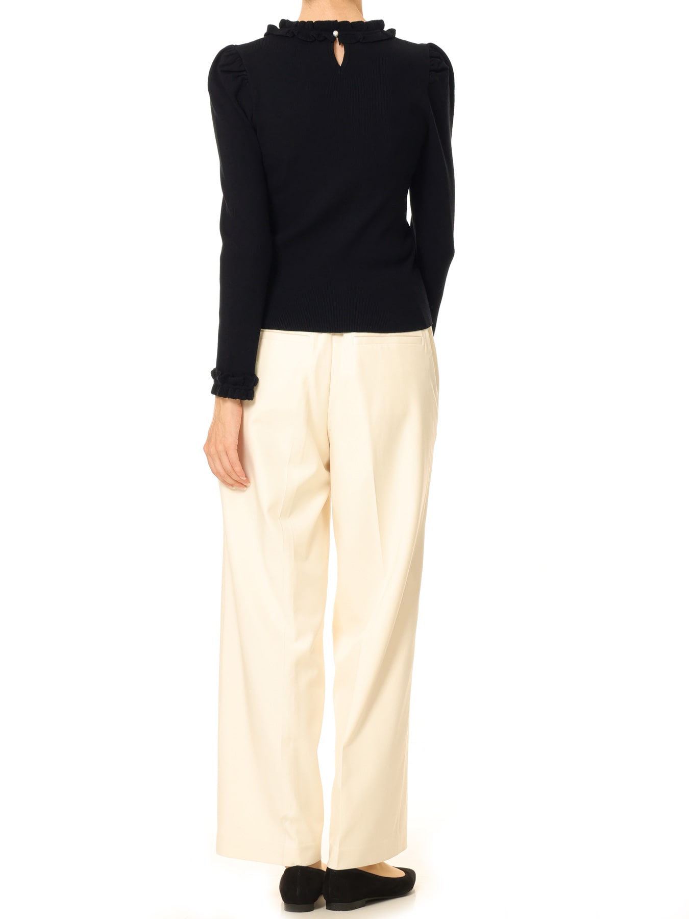 首元と袖口に施されたフリルデザインがエレガントな雰囲気漂うパフスリーブのリブニットプルオーバー。バックスタイルで煌めくパール釦が華やぎをプラスしてくれます。コンパクトなシルエットにふわりと膨らむショルダーラインとフリルデザインがポイントとなり、ワイドパンツなどボリューム感のあるボトムともバランスよくお召しいただけます。アウターやジレからフリルデザインが見えてもアクセントになりレディライクな着こなしが完成します。レーヨンブレンドのちくちく感の少ない滑らかな素材感が着心地の良さを与えてくれるのも魅力の一つ。一枚でエレガンススタイルが決まる着回し力に優れたシンプルなニットはオンオフに活躍します。 ・ジャストフィット。通常サイズをお勧めします。 【お問い合わせ品番】 A746-038