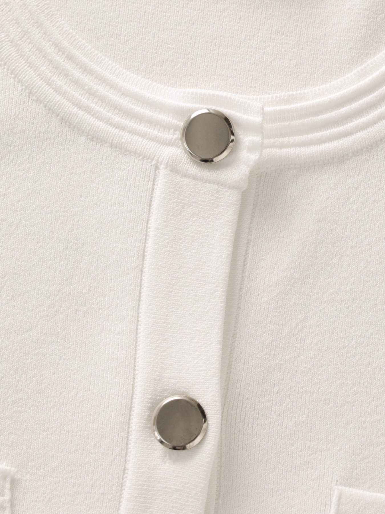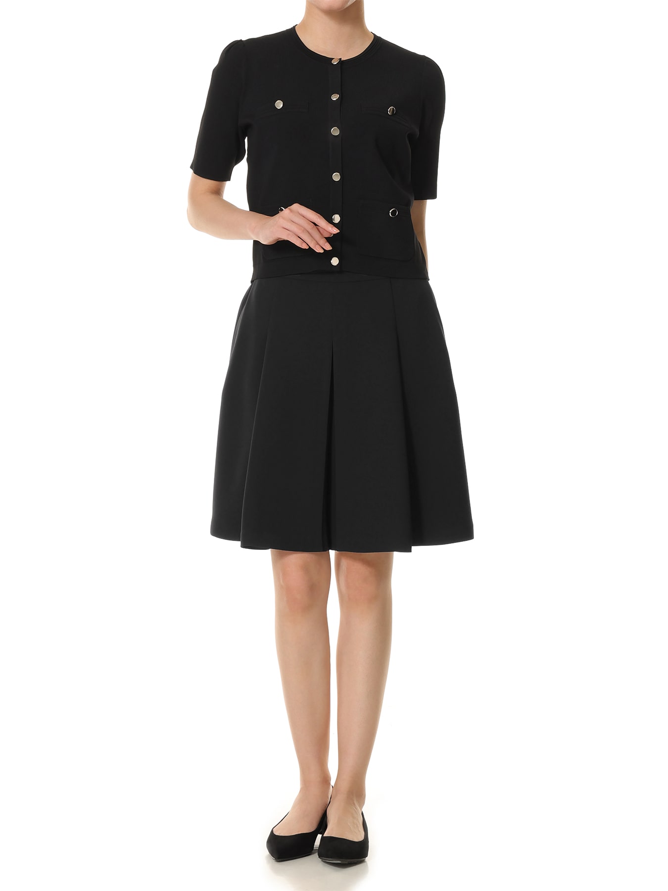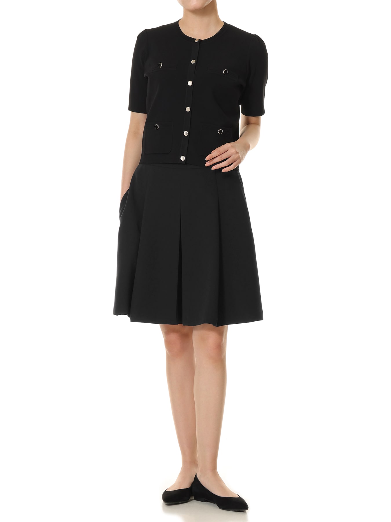 ミニマルなフォルムに上品なアクセントを効かせた、エレガントなニットカーディガン。フロントに並ぶメタルボタンが洗練された輝きを添え、シンプルな中にも凛とした存在感を放ちます。さらに、襟ぐりとポケット部分に施された繊細なピンタックデザインが、さりげない立体感と奥行きをプラスし、細部までこだわりを感じさせる一着に仕上がっています。コンパクトなシルエットが全体をすっきりとまとめ、女性らしいバランスの美しい着こなしを叶えてくれます。オンスタイルには、タイトスカートやセンタープレスパンツと合わせて、きちんと感のある洗練された装いに。ボタンを閉じてトップスとして着用すれば、よりミニマルで端正な印象を演出でき、ジャケットインにもおすすめです。オフシーンでは、デニムや軽やかなフレアスカートと合わせて、程よく力の抜けた大人のきれいめカジュアルに。ワンピースなどにはフロントを開けて羽織りとして取り入れることで、スタイリングに抜け感が生まれ、デイリーにも取り入れやすい一着として活躍します。シンプルながらもディテールで魅せるデザインが、オンにもオフにも寄り添い、幅広いシーンで上品なスタイルへと導いてくれるニットカーディガンです。 ・ご家庭で手洗いが可能 ・UVカット加工素材 ・WHITEは透け感あり ・ジャストフィット。通常サイズをおすすめします。 ・<WHITE>モデル身長171cm/バスト82cm/ウエスト60cm/ヒップ88cm/38サイズ着用 ・<BLACK>モデル身長170cm/バスト82cm/ウエスト59cm/ヒップ87cm/38サイズ着用 【お問い合わせ品番】 A747-006