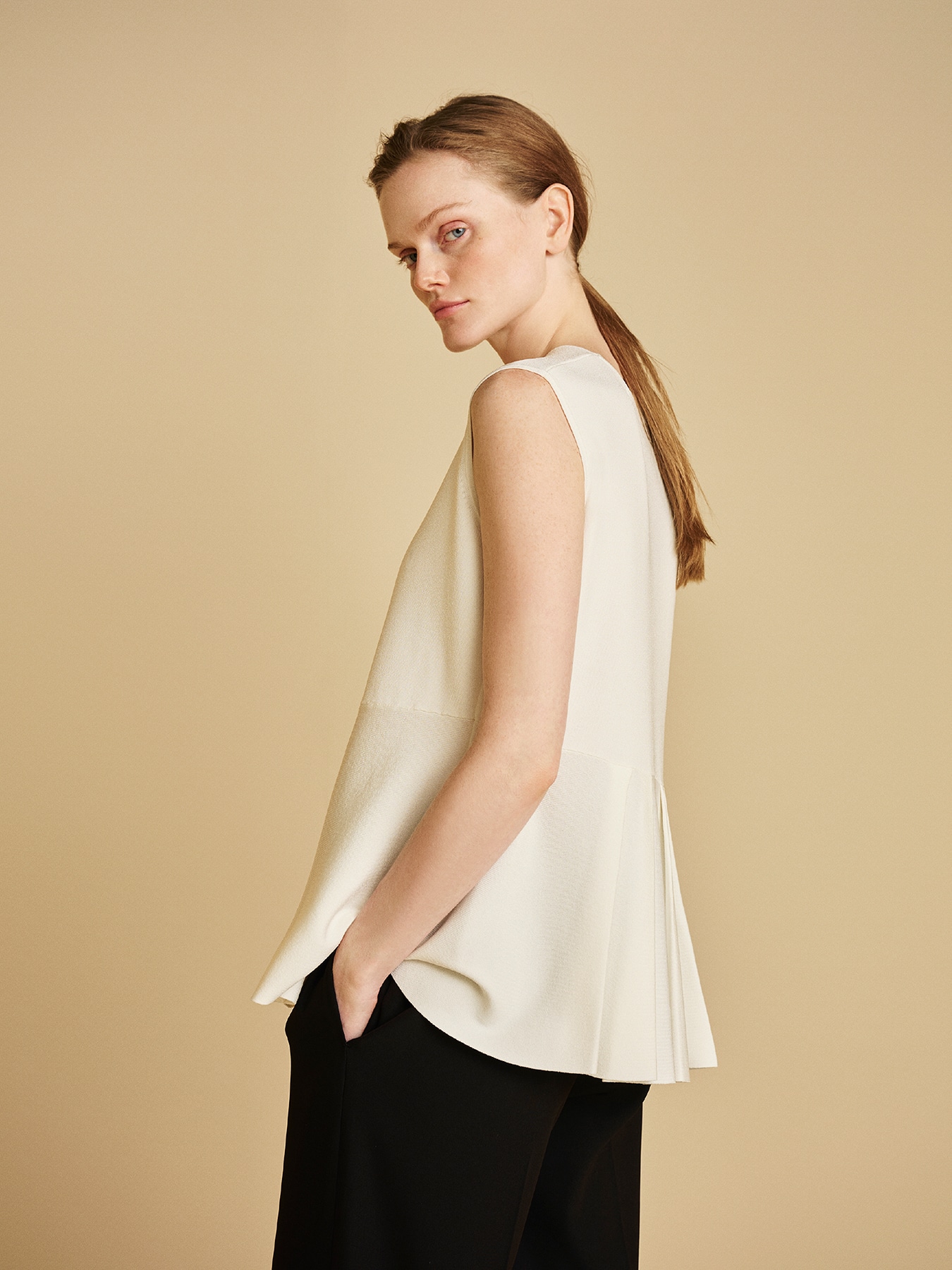 構築的なシルエットが印象的な、エレガントなペプラムニットジレ。すっきりとしたVネックがデコルテを美しく見せ、シャープで洗練された印象を与えます。ウエスト位置から広がるペプラムデザインが立体感と動きを生み、女性らしいメリハリのあるシルエットを演出。シンプルながらも一枚でスタイリングの主役になる、モード感漂う一着です。オンスタイルには、細身のテーパードパンツやセンタープレスパンツと合わせることで、縦のラインを強調した端正な着こなしに。シンプルなジャケットやカーディガンを羽織れば、きちんと感のある洗練されたオフィススタイルが完成します。足元はヒールで引き締めることで、よりシャープで都会的な印象に。オフスタイルには、ワイドパンツやデニムと合わせてリラックス感のある着こなしにシフト。一枚でさらりと着こなすことで、抜け感のある軽やかなスタイリングをお楽しみいただけます。フラットシューズやサンダルを合わせれば、エレガントさを残しつつも程よくカジュアルダウンした大人のデイリースタイルに仕上がります。 ・ご家庭で手洗いが可能 ・WHITEは透け感あり ・スチーム可能 ・ジャストフィット。通常サイズをおすすめします。 ・モデル身長171cm/バスト82cm/ウエスト60cm/ヒップ88cm/38サイズ着用 【お問い合わせ品番】 A747-010