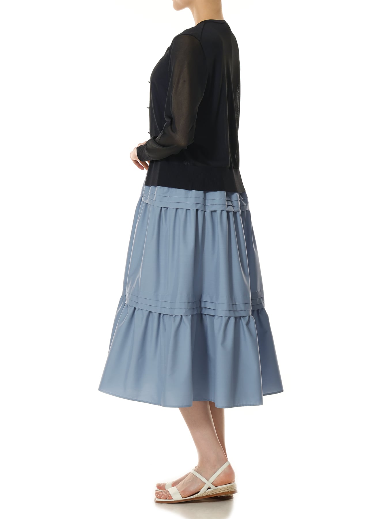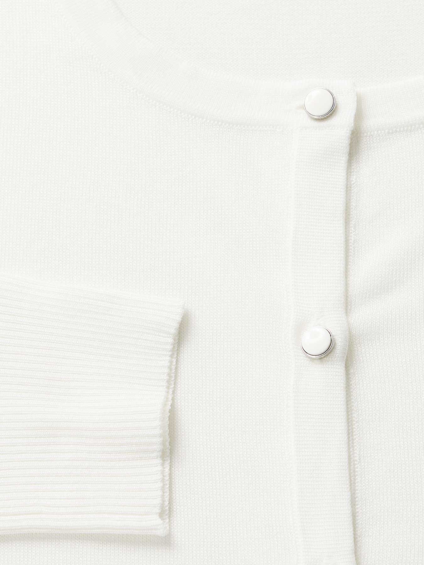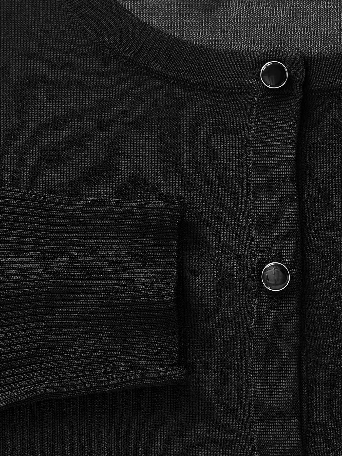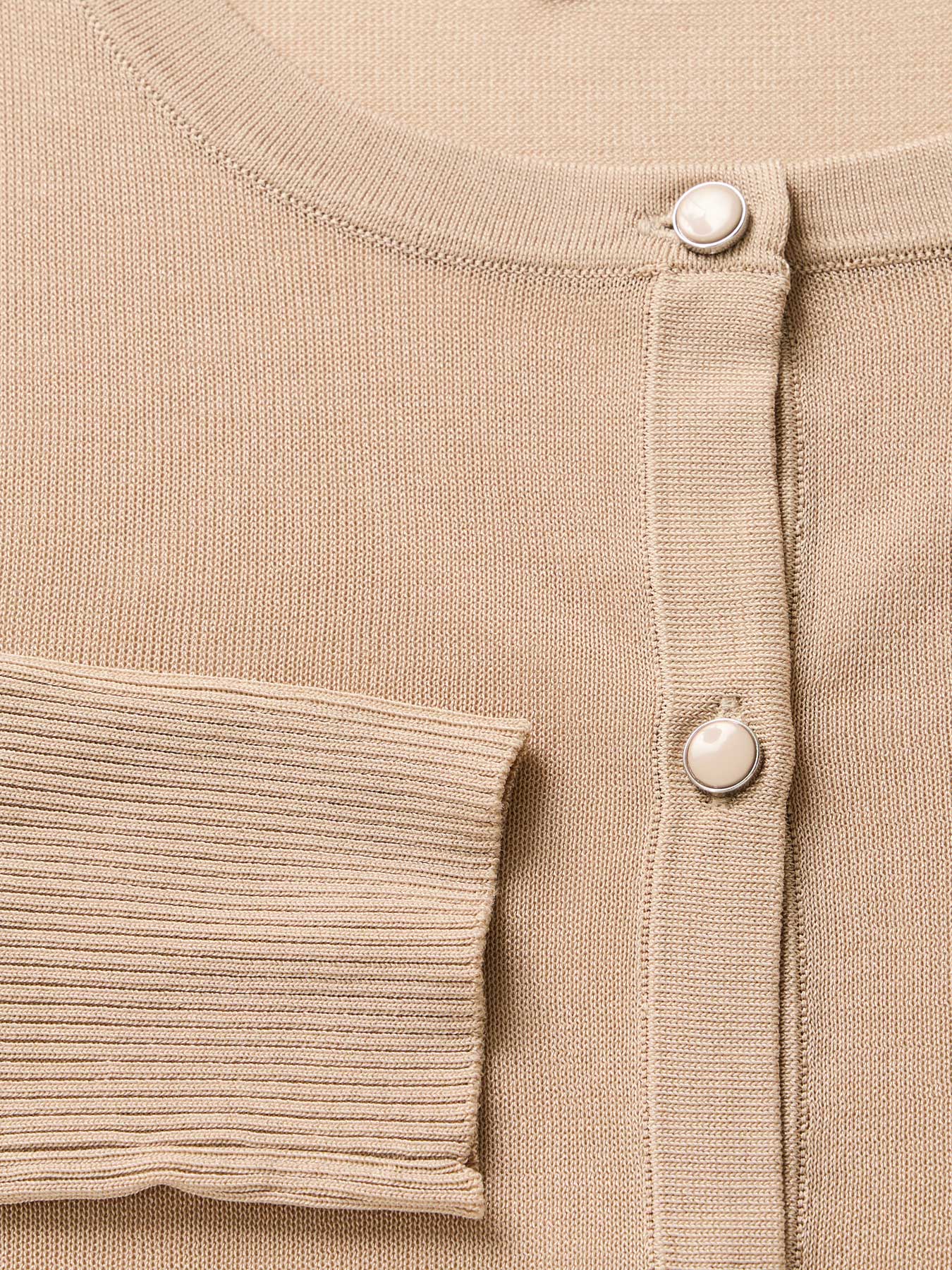 繊細な透け感が美しいシアー素材で仕立てた、軽やかで上品な印象のニットカーディガン。ポリエステル×レーヨン×ナイロンの混紡素材ならではのさらりとした肌離れの良さと、しなやかな風合いが心地よく、暑い季節にも快適にお召しいただけます。ミニマルなクルーネックデザインに、同系色で統一したボタンをあしらうことで、洗練されたエレガントな表情に。透け感がほどよい抜け感を生み、シンプルながらも軽やかな存在感を放ちます。コンパクトなシルエットはバランスが取りやすく、羽織りとしてはもちろん、ボタンを留めてトップスとしても活躍します。オンシーンには、センタープレスパンツやタイトスカートと合わせて、きちんと感のあるクリーンなスタイリングに。ワンピースの上に羽織れば、女性らしさを引き立てながら上品にまとまります。オフシーンには、デニムやワイドパンツと合わせてリラックス感のあるきれいめカジュアルに。ノースリーブトップスやキャミソールとレイヤードすることで、シアー素材ならではの軽やかさを活かした着こなしもお楽しみいただけます。シンプルでありながら素材の魅力が際立つ、シーズンスタイルに寄り添う一着です。 ・ご家庭で手洗いが可能 ・透け感あり ・スチーム可能 ・ジャストフィット。通常サイズをおすすめします。 ・(BEIGE)モデル身長171cm/バスト82cm/ウエスト60cm/ヒップ88cm/38サイズ着用 ・(NAVY)モデル身長173cm/バスト83cm/ウエスト59cm/ヒップ85cm/38サイズ着用 【お問い合わせ品番】 A747-015