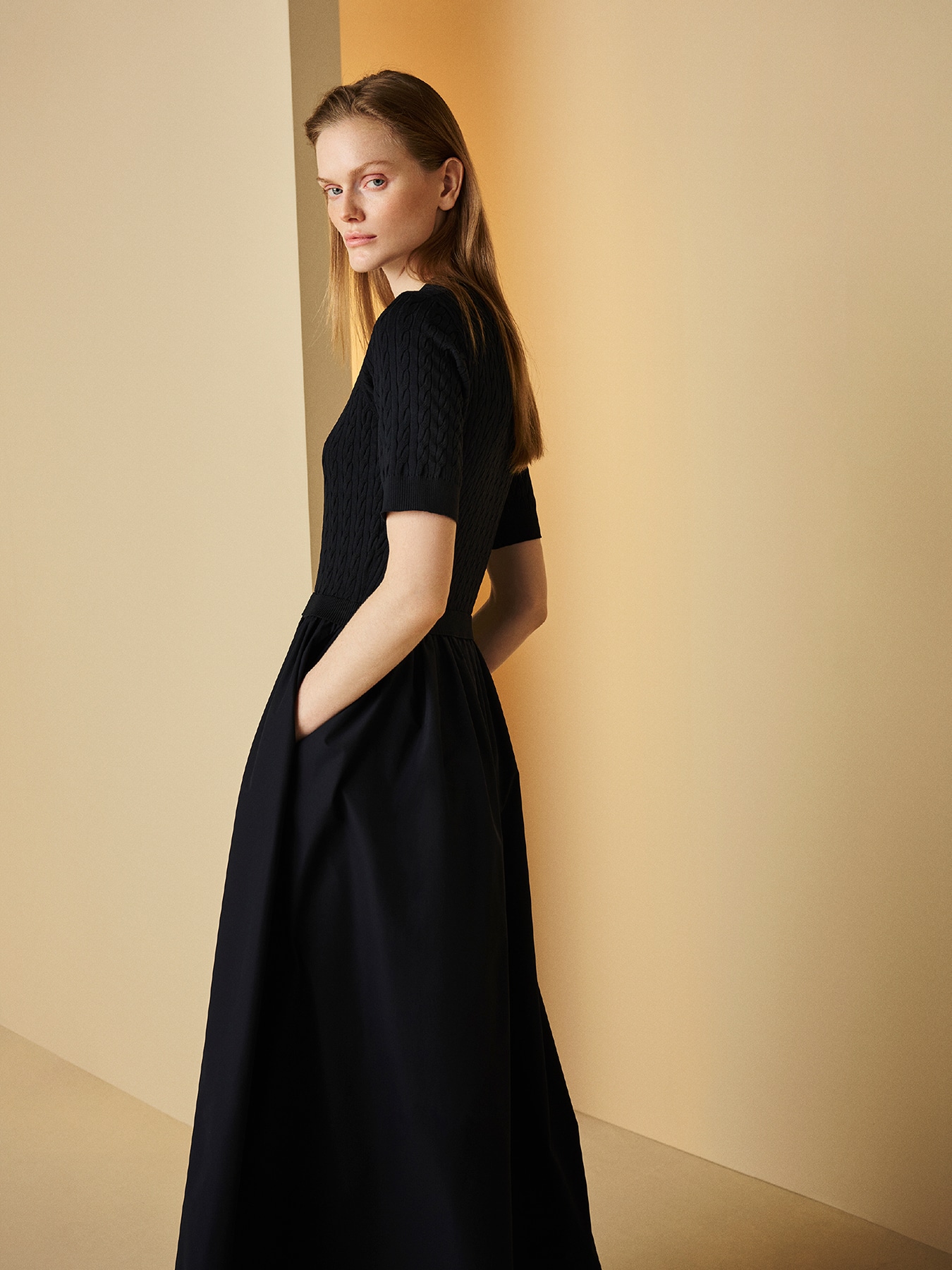 上身頃に繊細なケーブル編みを施したレーヨンベースのニットと、軽やかで程よいハリ感を持つポリエステル素材のスカートをドッキングしたワンピース。しなやかなニットの柔らかなフィット感と、スカートのふんわりと広がる立体的なフォルムが美しいコントラストを生み出し、一枚でメリハリのあるエレガントなシルエットを叶えてくれます。上品な編み柄がさりげない表情を添えながら、ミニマルなデザインに奥行きを与え、洗練された大人のスタイルへと導く一着です。デイリーシーンには、フラットシューズやミニバッグを合わせて、程よくリラックス感のあるスタイルに。ニットの柔らかな質感が親しみやすさを演出しつつ、スカートの美しい広がりがさりげなく華やぎを添えてくれます。お出かけやランチシーンには、ヒールサンダルや華奢なアクセサリーをプラスすることで、より女性らしく洗練された印象へ。動くたびに揺れるスカートのシルエットが、上品な存在感を引き立てます。シーンに合わせて幅広い着こなしが楽しめる優秀な一着です。 ・ニット部分:UVカット加工素材 ・スチーム可能 ・ジャストフィット。通常サイズをお勧めします。 ・モデル身長171cm/バスト82cm/ウエスト60cm/ヒップ88cm/38サイズ着用 【お問い合わせ品番】 A747-021