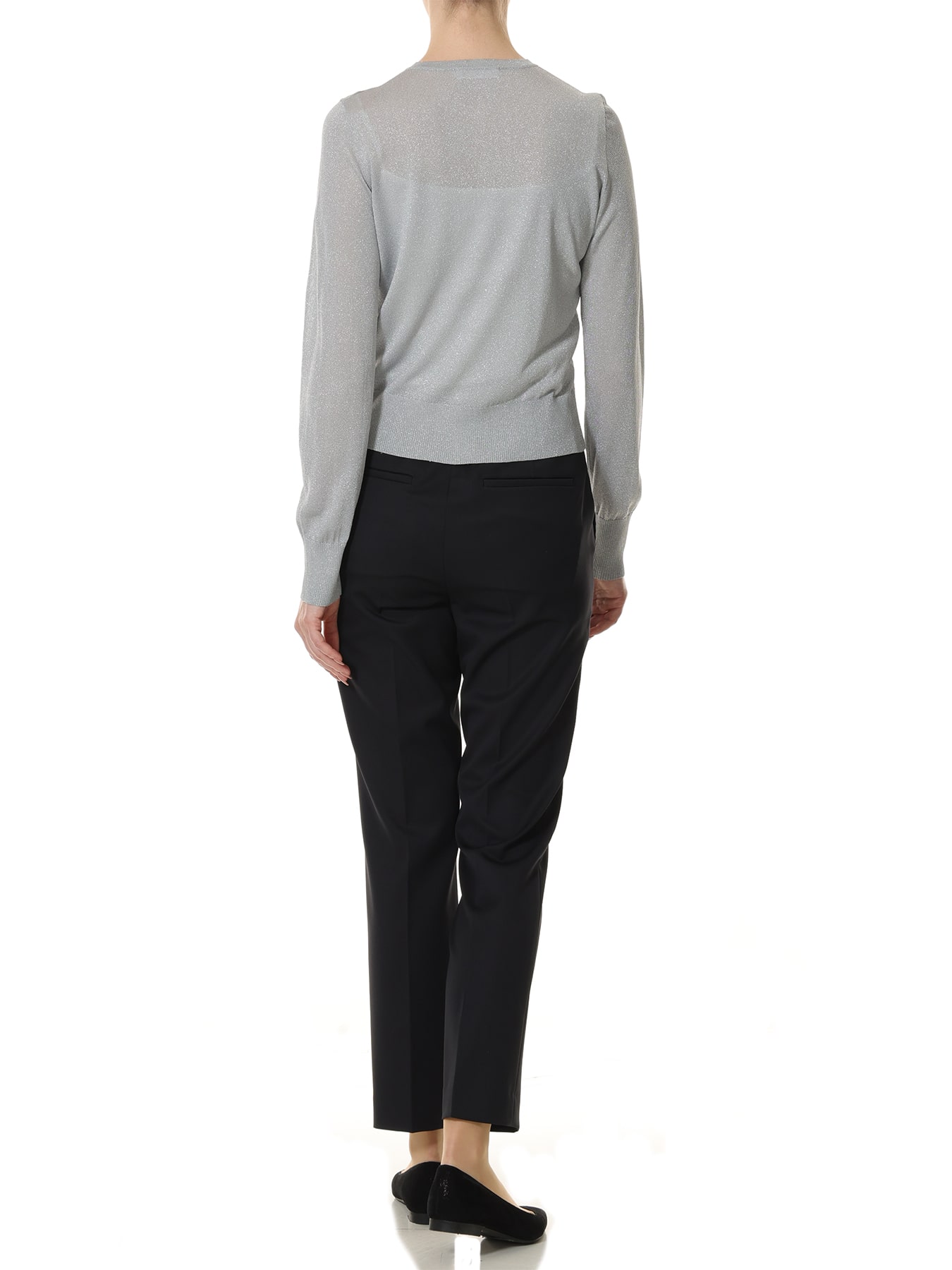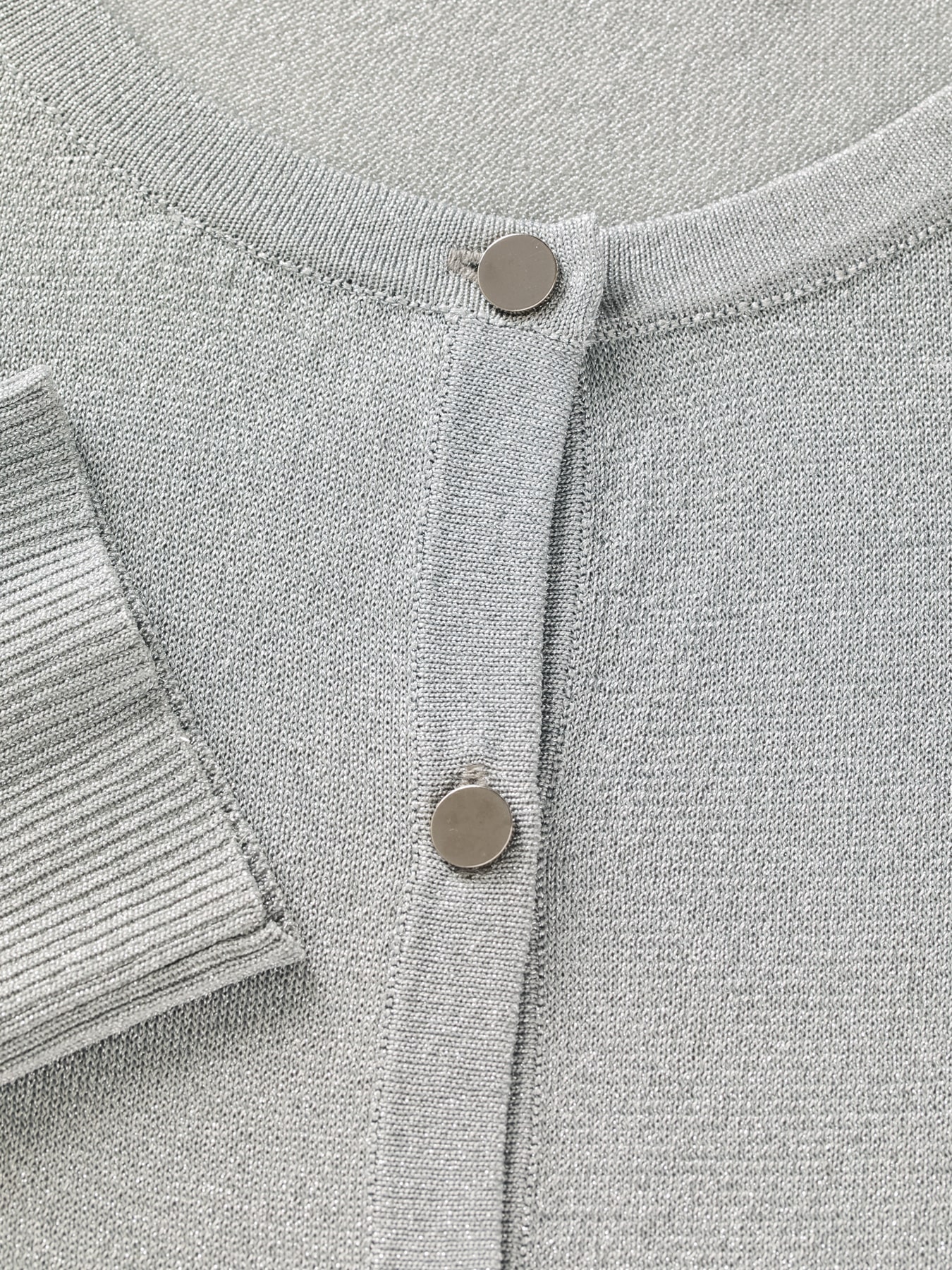 上品な輝きを纏うシルバーのラメ素材が、シンプルなデザインにさりげない華やぎを添えるクルーネックカーディガン。繊細にきらめくラメが光を受けて美しく映え、装い全体をエレガントに引き立ててくれます。ベーシックなシルエットに仕上げることで、デイリーからきちんとしたシーンまで幅広く取り入れていただける一着に。コンパクトな丈感とすっきりとしたネックラインが、女性らしく洗練された印象を演出します。フロントのボタンデザインもアクセントとなり、シンプルながらもさりげない存在感を放ちます。オンスタイルには、センタープレスパンツやタイトスカートと合わせたクリーンなコーディネートがおすすめです。ラメの上品な輝きが程よい華やかさを添え、オフィスやお食事シーンにもふさわしい洗練された印象に仕上がります。ボタンを留めてプルオーバー風に着こなすことで、よりきちんと感のある装いもお楽しみいただけます。オフスタイルでは、シンプルなアイテムにさらりと羽織るだけで、ラメの輝きがコーディネートにアクセントを添え、こなれ感のあるスタイルが完成します。ワンピースの上に軽く羽織るスタイリングも、女性らしい柔らかな雰囲気を演出し、幅広いシーンで活躍する万能な一着です。 ・ご家庭で手洗い可能 ・透け感あり ・スチーム可能 ・ジャストフィット。通常サイズをお勧めします。 ・モデル身長171cm/バスト82cm/ウエスト60cm/ヒップ88cm/38サイズ着用 【お問い合わせ品番】 A747-022