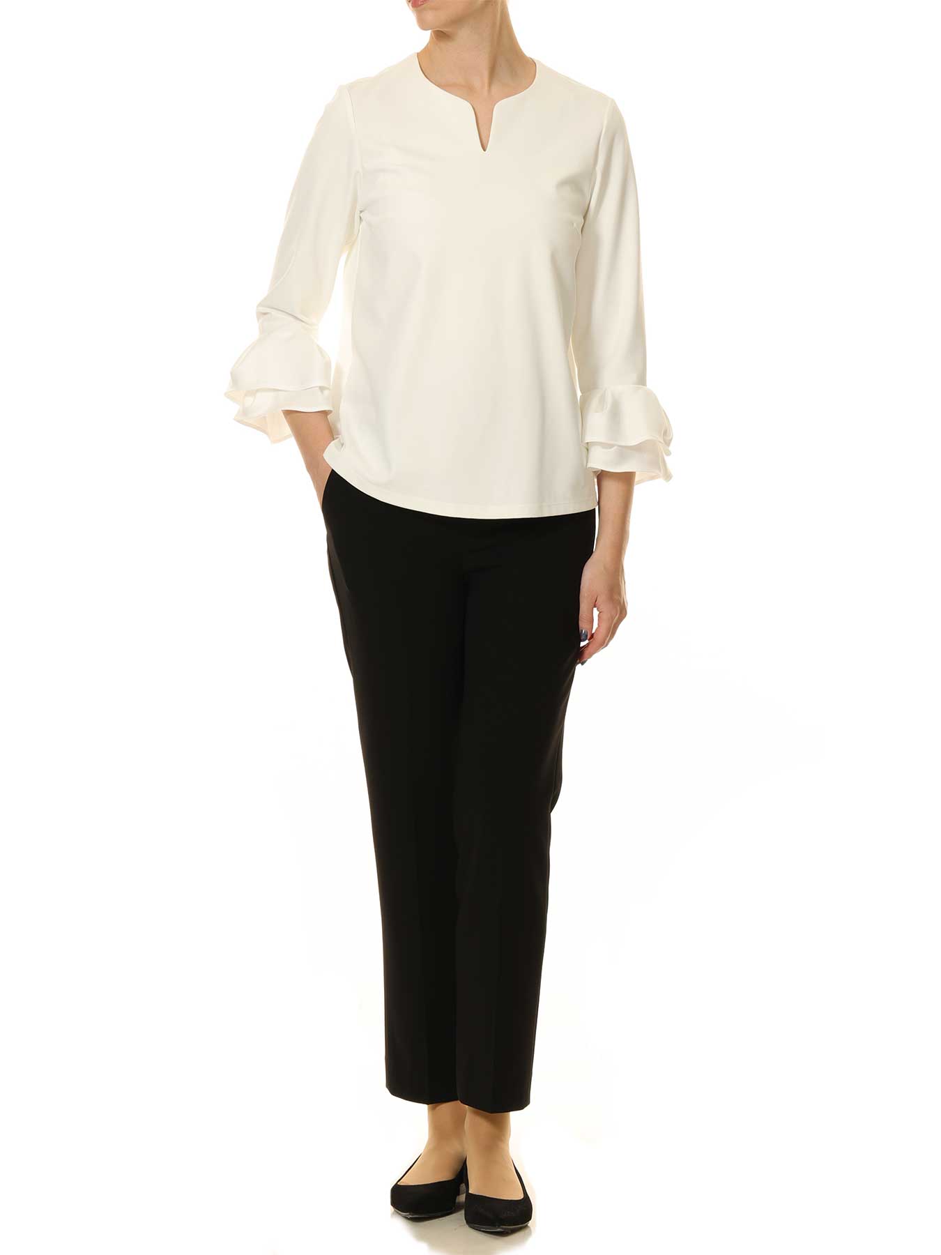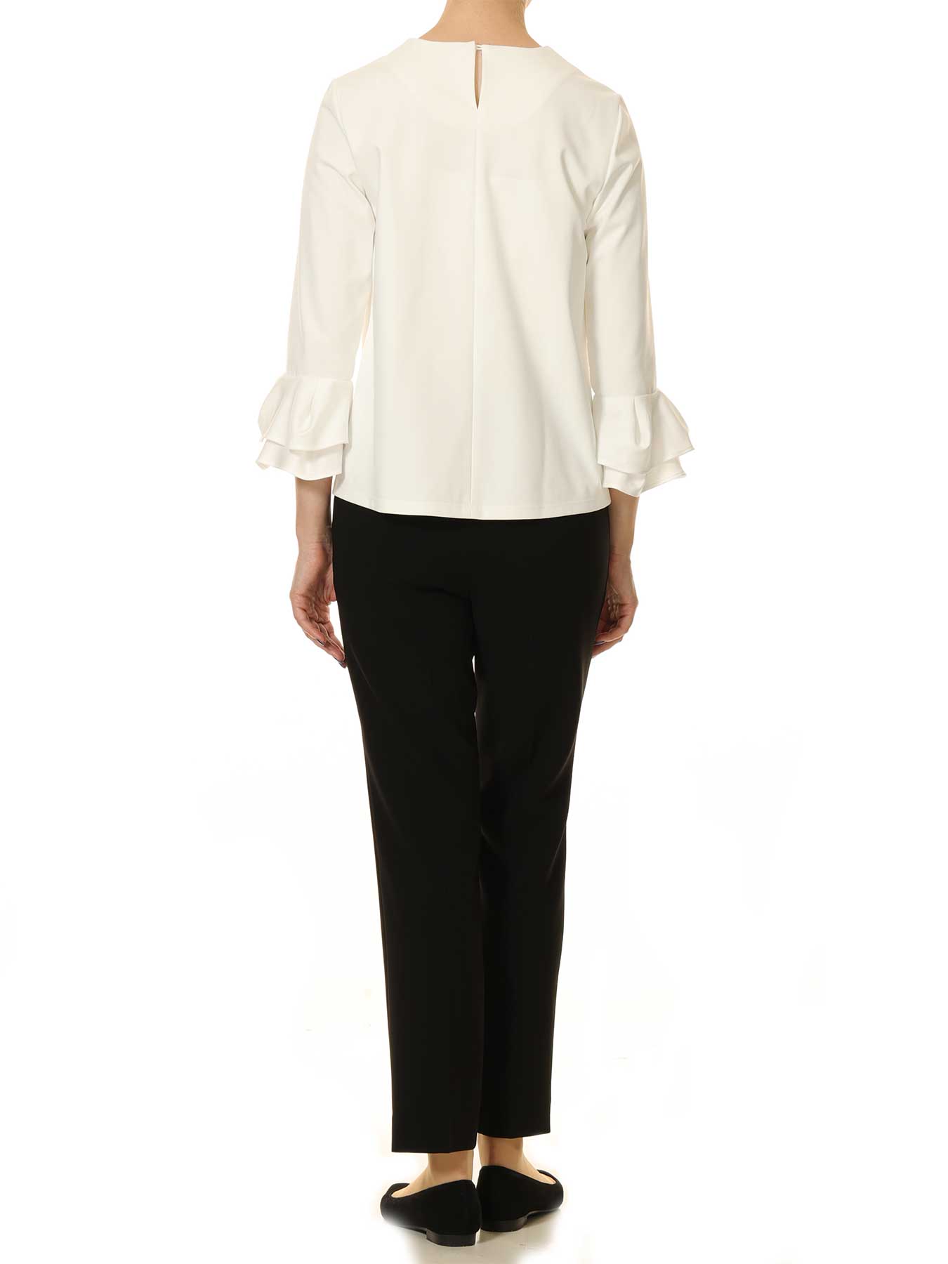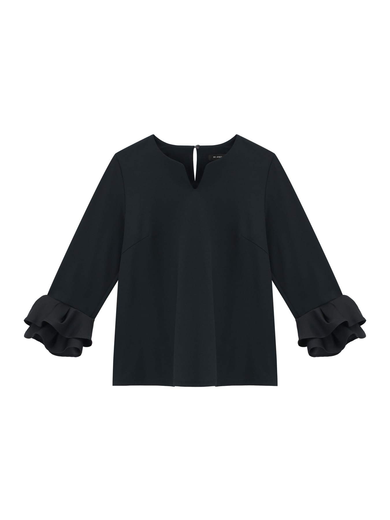 カフスに施したティアードデザインが、手元にさりげない華やぎを添えるエレガントなトップス。シンプルな身頃に対し、動きのある袖口ディテールが女性らしさを引き立て、1枚で着映えするバランスに仕上げています。素材にはストレッチ性の高いポンチ素材を使用しており、きちんと感のある見え方ながらも快適な着心地を実現。ご家庭で手洗い可能な点も、デイリーに取り入れやすい嬉しいポイントです。テーパードパンツやタイトスカートと合わせて品よくまとめれば、オフィスやきれいめなお出かけにも対応する万能アイテムです。 ・ご家庭で手洗い可能 ・WHITEは透け感あり ・バック襟元スリット開き ・ジャストフィット。通常サイズをお勧めします。 【お問い合わせ品番】 A847-001
