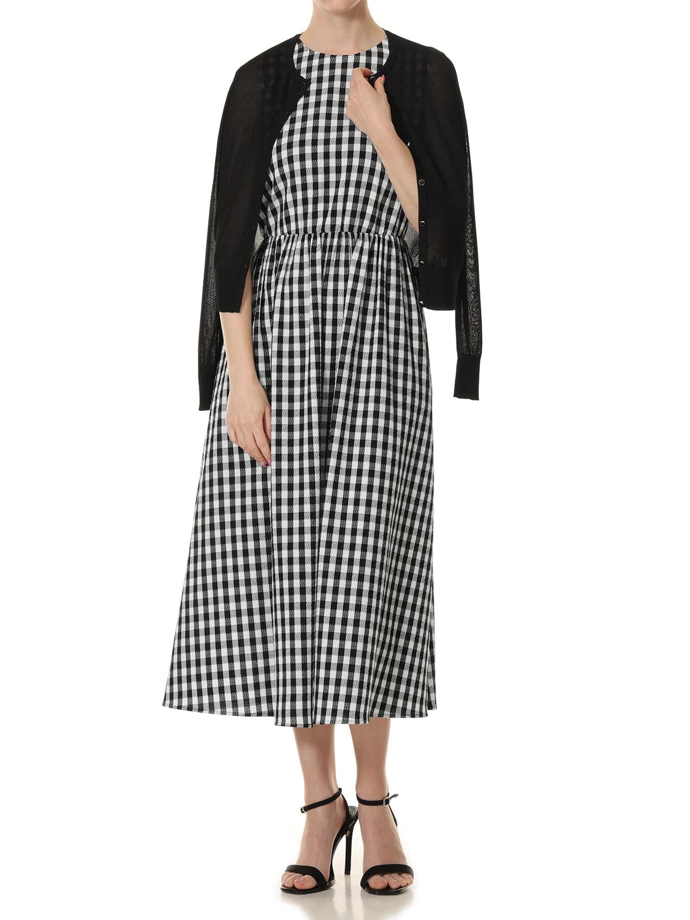 軽やかなギンガムチェックが印象的な、エレガントなノースリーブワンピース。ふくらみのある表情豊かな素材を使用し、空気を含んだような軽やかさとやわらかな立体感が、シンプルなシルエットに奥行きを与えます。コンパクトなトップス部分と、程よく広がるスカートのバランスが美しく、自然と女性らしいシルエットを演出。ウエストにはゴムを配しており、締め付け感のない快適な着心地と、さりげないフィット&フレアラインを両立しています。モノトーンのギンガムチェックは甘さを抑え、上品で洗練された印象に導きます。デイリーシーンには、フラットサンダルやかごバッグを合わせて、軽やかでリラックス感のあるスタイルに。カーディガンやシアーな羽織りをプラスすれば、冷房対策を兼ねた上品なレイヤードも楽しめます。お出かけやお食事のシーンには、ヒールサンダルやパンプスを合わせて、より女性らしく華やかな印象に。小ぶりのバッグやアクセサリーを添えることで、シックで洗練されたスタイリングが完成します。一枚で着映えしながら、シーンに応じて印象を変えられる、季節感あふれる一着です。 ・やや透け感あり ・ポケットあり ・バックコンシールファスナー開き ・スチーム可能 ・ジャストフィット。通常サイズをおすすめします。 ・モデル身長171cm/バスト82cm/ウエスト60cm/ヒップ88cm/38サイズ着用 【お問い合わせ品番】 A947-010