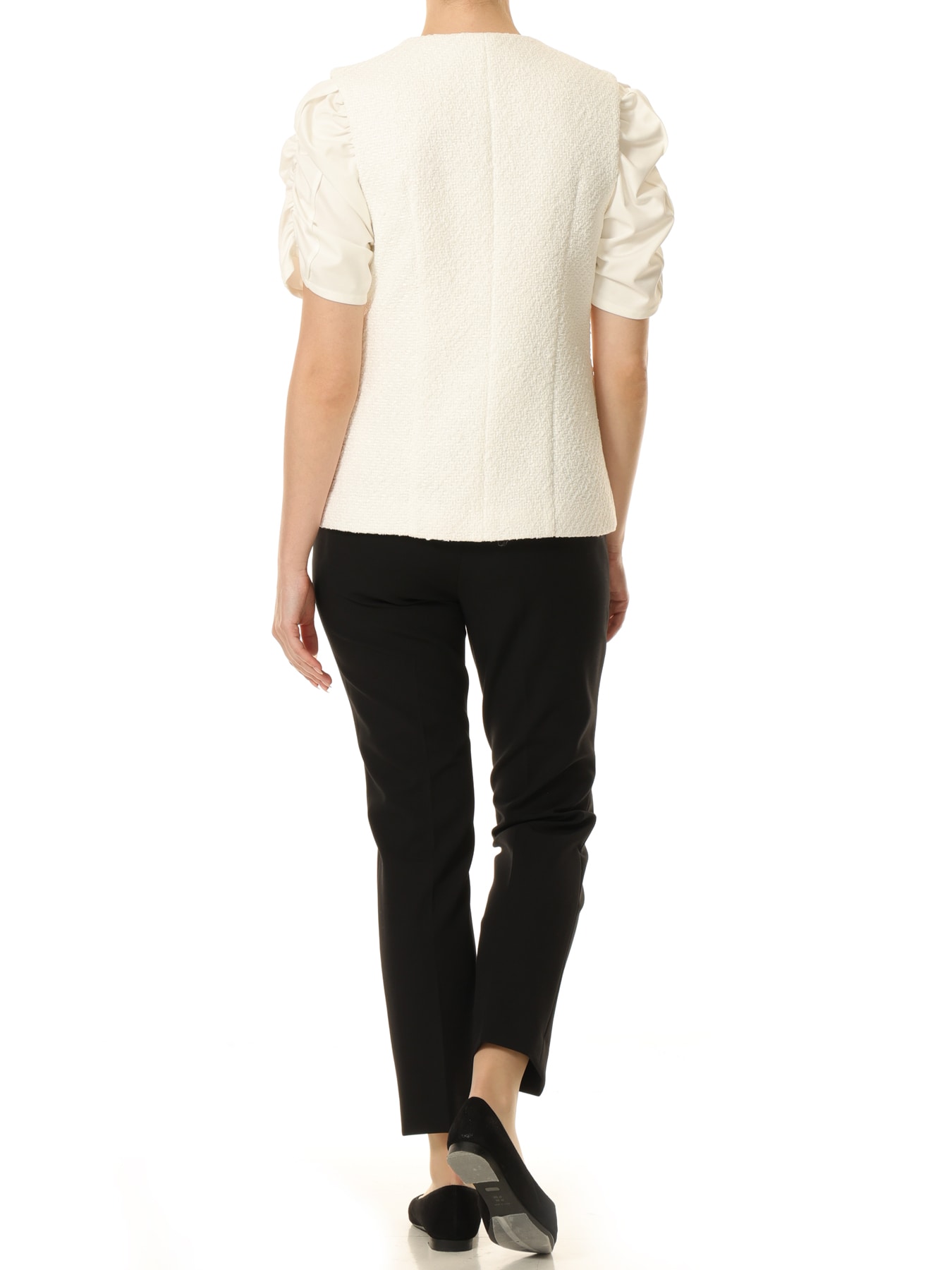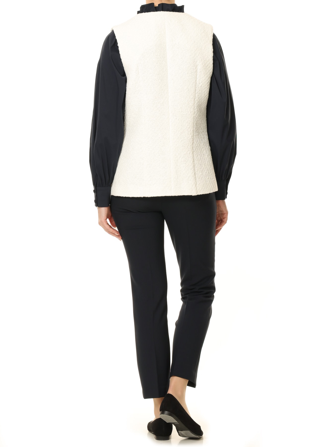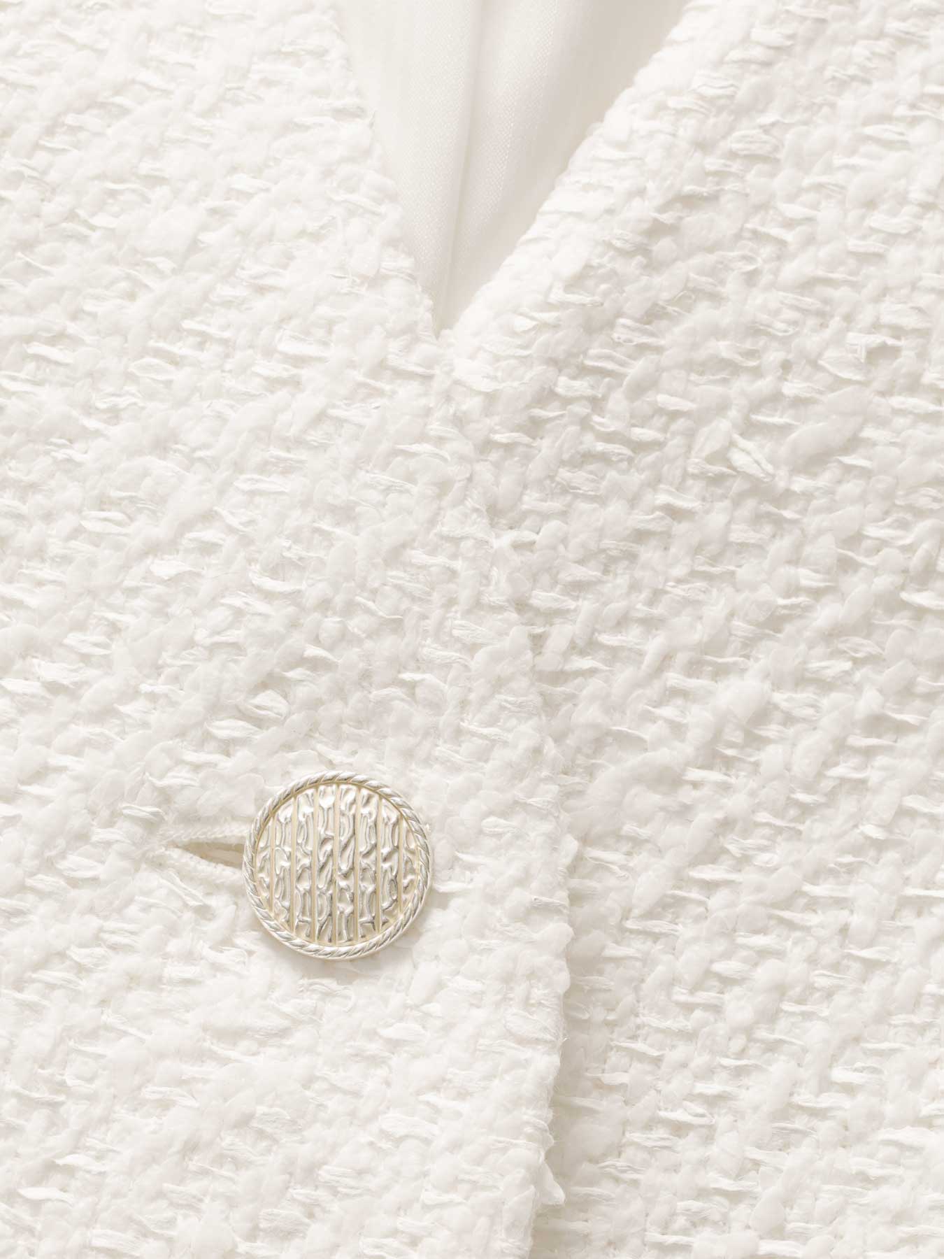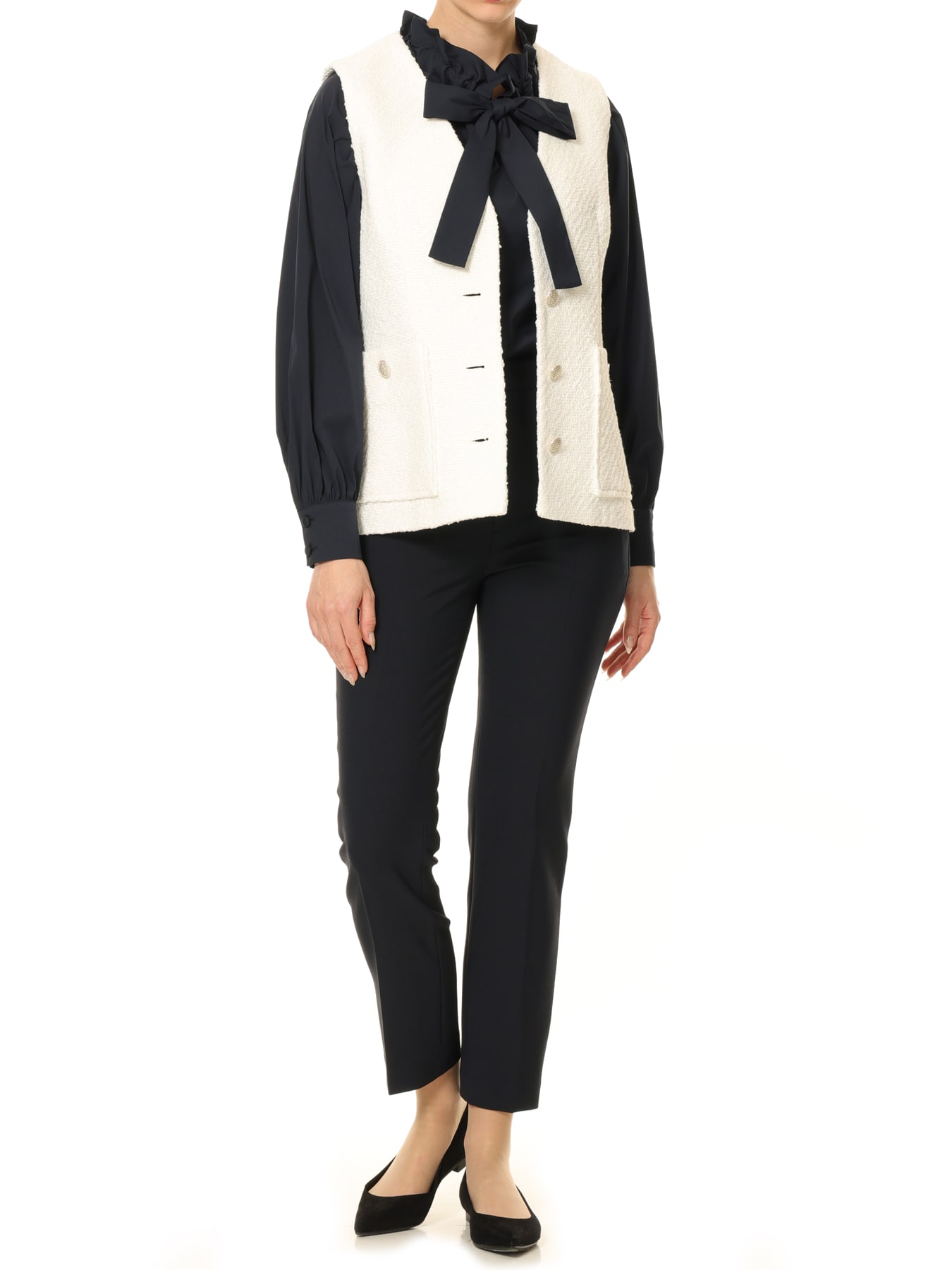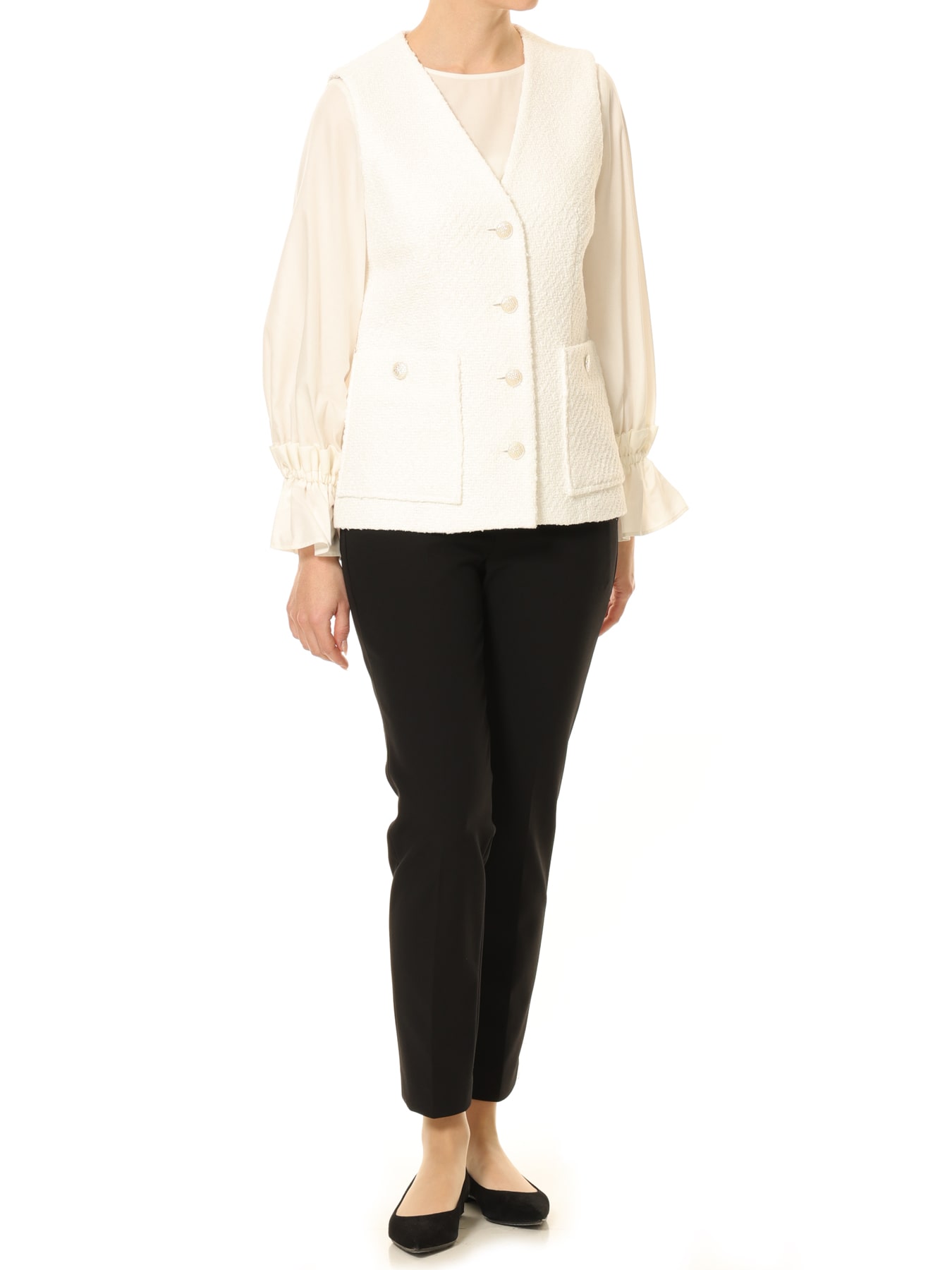スラリットヤーンが織り込まれた立体感のあるツイードが華やかでエレガントな魅力を放つジレ。SILVERのコロンとした丸みのあるボタンが華やかなアクセントに。Vネックがさりげなく小顔効果を叶えてくれるのが嬉しいところで、きちんと感もプラスされます。カットソーやブラウスなどシンプルなコーディネートにプラスしていただくだけで、上品でクラシカルな雰囲気を醸します。ツイード素材なので通勤にもセレモニーアイテムとしてもお召しいただけるアイテムです。 ・裏地あり ・ポケットあり ・スチーム可能 ・ジャストフィット。通常サイズをお勧めします。 ・モデル身長171cm/バスト82cm/ウエスト60cm/ヒップ88cm/Sサイズ着用 【お問い合わせ品番】 C142-002