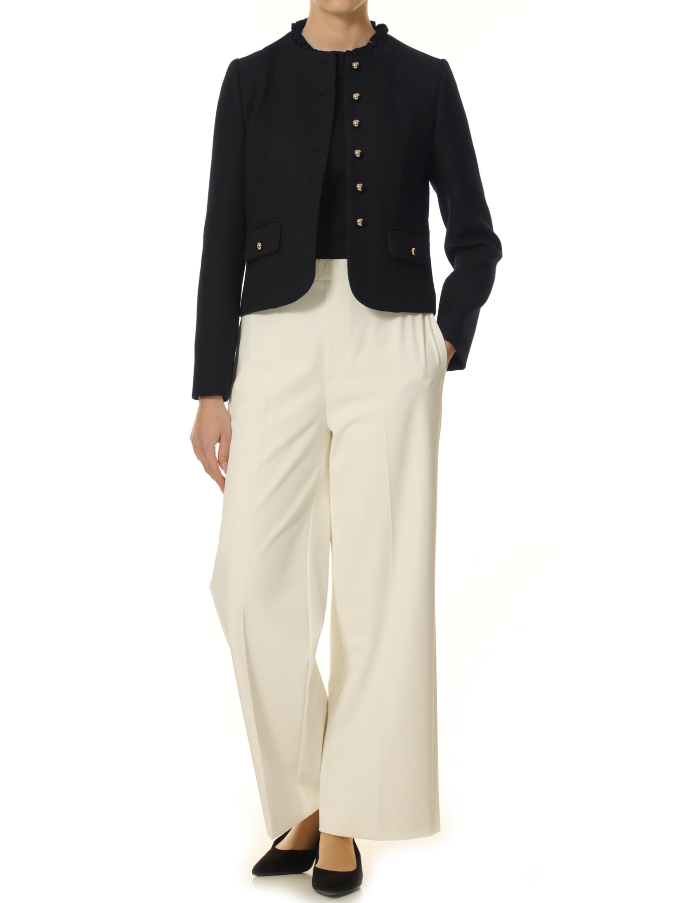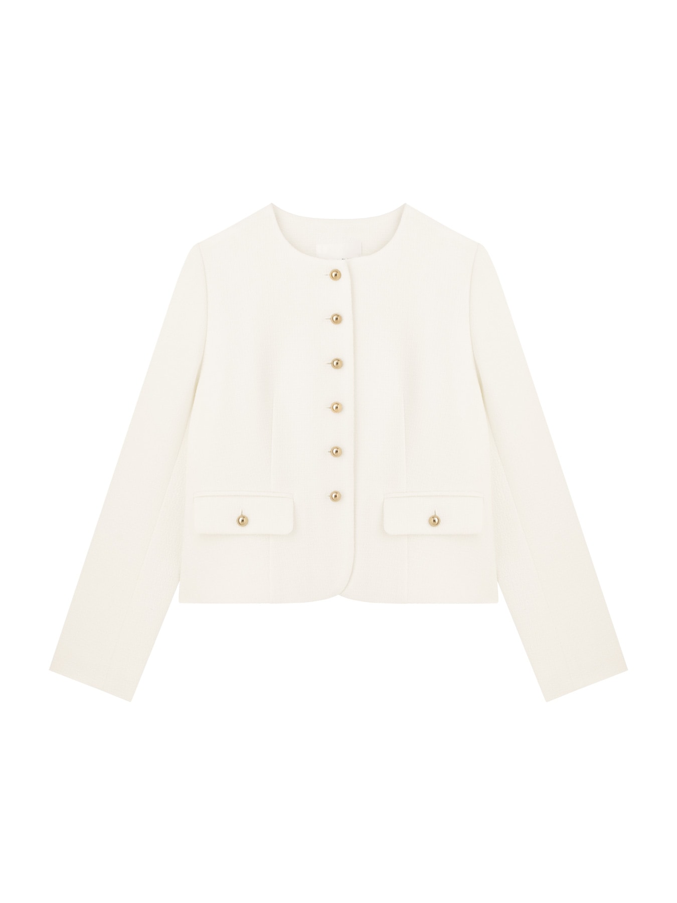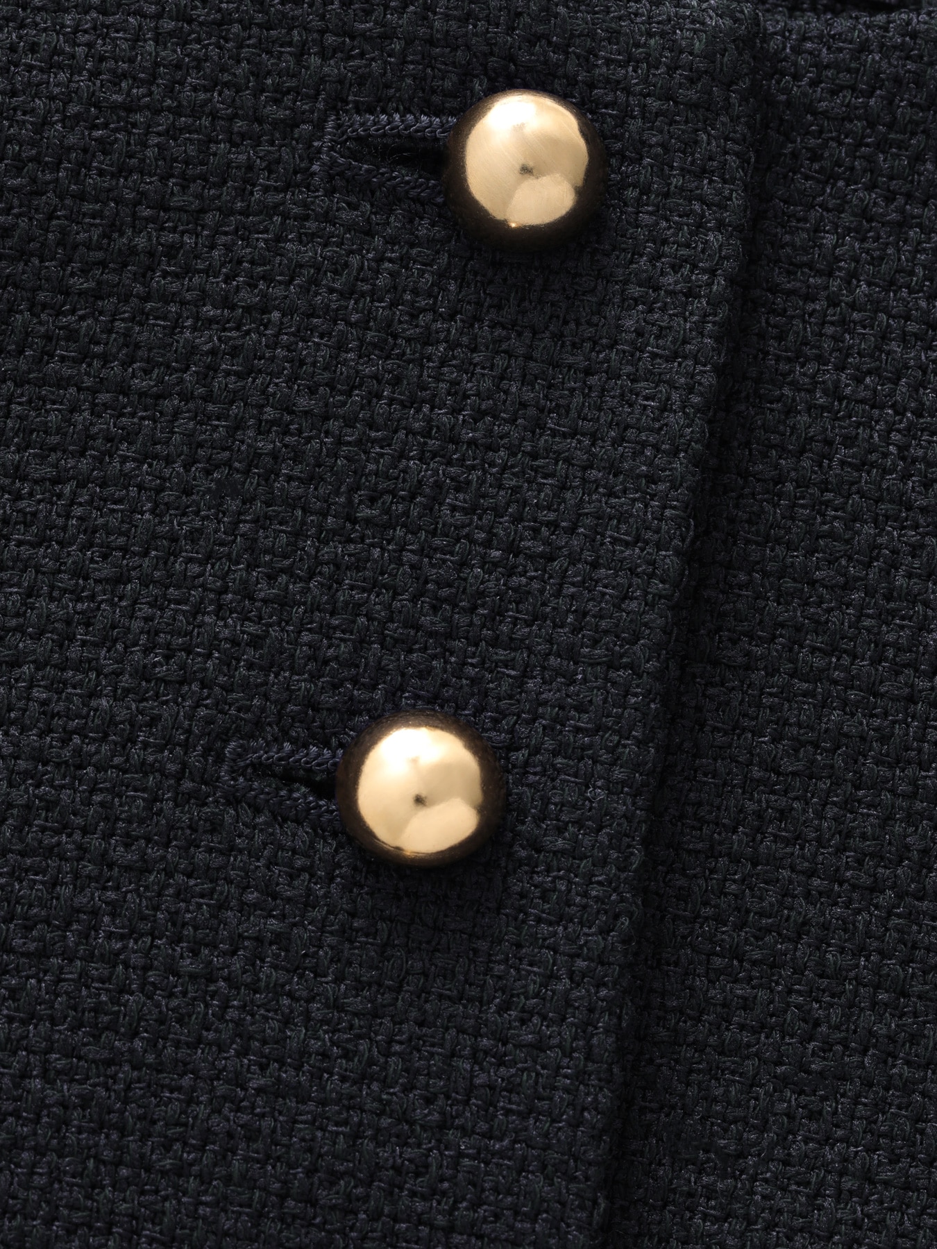 ゴールドボタンがさりげなく輝く、エレガントな佇まいのツイードジャケット。表情のあるツイード素材が上品な存在感を放ち、コンパクトなシルエットが女性らしいバランスを引き立てます。フロントに配したゴールドのボタンがクラシカルなアクセントとなり、フラップポケットのデザインが程よいきちんと感をプラス。羽織るだけで装いを品よく格上げしてくれる一着です。スカートと合わせれば、セレモニーや会食、オフィスシーンにも対応する端正でエレガントなスタイルに。タイトスカートやフレアスカートなど、シルエットを選ばず美しくまとまります。パンツと合わせたスタイリングでは、甘さを抑えた洗練ムードが際立ち、通勤やきれいめなデイリーコーデにも活躍。オンオフを問わず、幅広いシーンで頼れるツイードジャケットです。 ・裏地あり ・フラップポケットあり ・フロントボタン開き ・スチーム可能 ・ジャストフィット。通常サイズをお勧めします。 【お問い合わせ品番】 C147-007