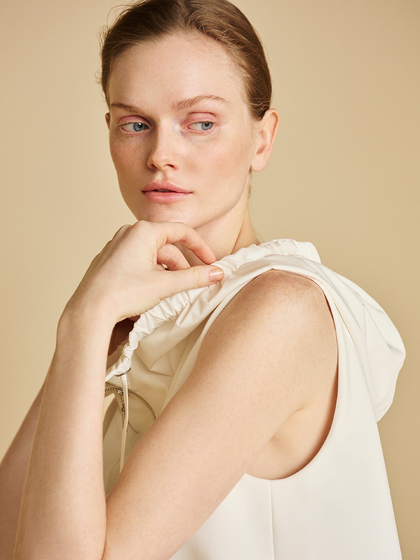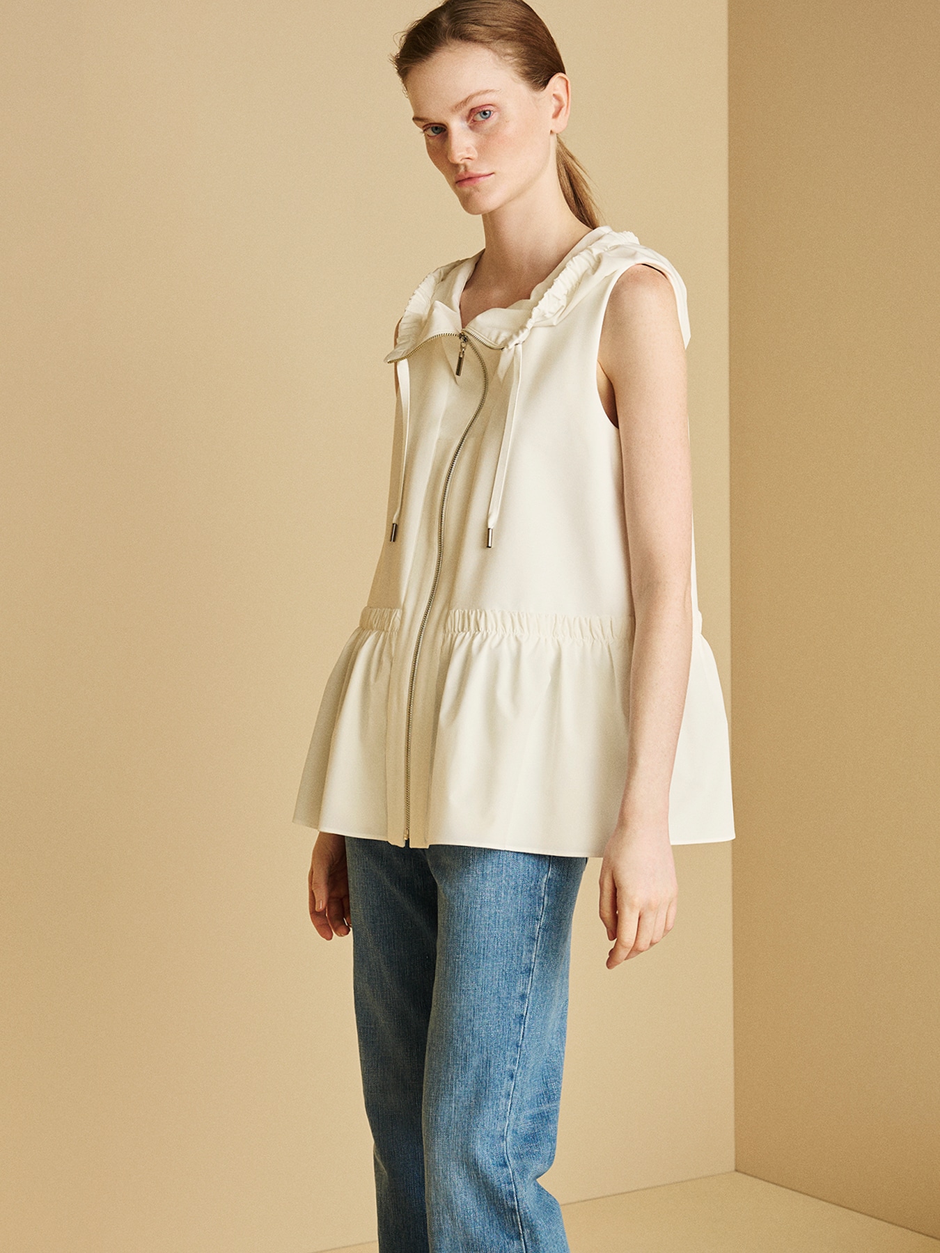 程よい厚みとハリ感のあるコットン×ナイロンベースの素材で仕立てた、エレガントな雰囲気を纏うジップアップジレ。身頃はすっきりとしたシルエットに仕上げながら、裾には薄手でハリのある素材を切り替えることで、立体的で美しいペプラムシルエットを実現しました。フロントのジップアップデザインがスタイリングに程よいモード感を添え、フード周りに寄せたギャザーが柔らかなニュアンスをプラス。カジュアルな要素を取り入れながらも、女性らしい上品さを感じさせる一着に仕上げています。シンプルなニットやカットソーをインナーに合わせることで、洗練された大人の装いが完成します。ボトムには、すっきりとしたテーパードパンツやワイドパンツを合わせて上品にまとめても、デニムやレギンスと合わせて軽やかな大人カジュアルスタイルに仕上げるのもおすすめ。 ・WHITEは透け感あり ・スチーム可能 ・ジャストフィット。通常サイズをおすすめします。 ・モデル身長171cm/バスト82cm/ウエスト60cm/ヒップ88cm/38サイズ着用 【お問い合わせ品番】 A747-007