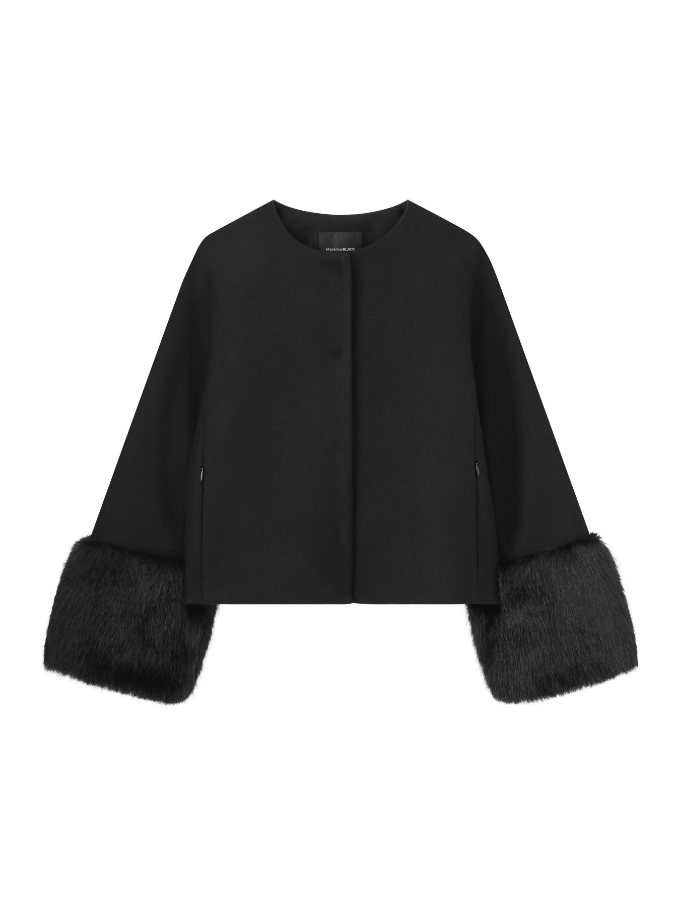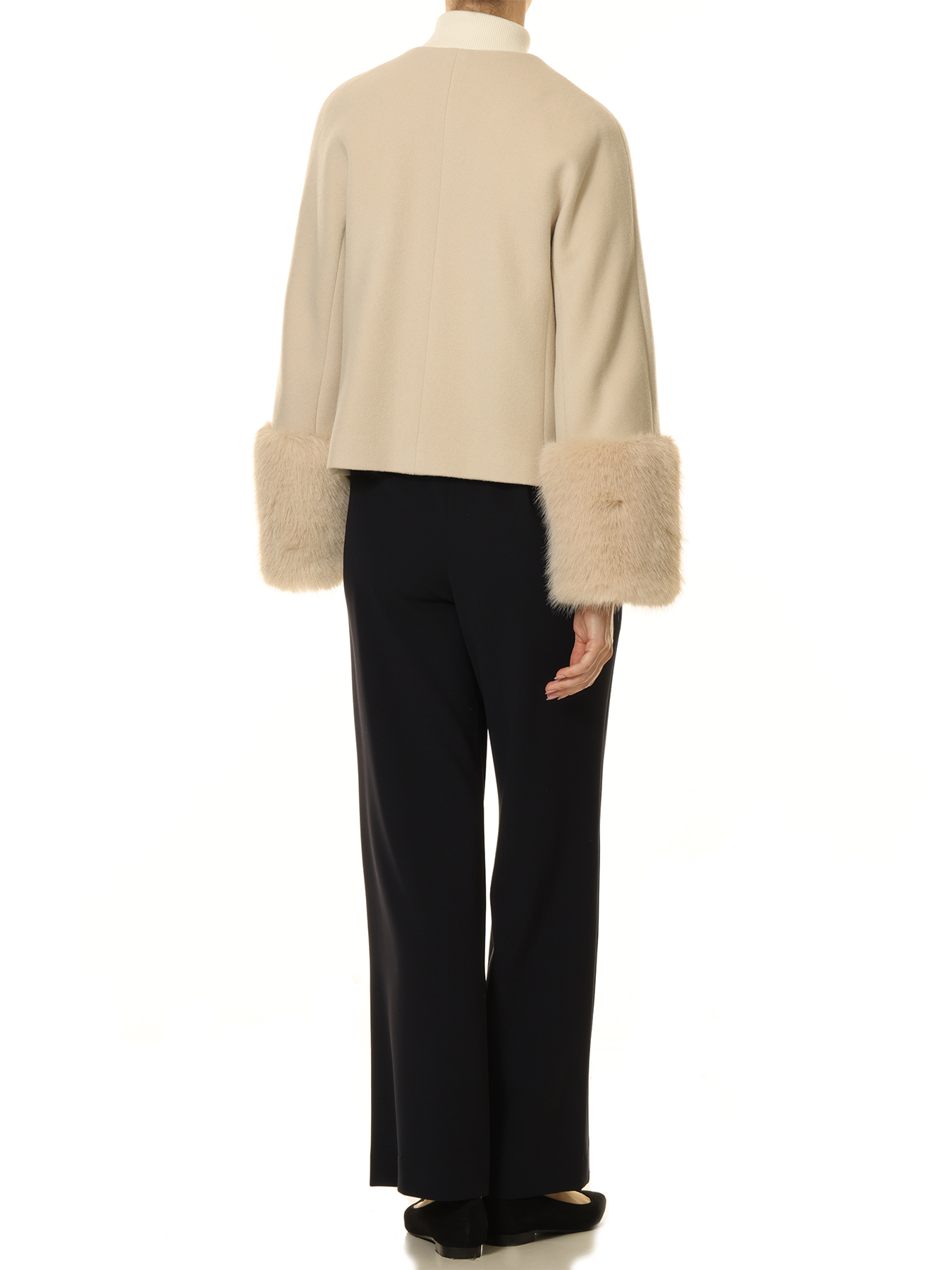 袖口にあしらったボリューム感のあるフェイクファーが、上品で華やかな印象を添えるショートコート。すっきりとしたノーカラーデザインとコンパクトな丈感が、バランスよくスタイルアップを叶えます。ふくらみのあるウール素材の風合いが上質さを引き立て、特別な日のお出かけにもふさわしい一着です。パンツを合わせれば端正でモードな印象に、スカートを合わせれば女性らしくクラシカルな雰囲気に。シンプルな中にリュクスなディテールが光る、冬のワードローブに加えたいエレガントコートです。 ・裏地あり ・ポケットあり ・フロントスナップボタン開き ・ファー部分取り外し不可 ・ジャストフィット。通常サイズをお勧めします。 【お問い合わせ品番】 LIGHT BEIGE:C246-011 BLACK:C246-012