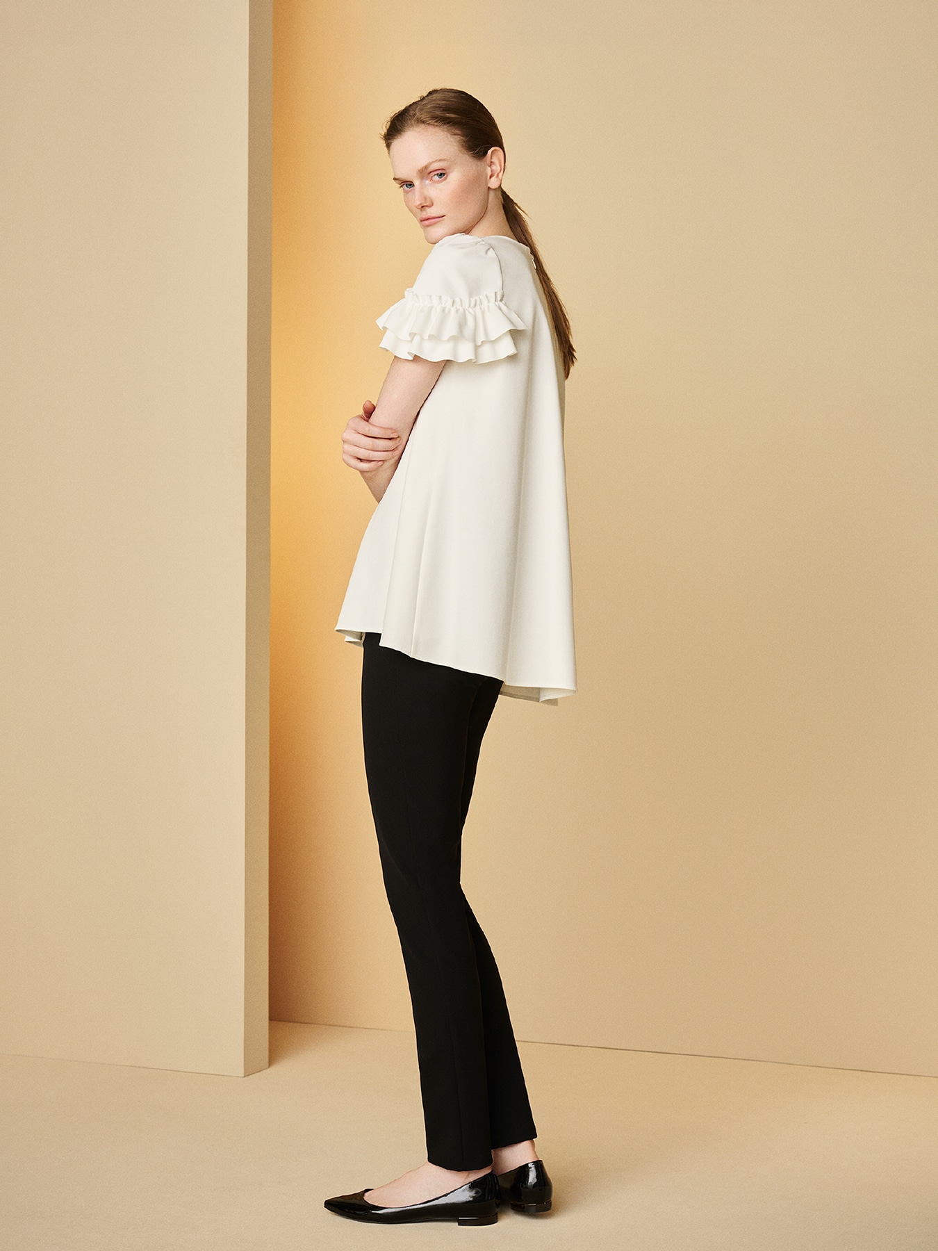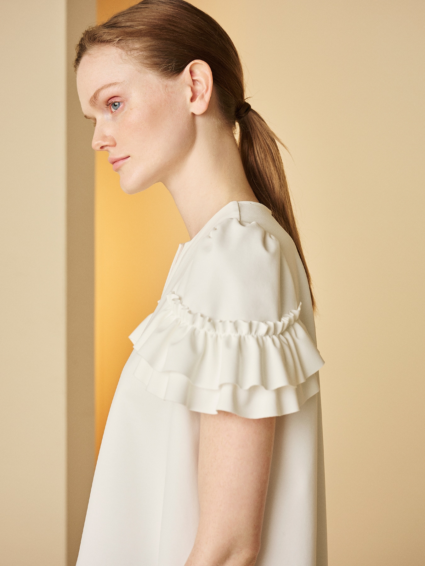フレンチスリーブデザインになった袖口にあしらわれた立体的なフリルが印象的な、エレガントな佇まいのブラウス。すっきりと開いたキーネックが顔まわりをシャープに見せ、甘さのあるディテールと洗練されたバランスを叶えてくれる一枚です。素材にはストレッチ性に優れたポンチ素材を使用し、しなやかな着心地と美しいシルエットを両立。UVカット機能と接触冷感機能を備えているため、気温が高くなる季節にも快適にお召しいただけます。さらにご家庭で手洗いが可能なのも、デイリーに取り入れやすい嬉しいポイントです。後ろ身頃をやや長めに設計したフレアシルエットは、動くたびにやさしく揺れ、自然と体のラインをカバーしながら女性らしいニュアンスを添えてくれます。お仕事シーンでは、テーパードパンツやセンタープレスパンツと合わせてきちんと感のある装いに仕上げれば、上品で信頼感のあるスタイルが完成します。タイトスカートを合わせると、袖のフリルが程よい華やぎを添え、ジャケットを羽織った際にもさりげないアクセントに。休日にはワイドパンツやデニムと合わせて、リラックス感のある大人のフェミニンスタイルに。シンプルなボトムと合わせるだけで着映えし、オンオフ問わず幅広いシーンで活躍する一着です。 ・ご家庭で手洗いが可能 ・UVカット加工 ・接触冷感素材 ・WHITEは透け感あり ・スチーム可能 ・バックコンシールファスナー開き ・ジャストフィット。通常サイズをおすすめします。 【お問い合わせ品番】 C347-006