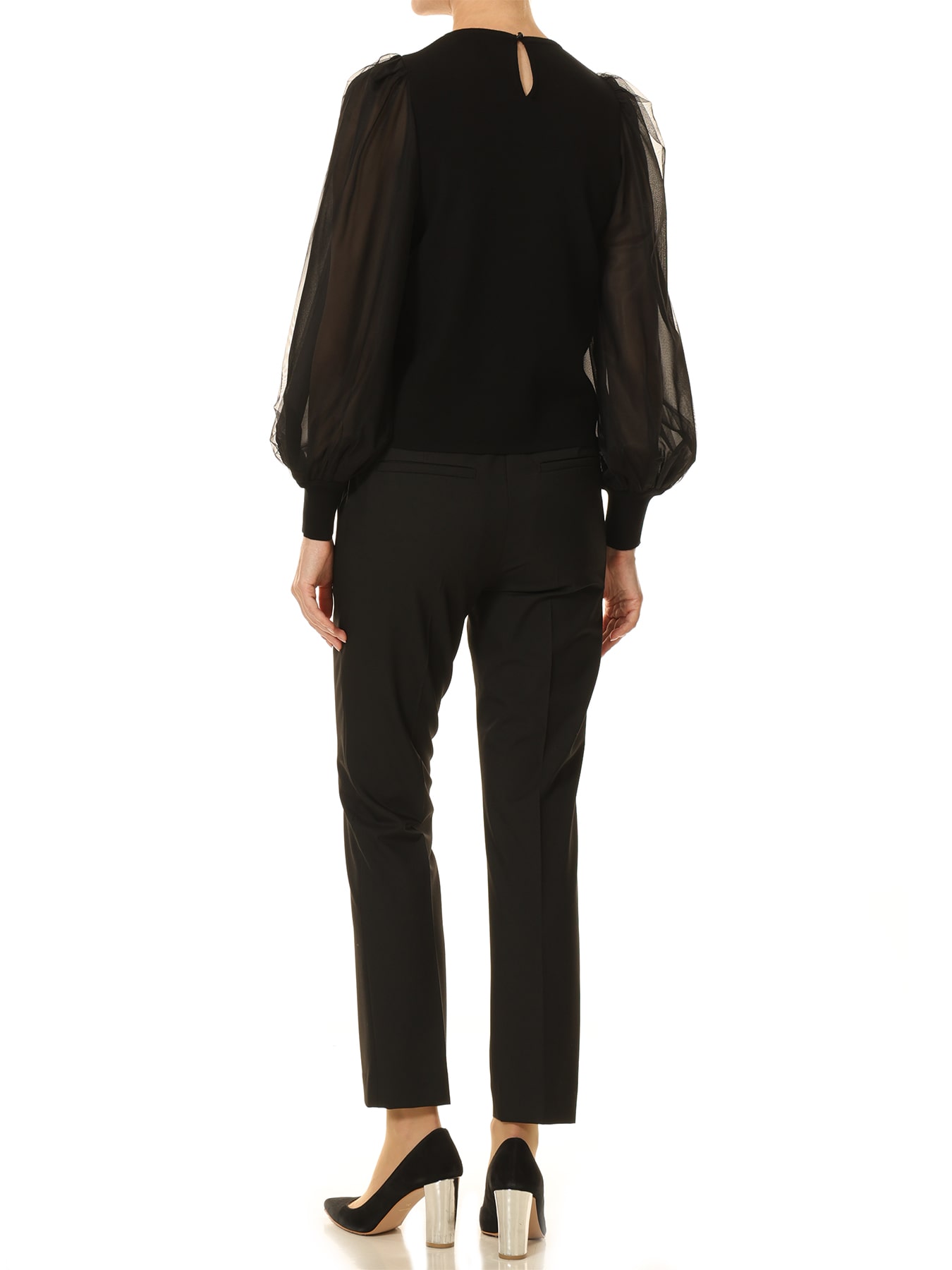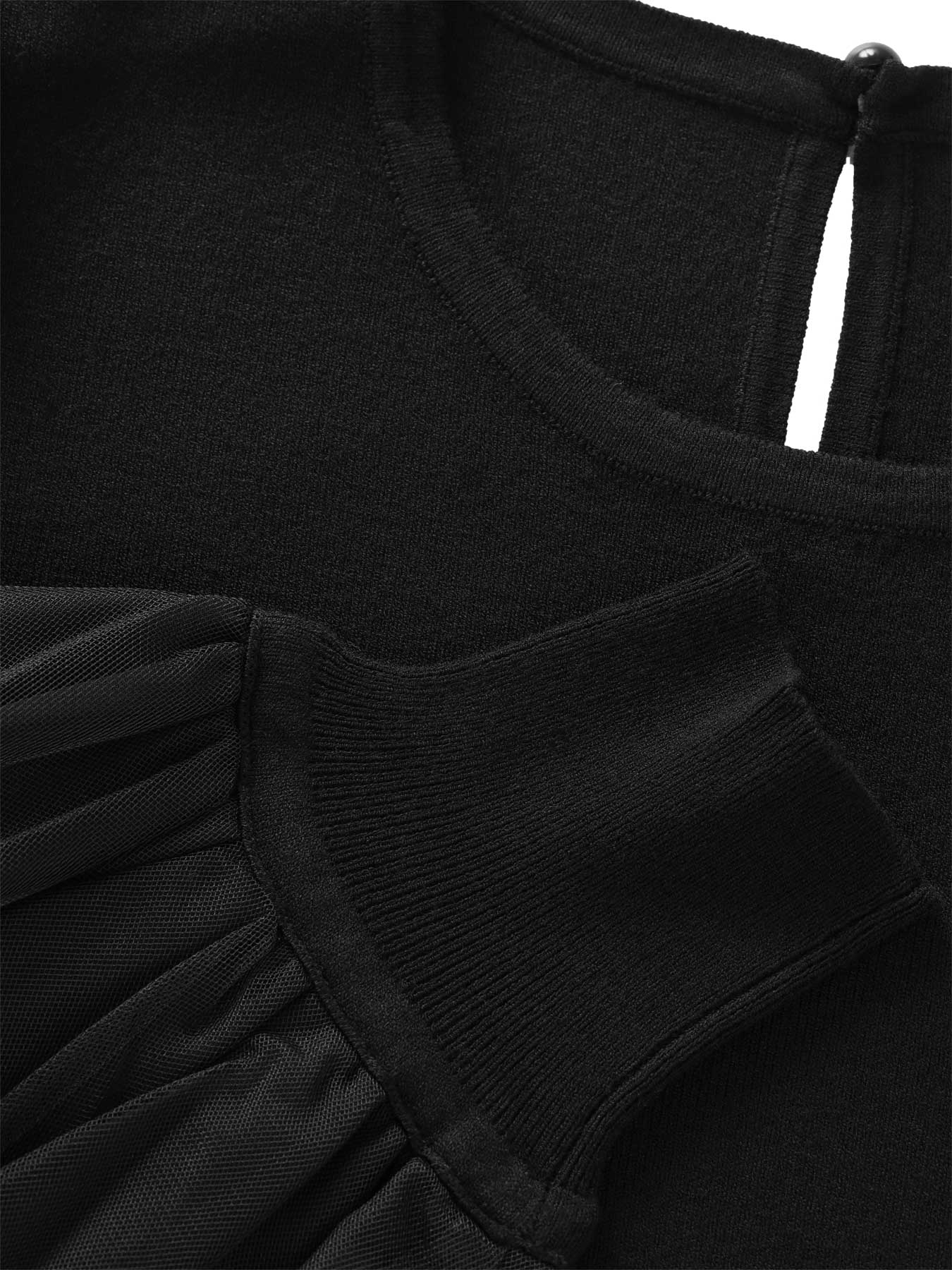 チュールとシフォンを重ねたボリュームスリーブが、軽やかでエレガントな印象を与えるニットプルオーバー。透け感のある素材がほどよい抜け感を生み、華やかさの中にも上品な落ち着きを添えます。身頃にはしなやかなレーヨンベースの薄手ニットを使用し、優しい肌触りと着心地の良さを両立。スカートと合わせれば洗練された印象に、パンツと合わせればモードで凛としたスタイルに。日常から特別なシーンまで幅広く活躍する、上品さと華やかさを兼ね備えた一枚です。 ・袖部分は透け感あり ・ジャストフィット。通常サイズをお勧めします。 【お問い合わせ品番】 C746-005