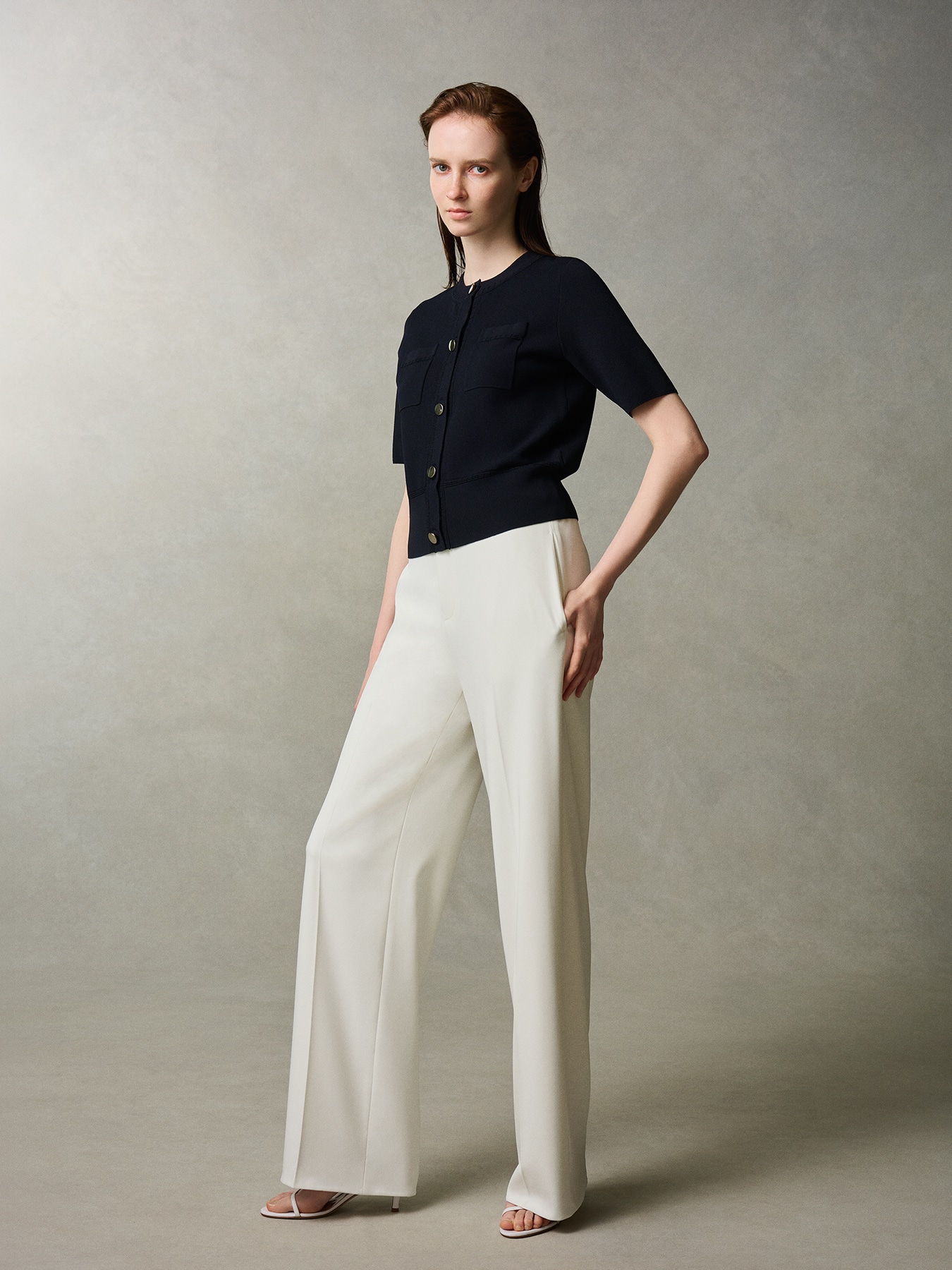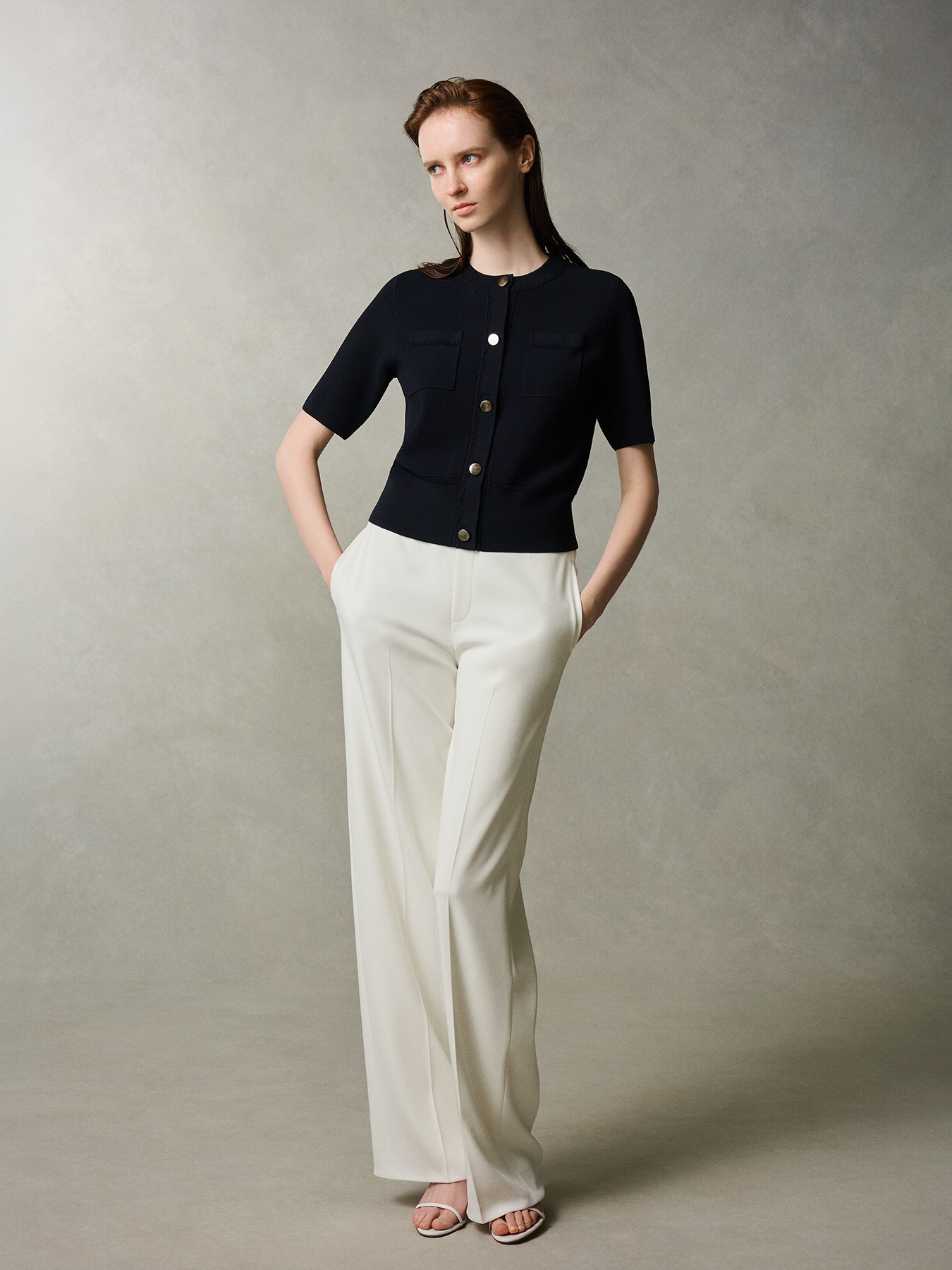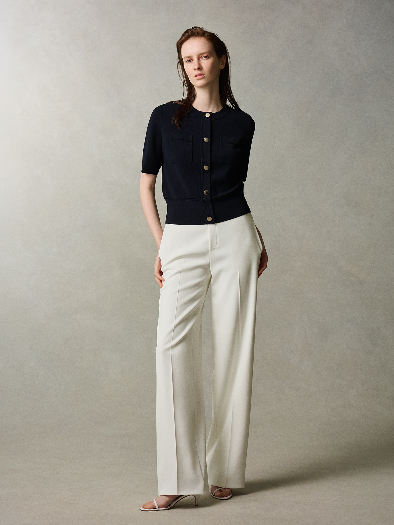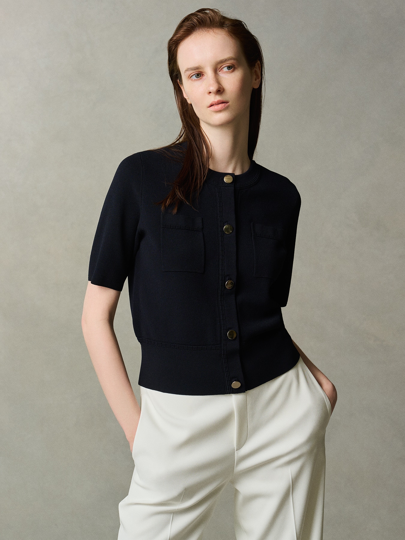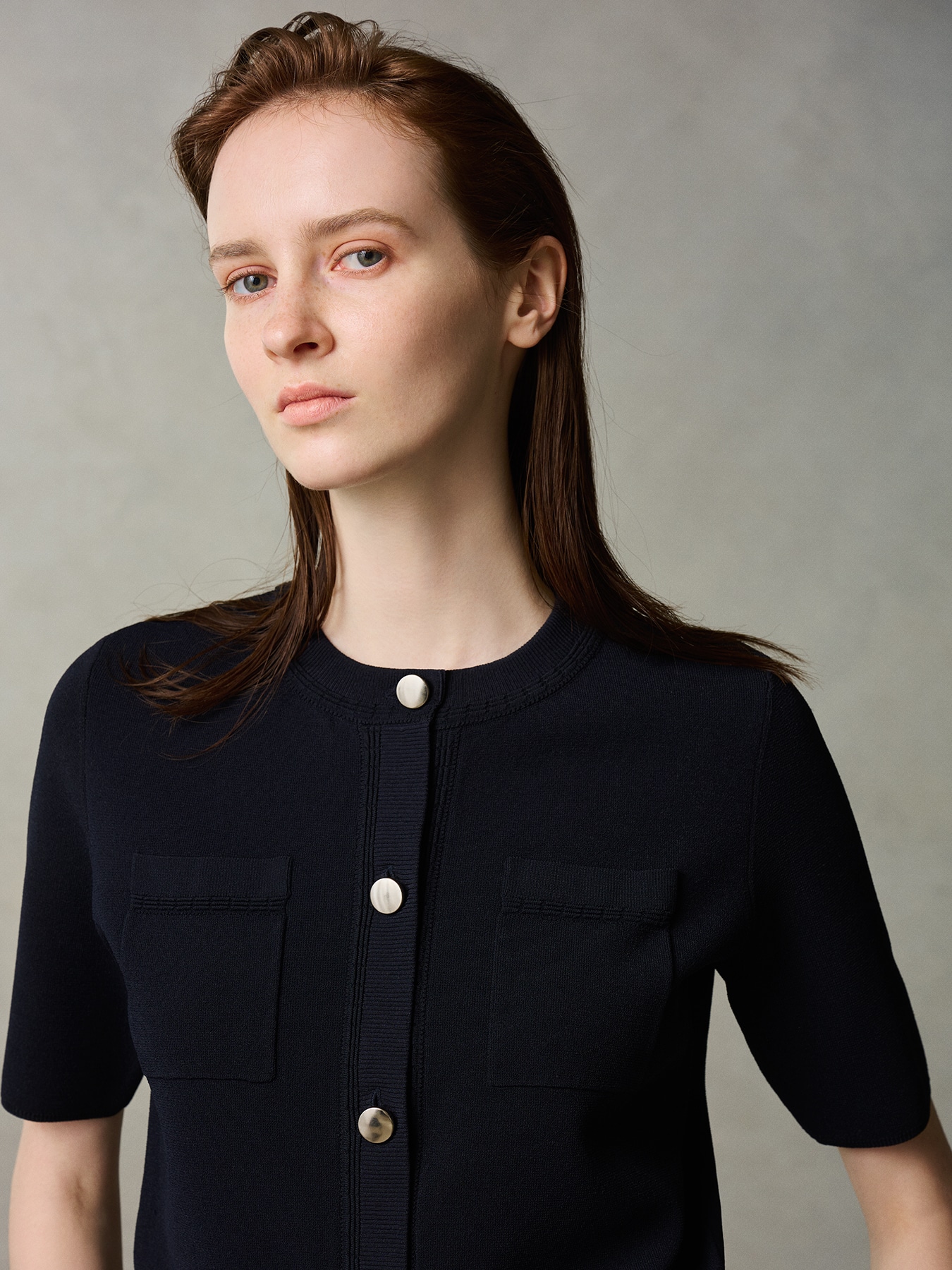 レーヨンベースのしなやかなニット素材で仕立てたカーディガンは、さらりとした肌触りと柔らかな着心地が魅力の一枚。ご家庭で手洗い可能に加え、UVカット機能も備えており、デイリーに取り入れやすい実用性の高さも嬉しいポイントです。フロントにあしらわれた艶やかなメタルボタンと、さりげなくアクセントを添えるポケットデザインが、シンプルな中にエレガントな表情をプラス。コンパクトなシルエットが上品な印象を引き立て、幅広いスタイリングに活躍します。オンスタイルには、タックパンツやタイトスカートと合わせて、きちんと感のある洗練された装いに。ボタンを留めてプルオーバーのように着こなすことで、より端正な印象に仕上がります。オフスタイルには、フレアスカートやデニムと合わせて、程よく力の抜けた大人のカジュアルスタイルに。軽やかな羽織りとしても活躍し、季節の変わり目にも重宝する一着です。 ・ご家庭で手洗いが可能 ・UVカット加工 ・淡色は透け感あり ・スチーム可能 ・ジャストフィット。通常サイズをおすすめします。 ・モデル身長171cm/バスト82cm/ウエスト60cm/ヒップ88cm/38サイズ着用 【お問い合わせ品番】 C747-001