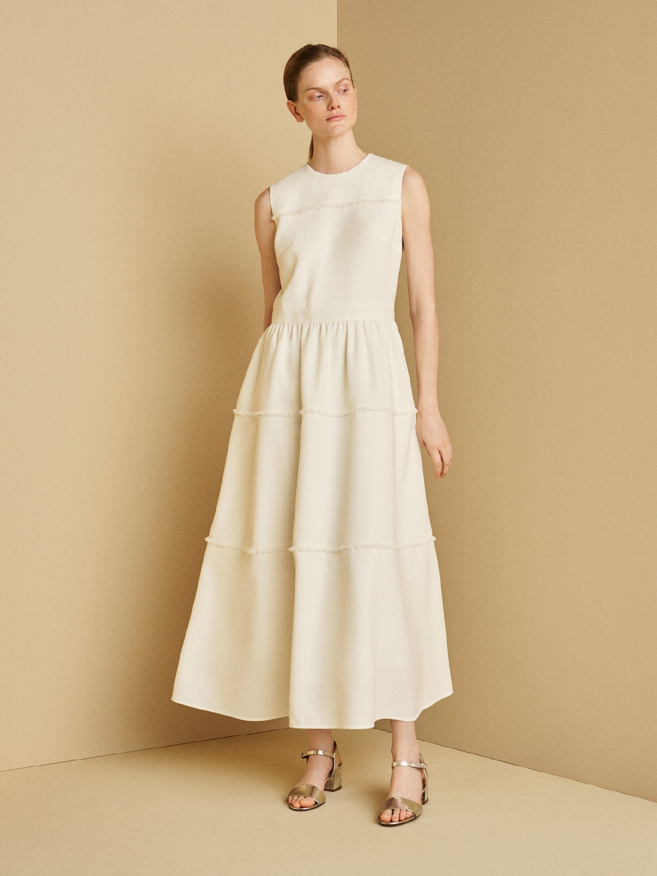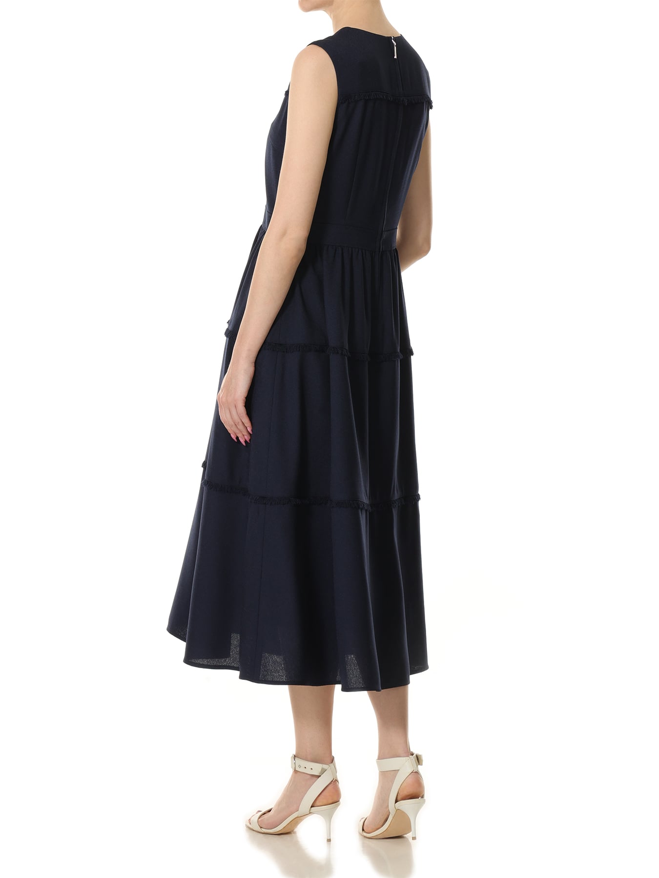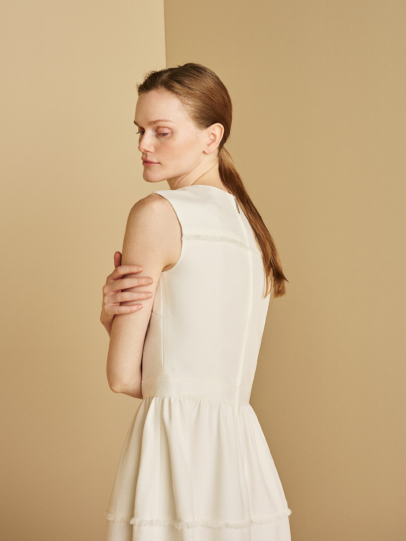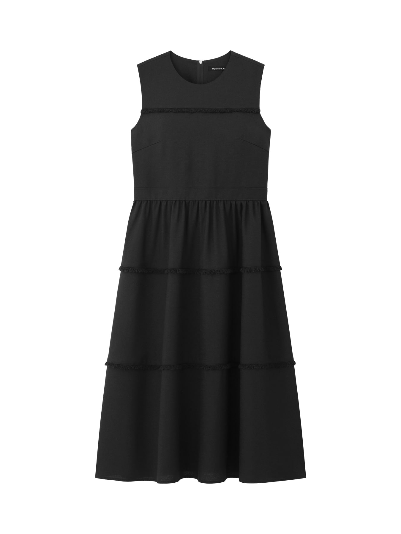 ナチュラルな風合いと上品さを兼ね備えた、エレガントなノースリーブワンピース。リネンライクな表情を持つポリエステル素材を使用し、軽やかでありながらもシワになりにくく、美しいシルエットをキープします。切替部分にあしらわれたフリンジディテールがさりげないアクセントとなり、シンプルな中に奥行きと華やかさをプラス。裾に向かって広がるティアードシルエットが、動くたびに優雅な印象を演出します。ご家庭で手洗いが可能なイージーケア素材で、デイリーにも取り入れやすいのも魅力。きちんと感とリラックス感を兼ね備え、幅広いシーンに対応する一着です。デイリーシーンには、フラットサンダルやスニーカーを合わせて軽やかに。カゴバッグやナチュラル素材の小物を取り入れることで、季節感のあるリラックススタイルに仕上がります。オフィスやきちんとしたシーンには、シンプルなパンプスやレザーバッグを合わせて上品に。カーディガンやジャケットを羽織ることで、より洗練された印象に整います。お出かけや特別なシーンには、ヒールサンダルや華奢なアクセサリーをプラスして、女性らしさを引き立てたエレガントな装いに。ワントーンでまとめることで、より一層モードで洗練されたスタイルをお楽しみいただけます。 ・ご家庭で手洗いが可能 ・WHITEは透け感あり ・バックコンシールファスナー開き ・スチーム可能 ・ジャストフィット。通常サイズをおすすめします。 ・モデル身長171cm/バスト82cm/ウエスト60cm/ヒップ88cm/38サイズ着用 【お問い合わせ品番】 C947-005