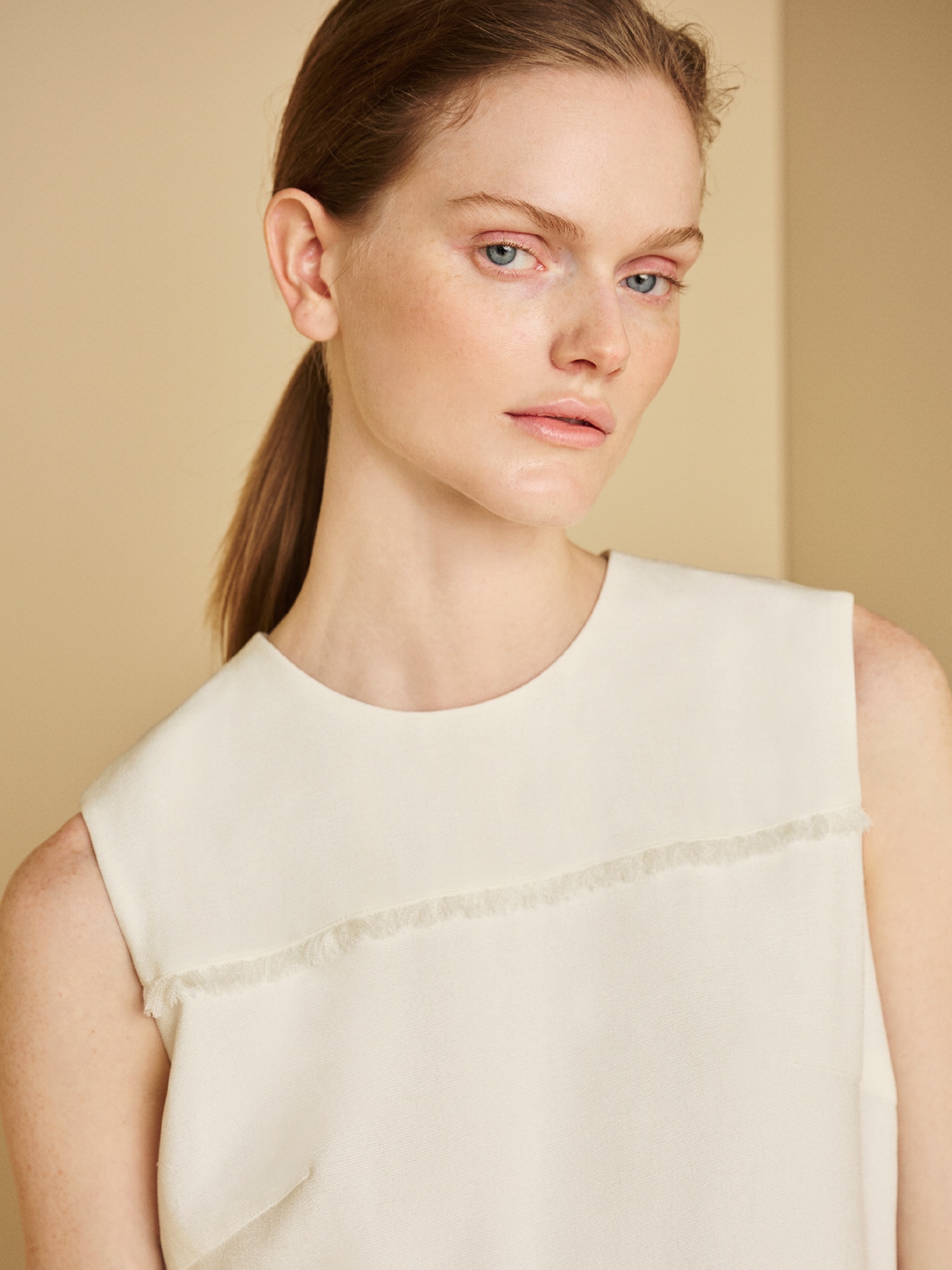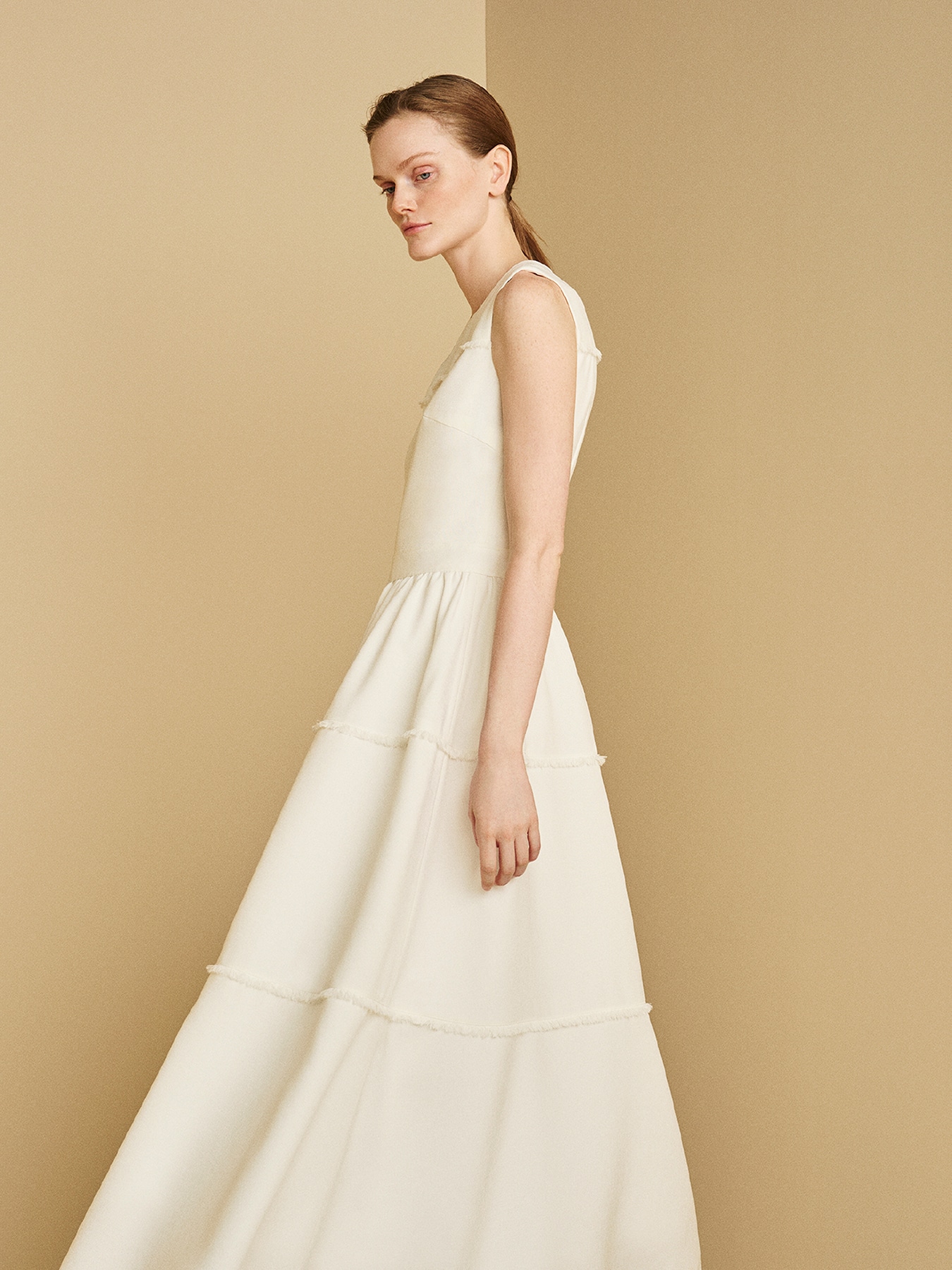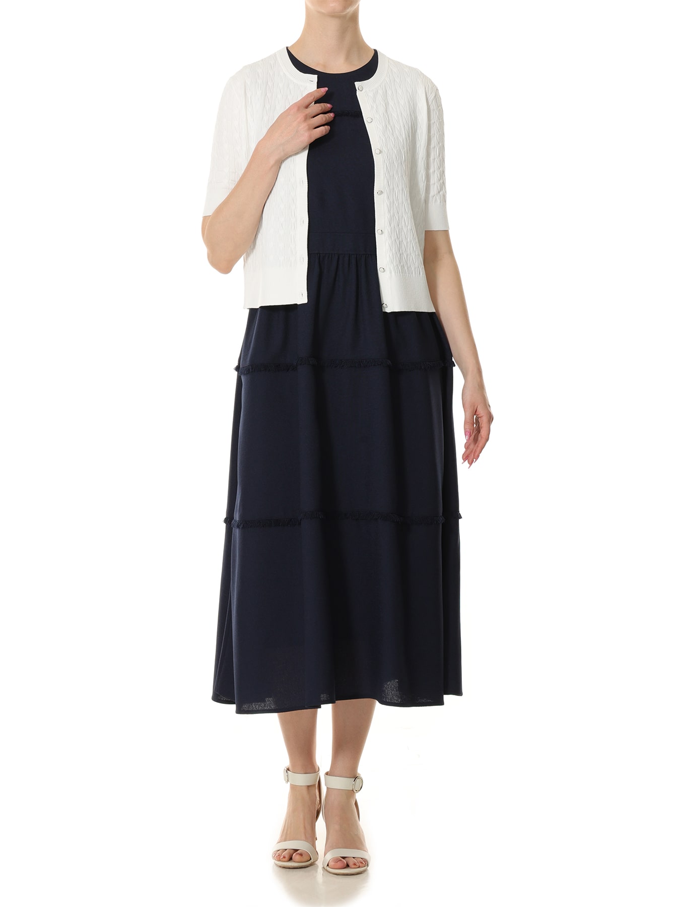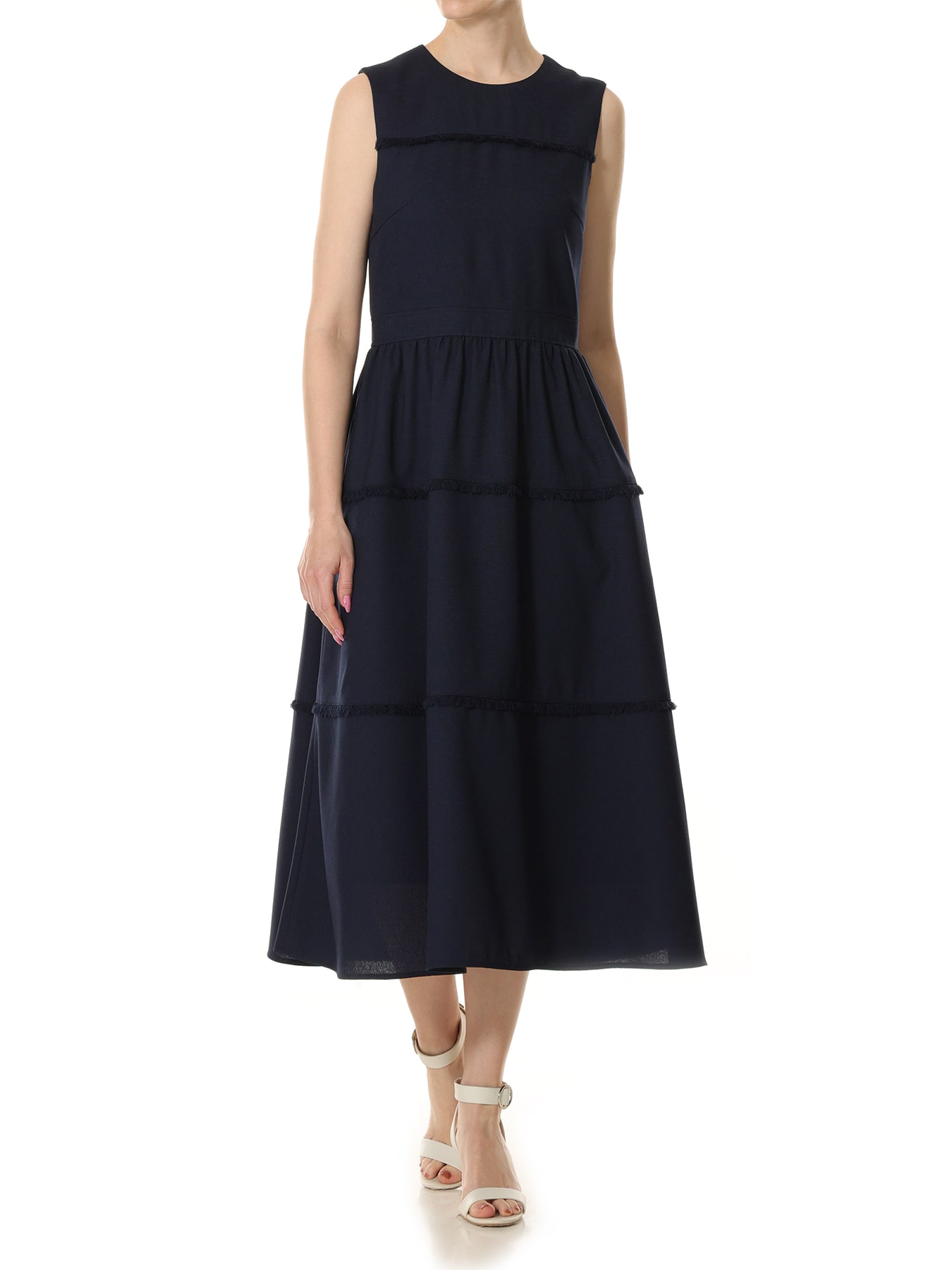ナチュラルな風合いと上品さを兼ね備えた、エレガントなノースリーブワンピース。リネンライクな表情を持つポリエステル素材を使用し、軽やかでありながらもシワになりにくく、美しいシルエットをキープします。切替部分にあしらわれたフリンジディテールがさりげないアクセントとなり、シンプルな中に奥行きと華やかさをプラス。裾に向かって広がるティアードシルエットが、動くたびに優雅な印象を演出します。ご家庭で手洗いが可能なイージーケア素材で、デイリーにも取り入れやすいのも魅力。きちんと感とリラックス感を兼ね備え、幅広いシーンに対応する一着です。デイリーシーンには、フラットサンダルやスニーカーを合わせて軽やかに。カゴバッグやナチュラル素材の小物を取り入れることで、季節感のあるリラックススタイルに仕上がります。オフィスやきちんとしたシーンには、シンプルなパンプスやレザーバッグを合わせて上品に。カーディガンやジャケットを羽織ることで、より洗練された印象に整います。お出かけや特別なシーンには、ヒールサンダルや華奢なアクセサリーをプラスして、女性らしさを引き立てたエレガントな装いに。ワントーンでまとめることで、より一層モードで洗練されたスタイルをお楽しみいただけます。 ・ご家庭で手洗いが可能 ・WHITEは透け感あり ・バックコンシールファスナー開き ・スチーム可能 ・ジャストフィット。通常サイズをおすすめします。 ・モデル身長171cm/バスト82cm/ウエスト60cm/ヒップ88cm/38サイズ着用 【お問い合わせ品番】 C947-005