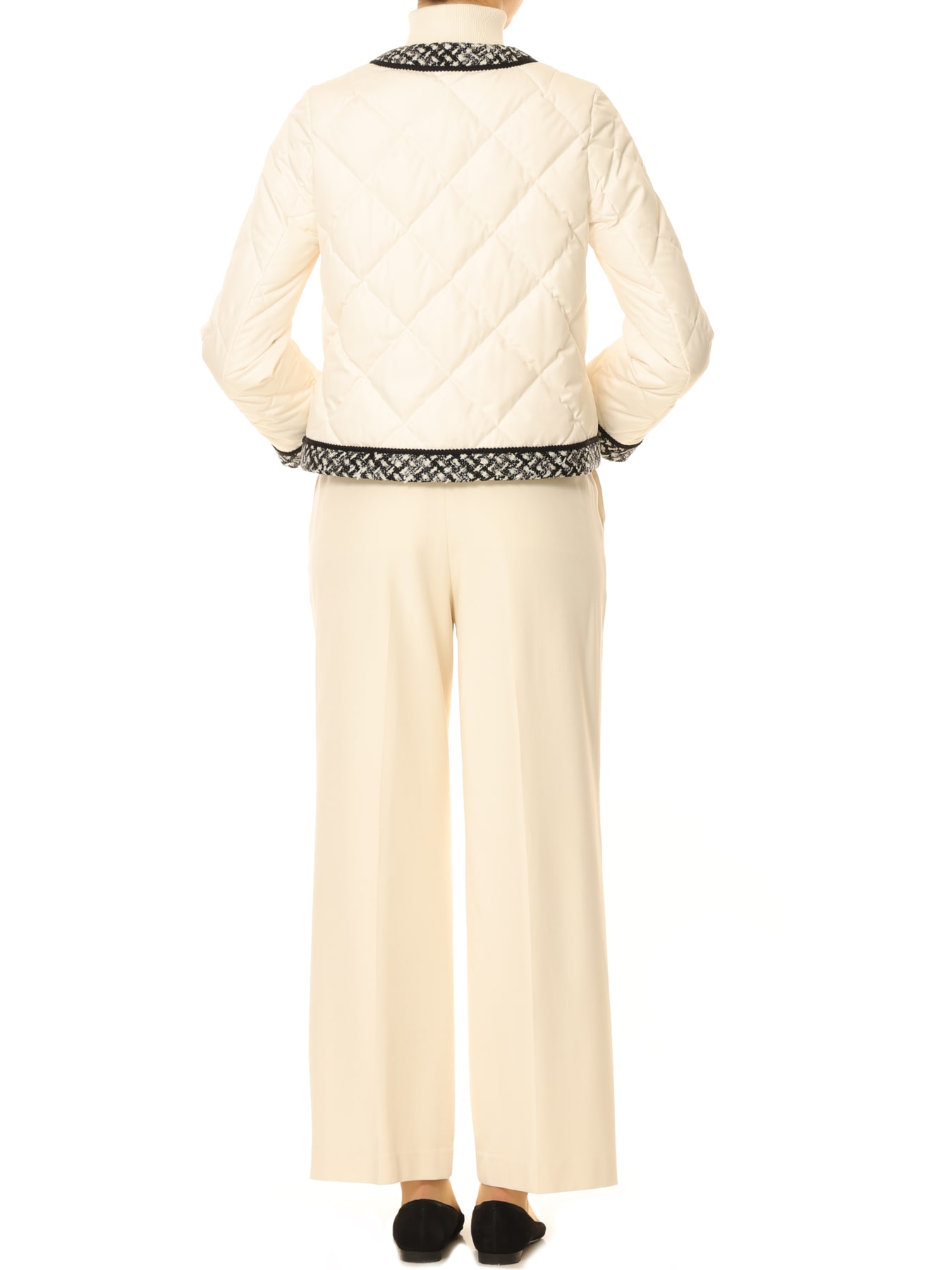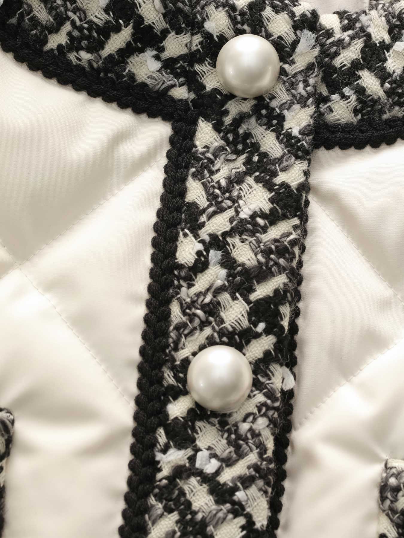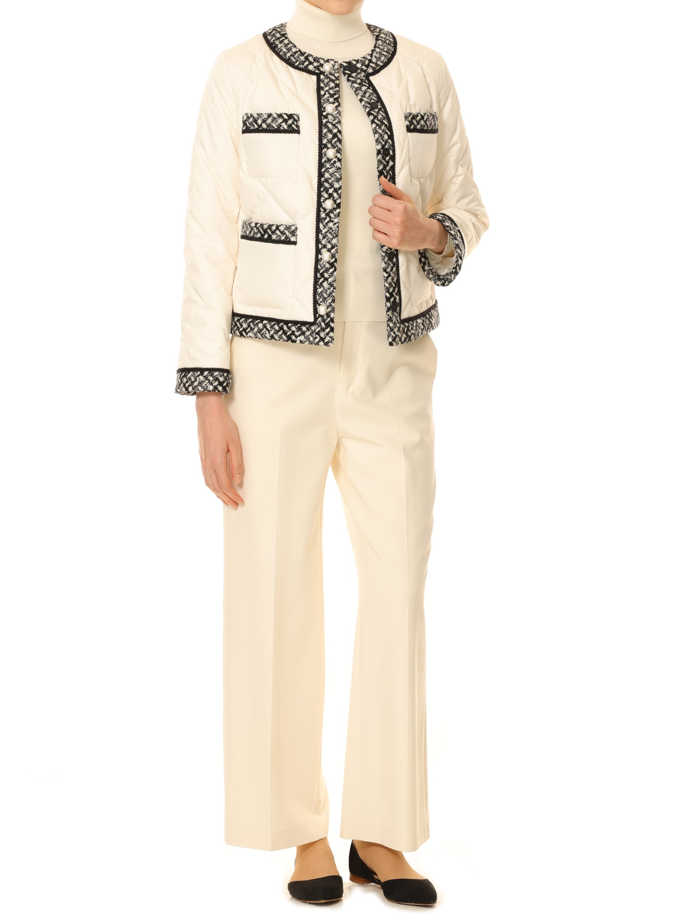 ブレードとツイード素材の切替デザインがラグジュアリーな雰囲気へと導いてくれる特別なダウンジャケット。フロントに施された飾りパールボタンがポイントになりクラシカルな雰囲気をプラスしてくれます。スナップボタンで着脱もしやすいところも嬉しいポイント。高い機能性を持ちながらも、ノーカラーのデザインはすっきりと見せてくれ、華やかさを添えてくれるダウンジャケットは大人の女性なら一着は揃えておきたいアイテム。コンパクトな丈感なので、ボリュームのあるボトムとも相性良くお召しいただくことができます。 ・スナップボタン開き ・ポケットあり ・ジャストフィット。通常サイズをお勧めします。 ・モデル身長173cm/バスト83cm/ウエスト59cm/ヒップ85cm/36サイズ着用 【お問い合わせ品番】 OFF WHITE:F243-010 BLACK:F243-011