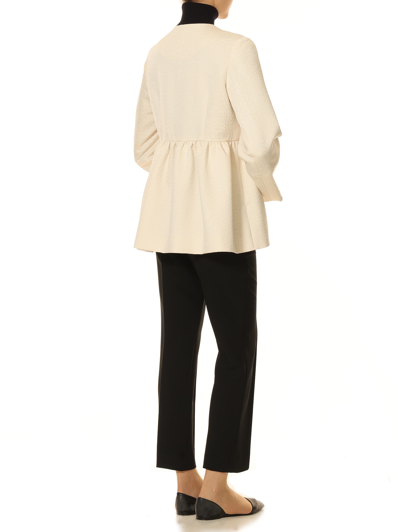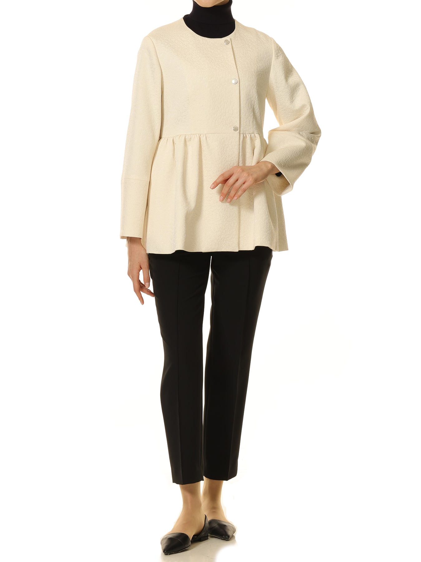 張り感のあるジャガード素材を使用した、華やかさと軽やかさを併せ持つライトコート。立体的なペプラムシルエットが女性らしい曲線を描き、纏うだけで上品な印象に導きます。存在感のあるボアの襟は取り外し可能で、シーンや季節に合わせて印象を変えられるのも嬉しいポイント。モノトーンの配色が洗練されたムードを引き立て、パンツとの相性も抜群。細身のテーパードパンツを合わせれば、コンパクトなシルエットが際立つバランス美のスタイルに。スリムなロングブーツを合わせたモードな着こなしもおすすめです。軽やかな着心地ながら存在感があり、冬の立ち上がりから春先まで重宝する一着です。 ・襟はボタンで取り外し可能 ・ポケットあり ・裏地あり ・フロントスナップボタン開き ・ややゆとりのあるフィット。通常サイズをお勧めします 【お問い合わせ品番】 F246-001