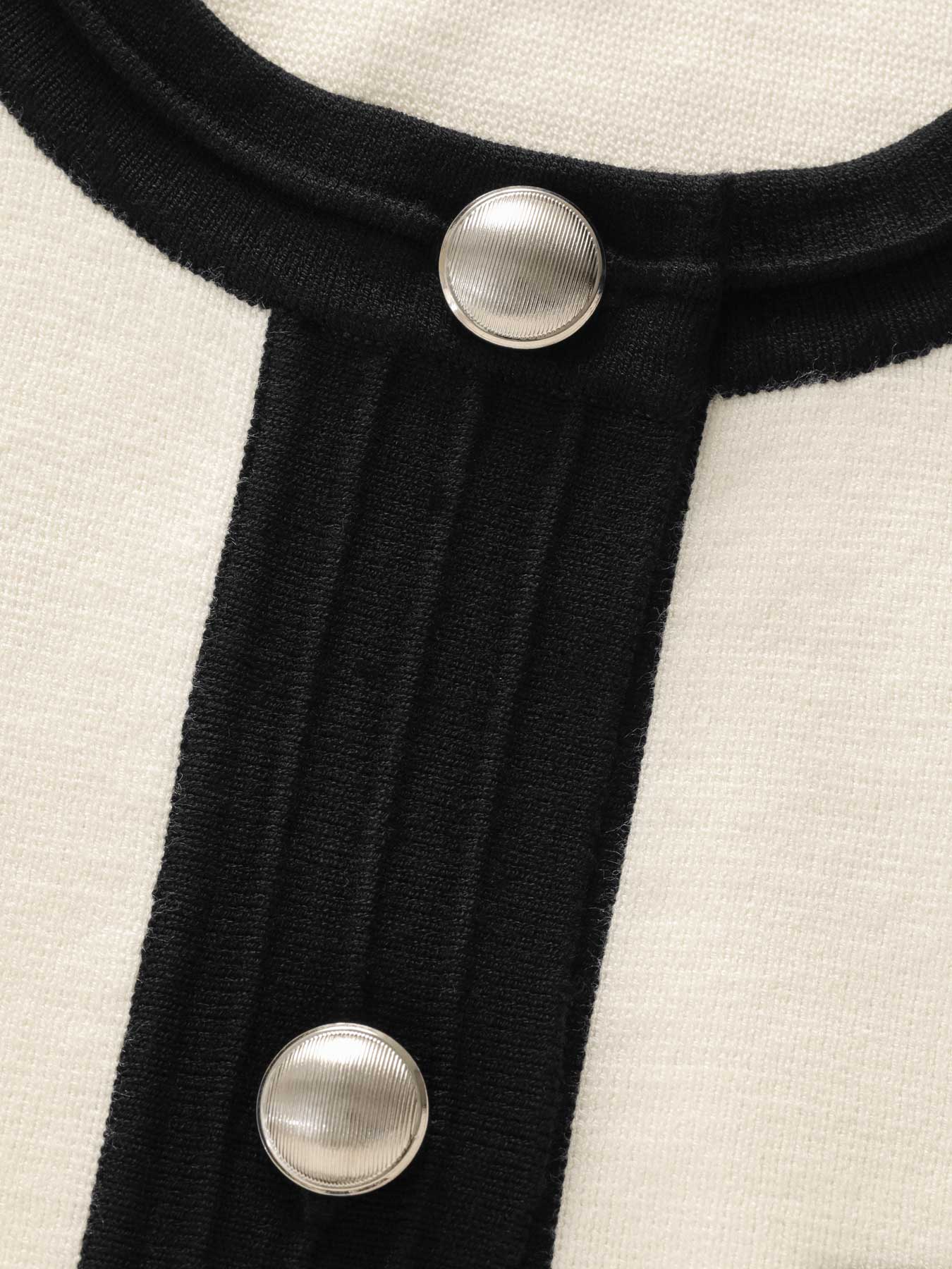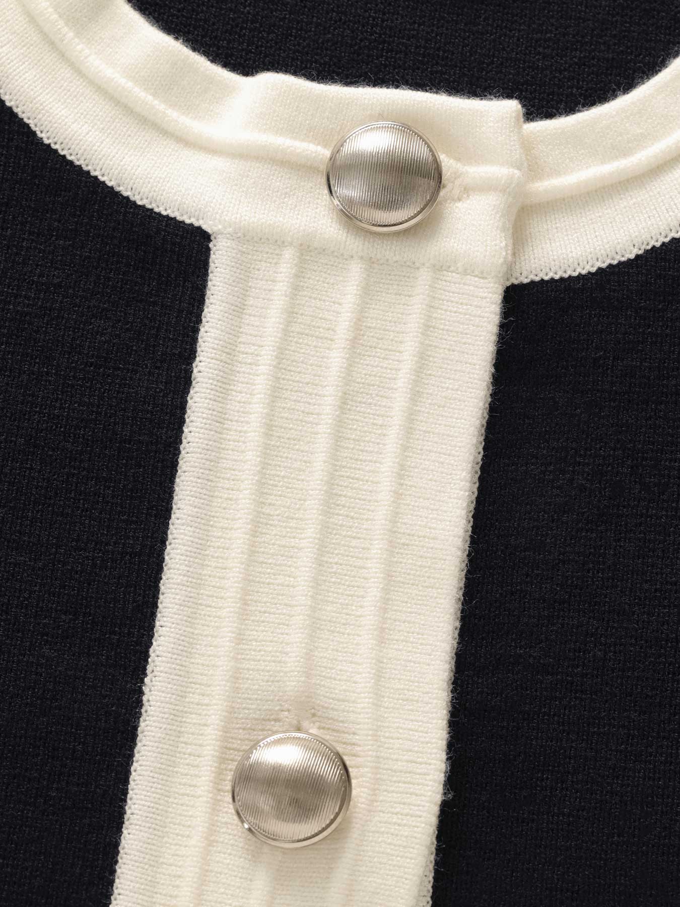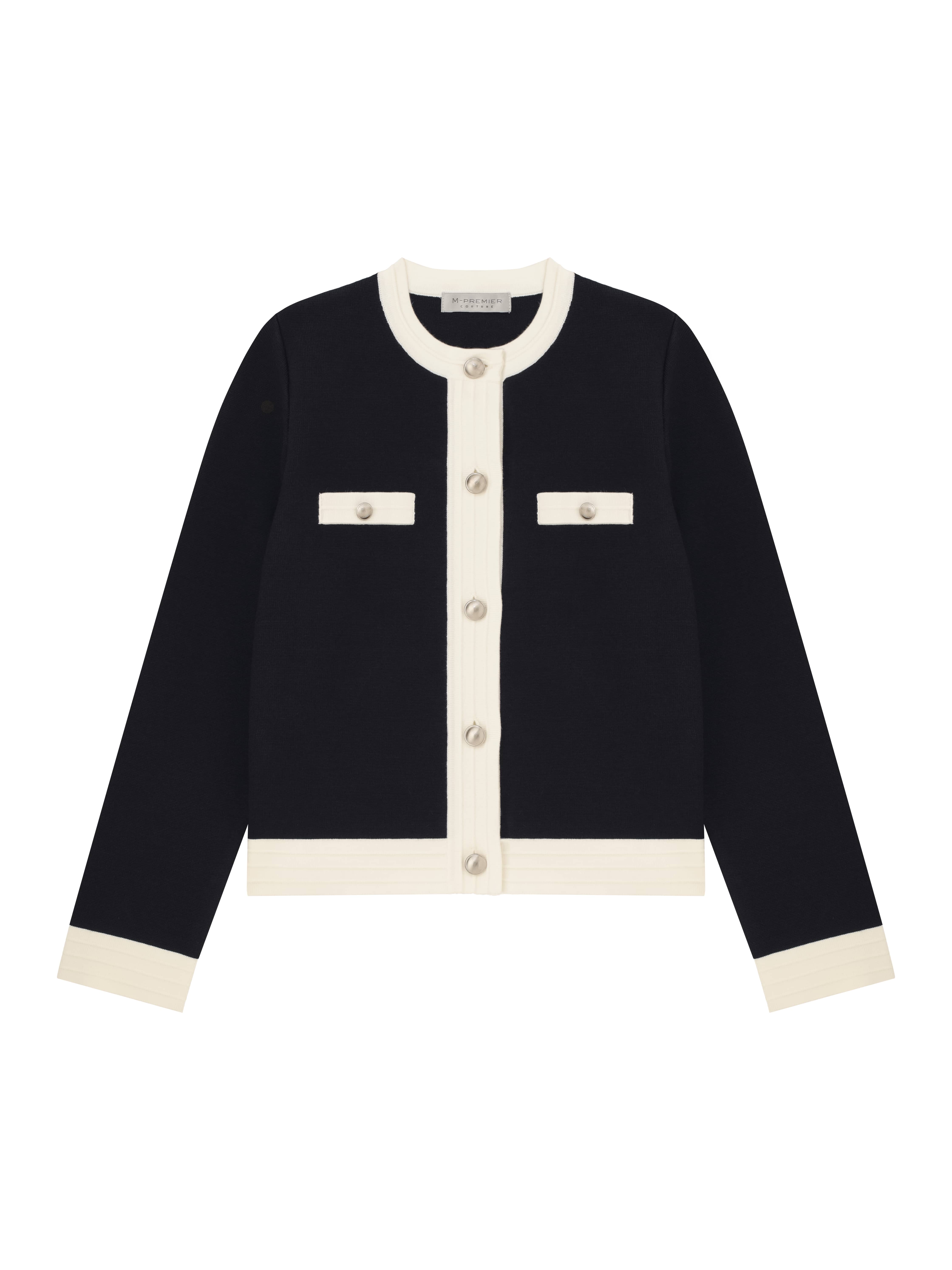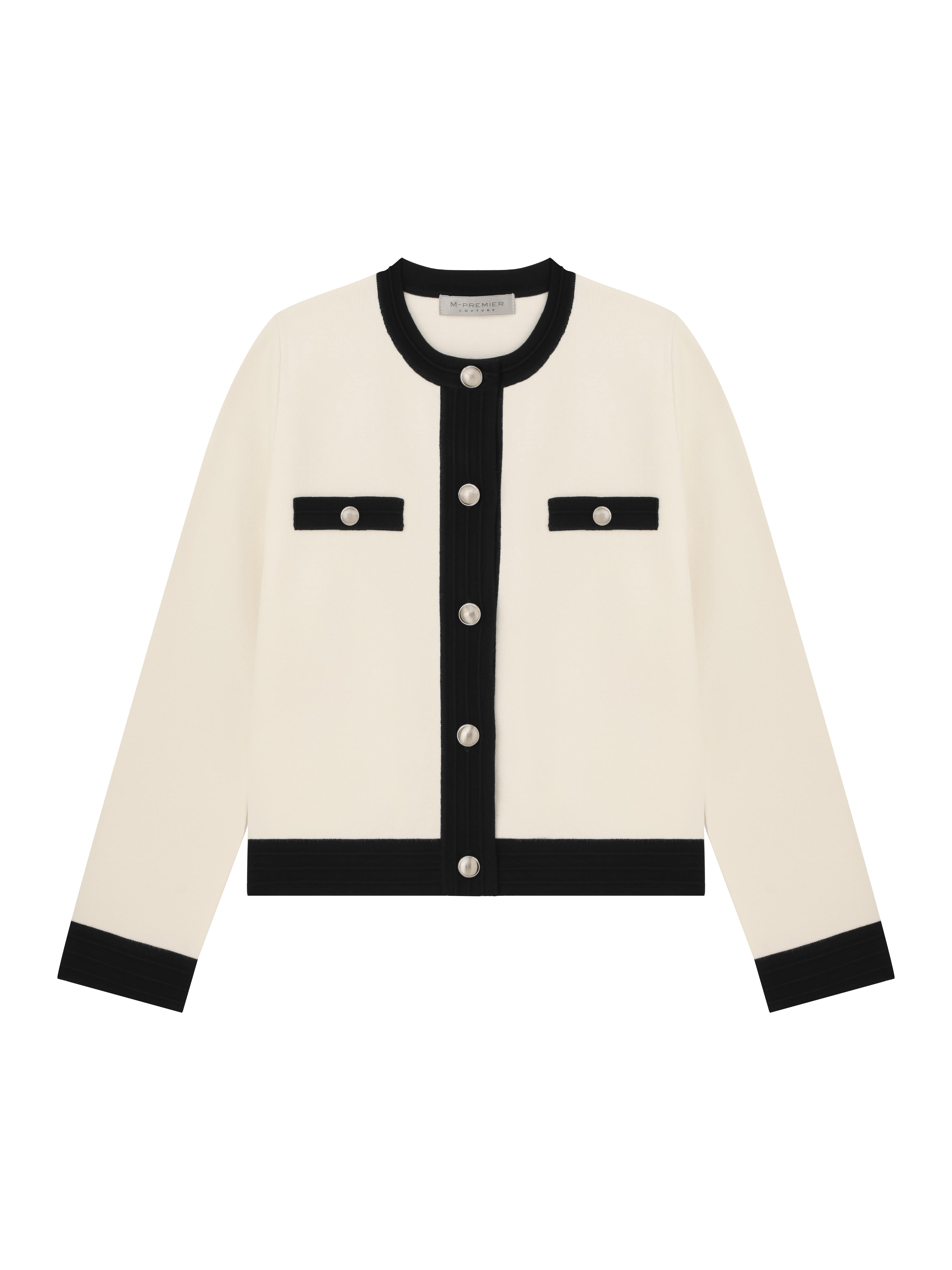 上品なバイカラーデザインがクラシカルな印象を与えるニットジャケット。程よく厚みのあるレーヨンベースのニット素材を使用し、快適な着心地ときちんと感を両立しました。メタル調のボタンがさりげない華やぎを添え、エレガントな佇まいを演出します。スカートを合わせれば上品でフェミニンなスタイルに、パンツと合わせれば知的で洗練された印象に。オフィスシーンはもちろん、ディナーや学校行事などのオケージョンシーンにもふさわしい一着です。コンパクトな丈感でスタイルアップも叶える、ワードローブに加えたいタイムレスなアイテム。 ・WHITEは透け感あり ・スチーム可能 ・ジャストフィット。通常サイズをおすすめします。 【お問い合わせ品番】 F746-010