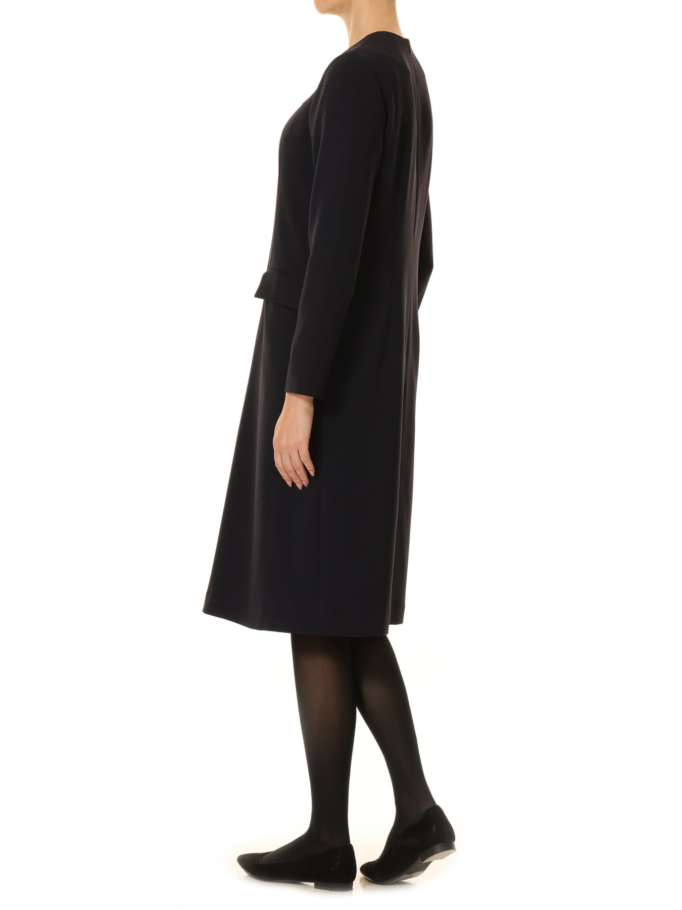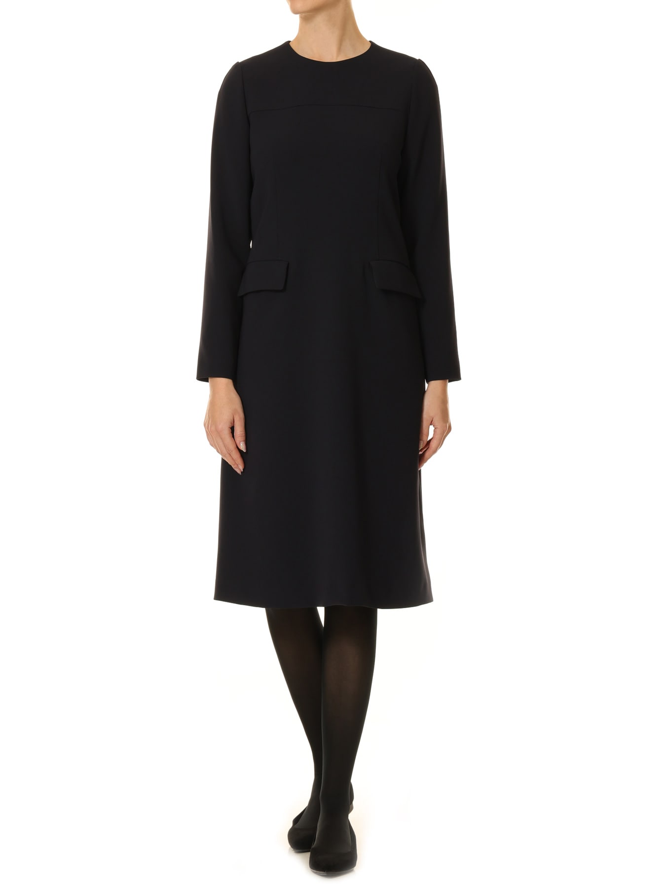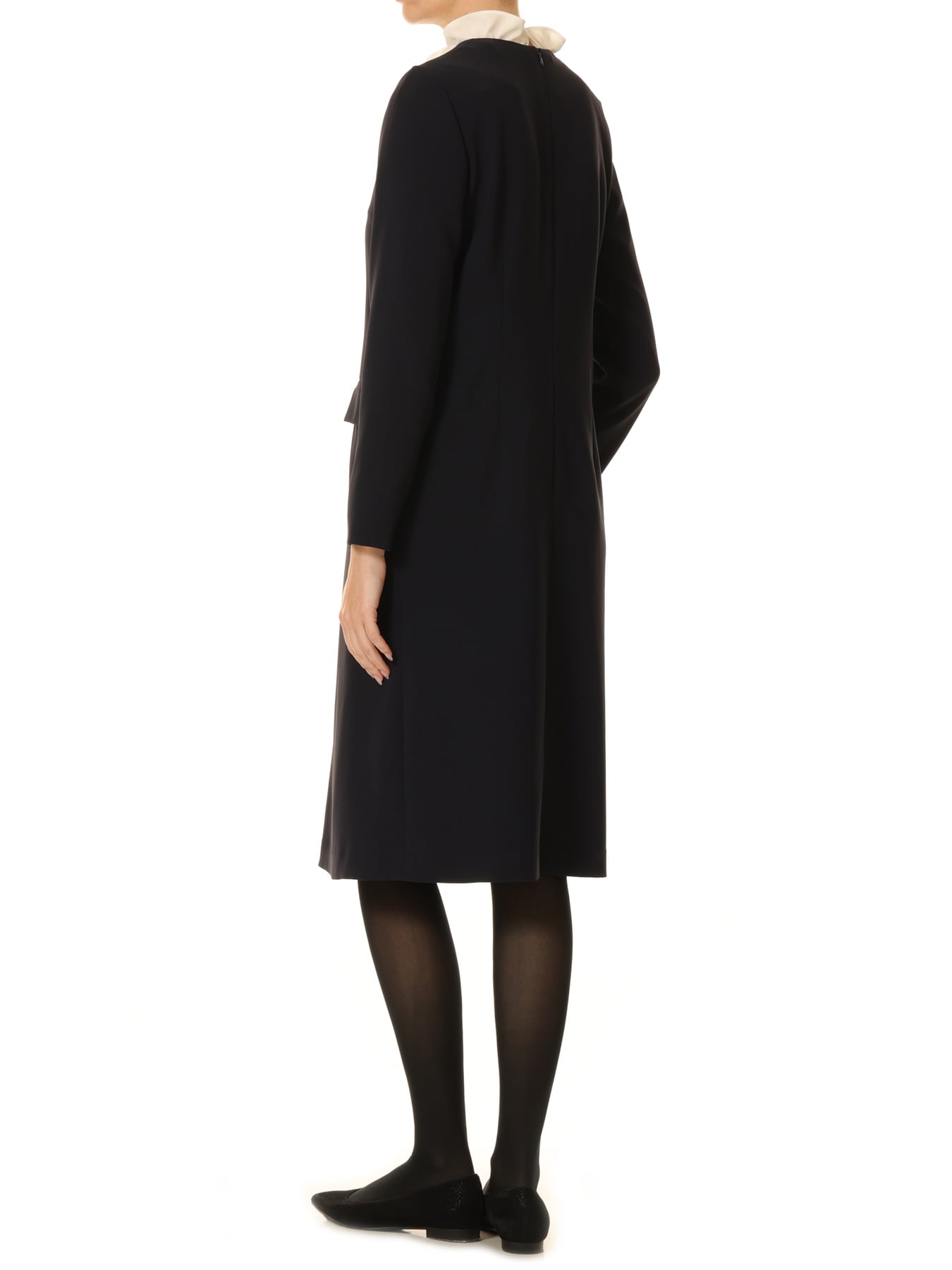 上品さと華やかさをひとさじ添えてくれる、フリルカラー付きのネイビーワンピース。取り外し可能なフリル襟は、シーンや気分に合わせて表情を変えられる優秀ディテールです。素材は、上品な光沢と美しい落ち感が魅力のダブルクロス。体のラインを拾いすぎず、すっきりとしたシルエットを描きながら、動くたびにしなやかに揺れるエレガントな一枚です。ネイビーカラーは品格がありながらも汎用性が高く、アクセサリーや小物次第で印象を自在にアレンジ可能。オフィスではフリルを外してシンプルに、端正なジャケットを重ねた知的な装いに。お食事や華やかな場ではフリル襟をオンし、イヤリングを添えてクラシカルに。セレモニーシーンにはパールや光沢小物を合わせれば、一層エレガントが際立ちます。一枚でスタイルが決まり、シーンに寄り添って印象を変えられる、ワードローブにぜひ加えたい万能ワンピースです。 ・ご家庭で手洗い可能 ・襟部分はボタンで取り外しが可能 ・裏地あり ・ポケットあり ・バックコンシールファスナー開き ・ジャストフィット。通常サイズをおすすめします。 【お問い合わせ品番】 F946-001