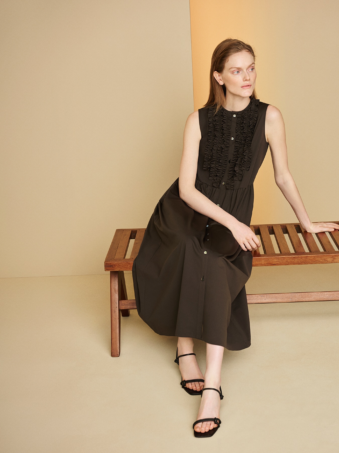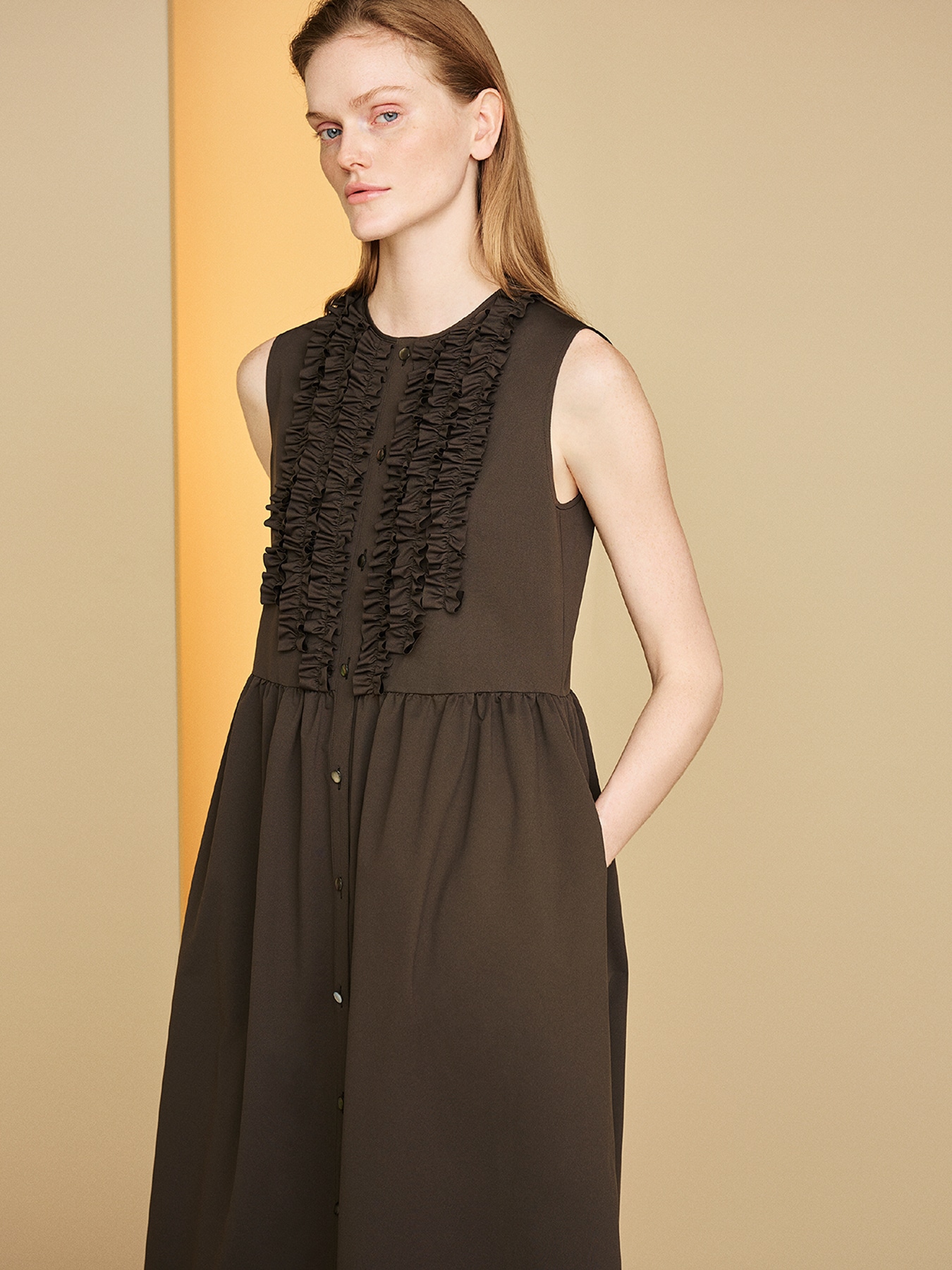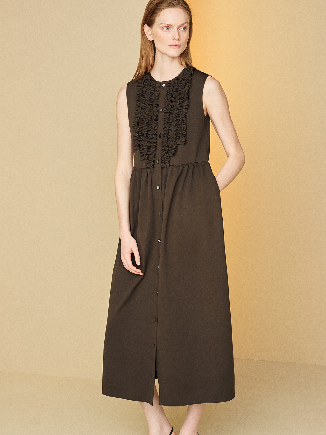 フロントにあしらった繊細なフリルが印象的な、上品な華やぎを纏えるワンピース。縦に並んだ前開きのデザインがすっきりとしたラインを強調し、甘さの中にも洗練された雰囲気を演出します。ストレッチ性のある素材を使用することで動きやすく、軽やかな着心地を実現。さらに撥水加工を施しているため、天候が変わりやすい日にも安心して着用できる実用性の高さも魅力です。ご家庭で手洗いが可能な点も、日常に取り入れやすい嬉しいポイント。ウエスト切り替えから広がる程よいフレアシルエットが女性らしさを引き立て、1枚で完成度の高いスタイルに導いてくれます。オンシーンには、パンプスやコンパクトなジャケットを合わせることで、きちんと感のある装いに。フロントのフリルがさりげないアクセントとなり、落ち着いた中にも品のある存在感を添えます。休日にはフラットシューズや軽めの羽織りを合わせて、リラックス感のある大人のカジュアルスタイルに。機能性とエレガンスを兼ね備え、日常からお出かけまで幅広く活躍する一着です。 ・ご家庭で手洗い可能 ・撥水加工素材 ・ポケットあり ・フロントボタン開き ・スチーム可能 ・ジャストフィット。通常サイズをお勧めします。 【お問い合わせ品番】 F947-001