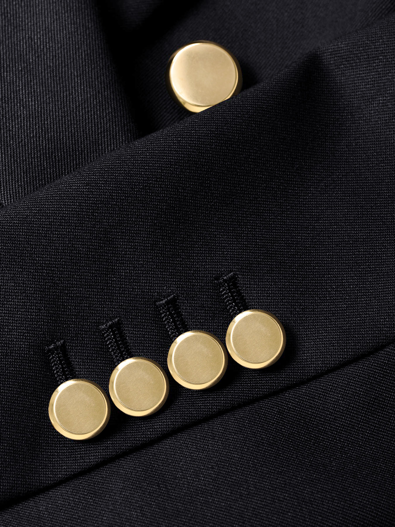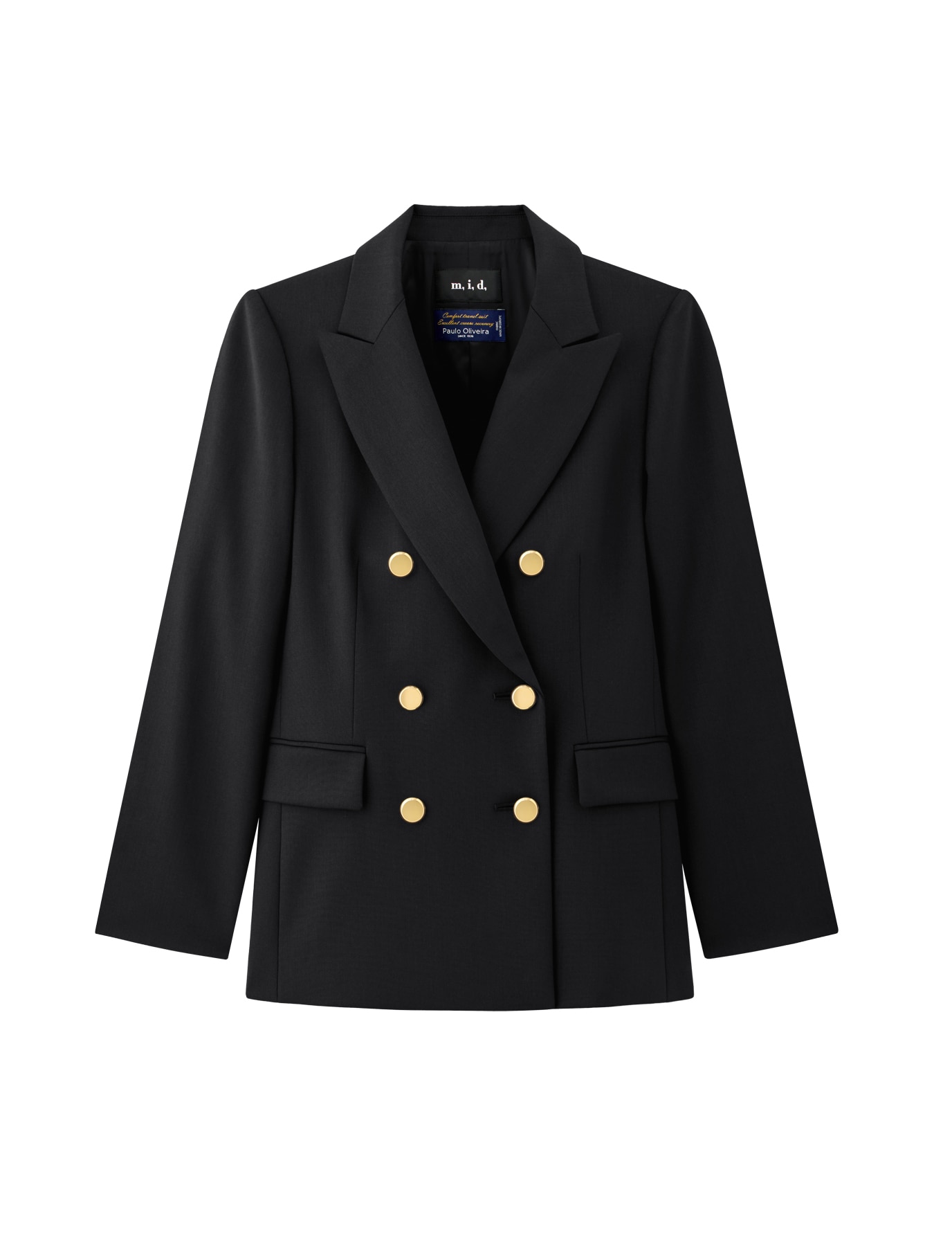 GOLDのメタル釦がアクセントになりクラシカルな雰囲気漂うダブルブレストデザインのジャケット。ピークドラペルがシャープでマニッシュなスタイルへ導きます。立体的なダブルボタンとフラップポケットがバランスよく、バックスタイルはベンツ開きが抜け感をプラス。肩パッドが入っていることで肩回りの型崩れ防止になり、美しいシルエットを長い期間お楽しみいただるのも魅力の一つ。”PAULO DE OLIVEIRA”社のポリエステルウールブレンドの防シワ、ストレッチ機能を持つ素材感を使用。ボディラインを美しく魅せる細身のジャケットは、オンオフ問わずコーディネートに洒落感をプラスでき、パンツからスカートまで幅広く合わせてお召いただけます。 ・肩パッドあり ・裏地あり ・フラップ付きポケットあり ・袖口本開き ・金属ボタン使用 ・スチーム可能 ・ジャストフィット。通常サイズをお勧めします。 ・重量約590g ・モデル身長171cm/バスト82cm/ウエスト60cm/ヒップ88cm/36サイズ着用 【お問い合わせ品番】 G146-008