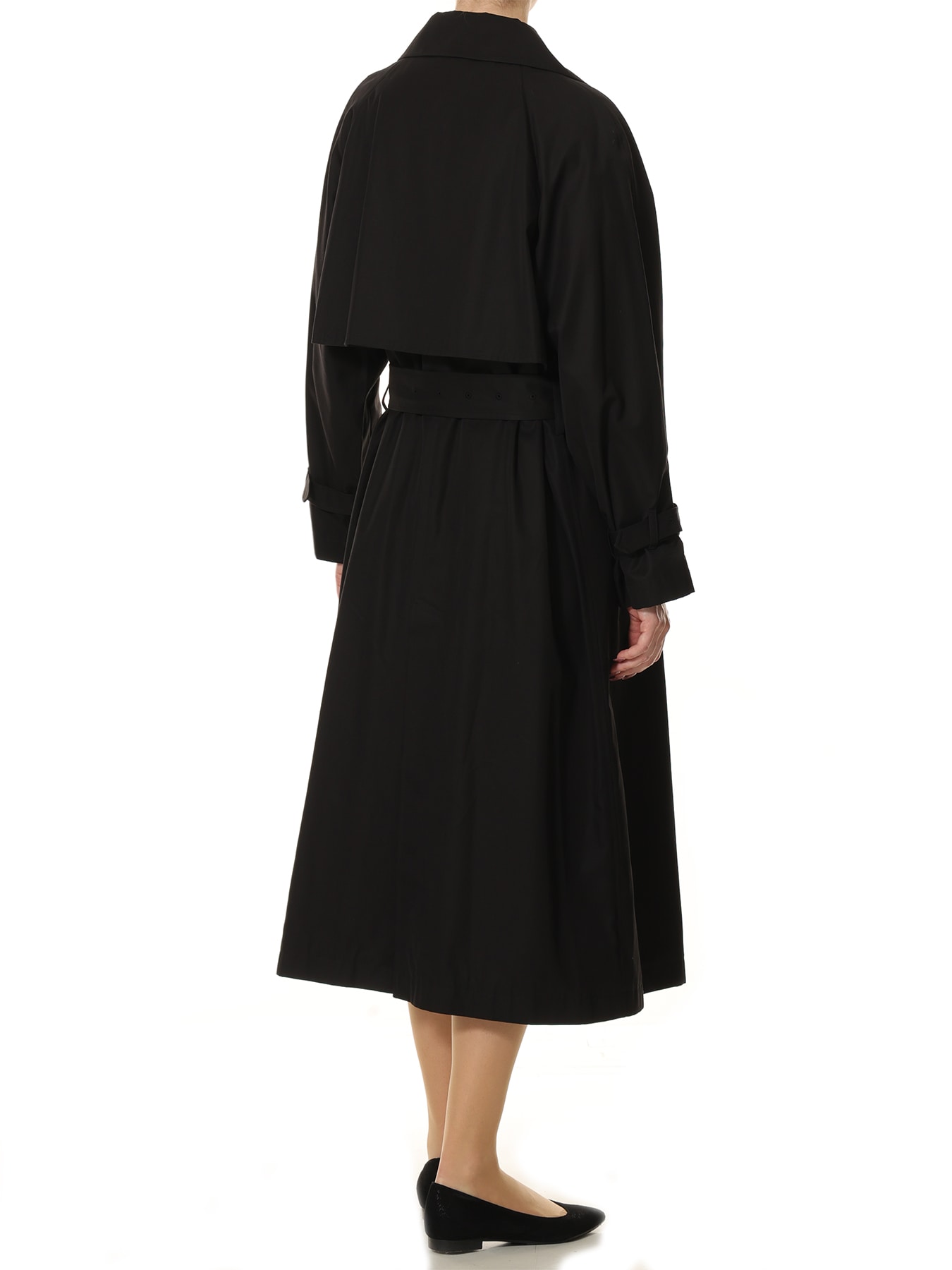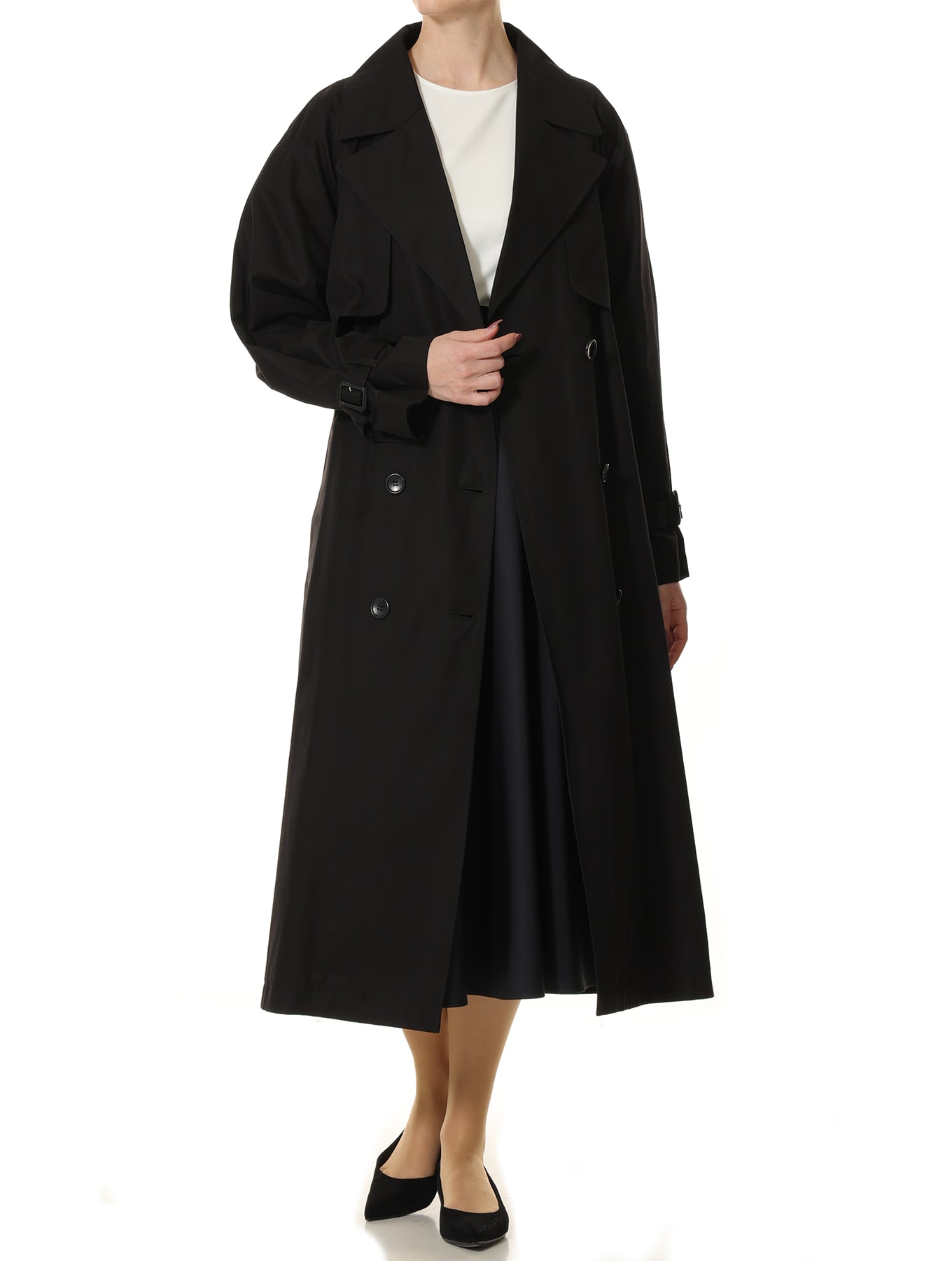 光沢感としなやかさに優れ、撥水加工が施されたコットン素材のギャバジンを使用したロングトレンチコート。バックル付きのベルトがウエスト部分と袖口のデザインポイントとなり、大き目の襟は小顔効果も期待できそう。ラグランスリーブでややオーバーサイズ気味にお作りしているので、クールな女性らしい着こなしが叶います。アンブレラヨークを大きめに作ることでバックシルエットもこなれた印象で、春先の着こなしをブラッシュアップしてくれます。 ・表地撥水加工あり ・裏地なし ・ポケットあり ・身頃左右にガンフラップ付き ・スチーム可能 ・ゆとりのあるフィット。通常サイズをおすすめします。 ・重量約930g 【お問い合わせ品番】 G242-002