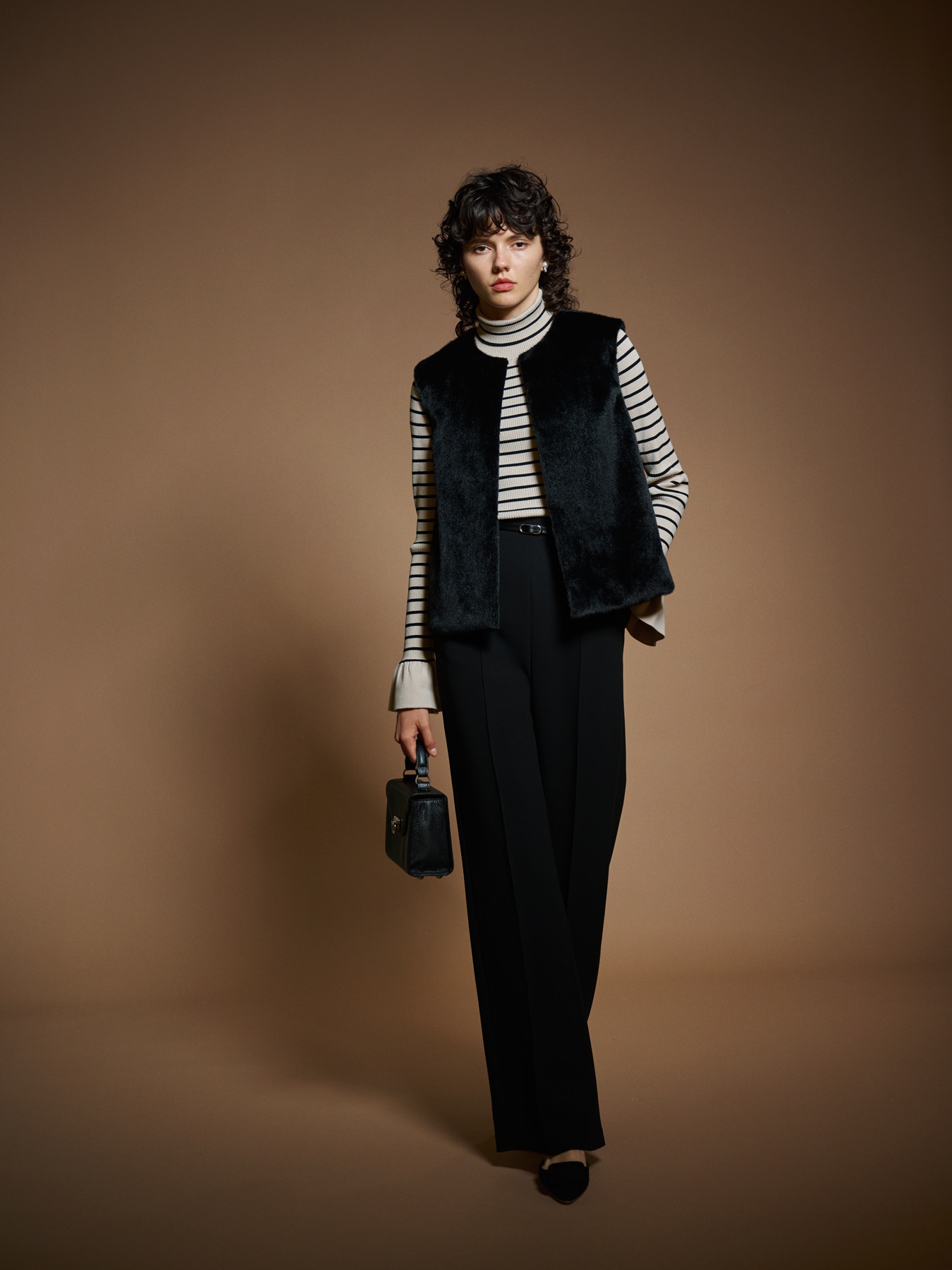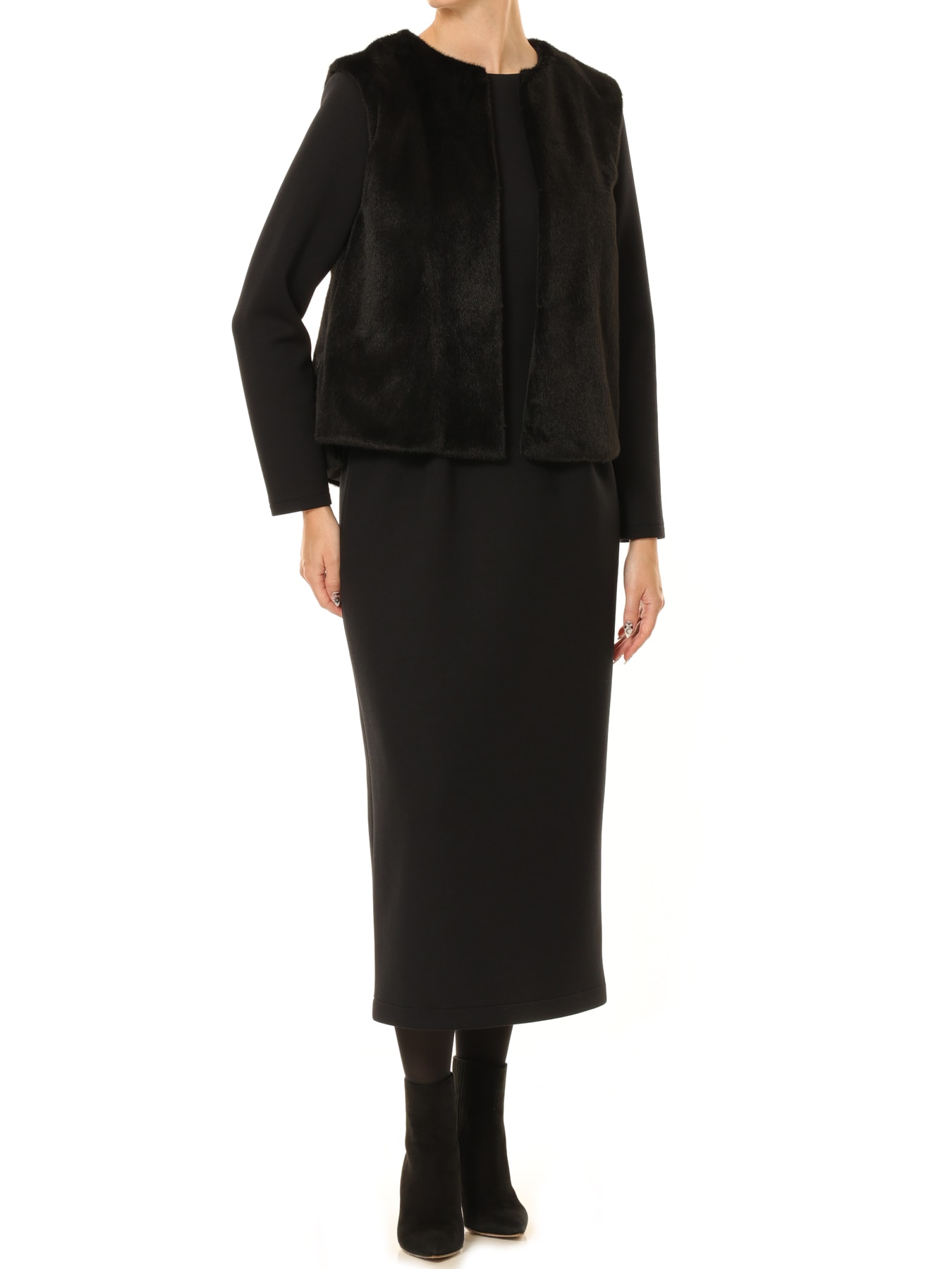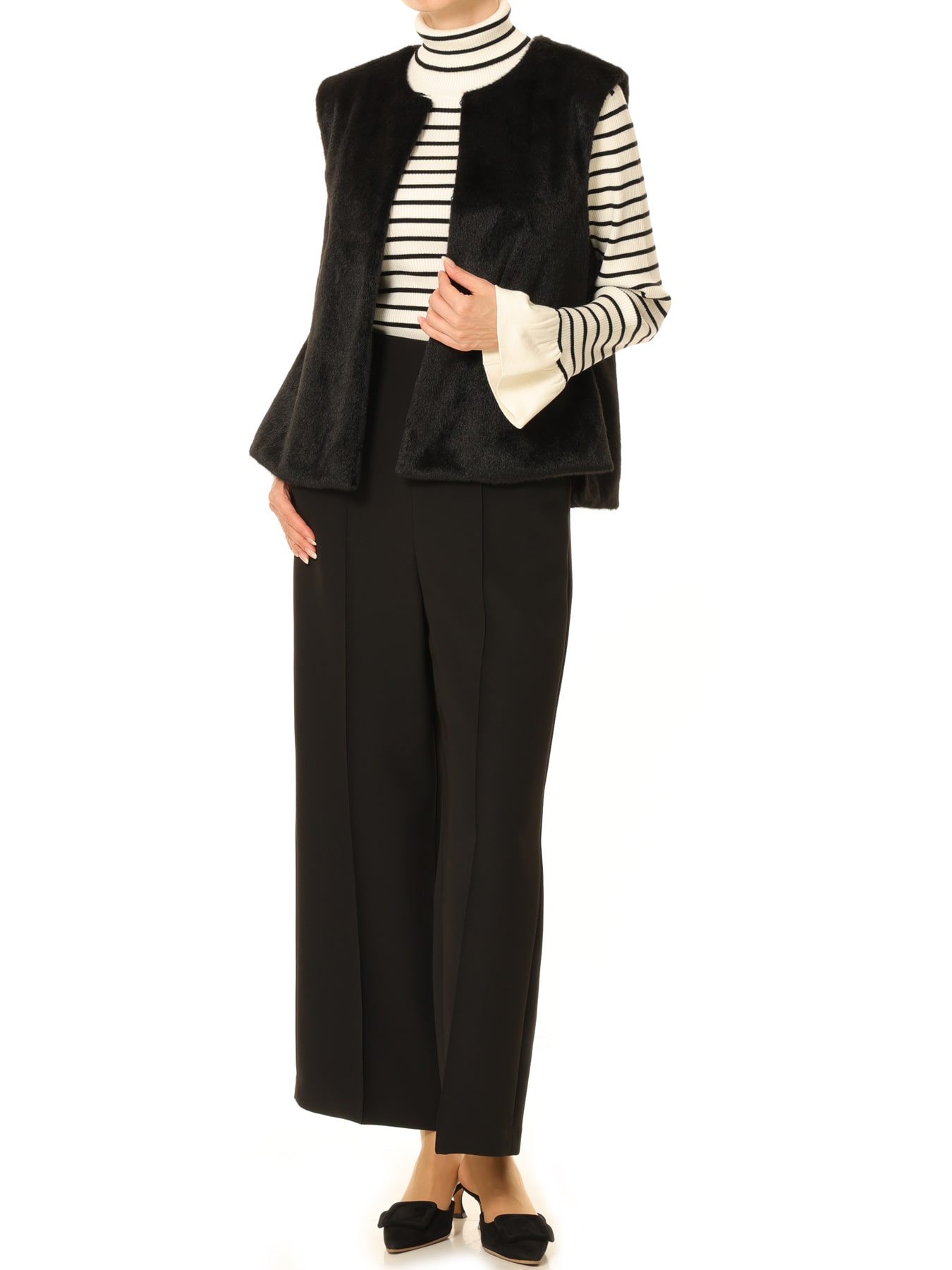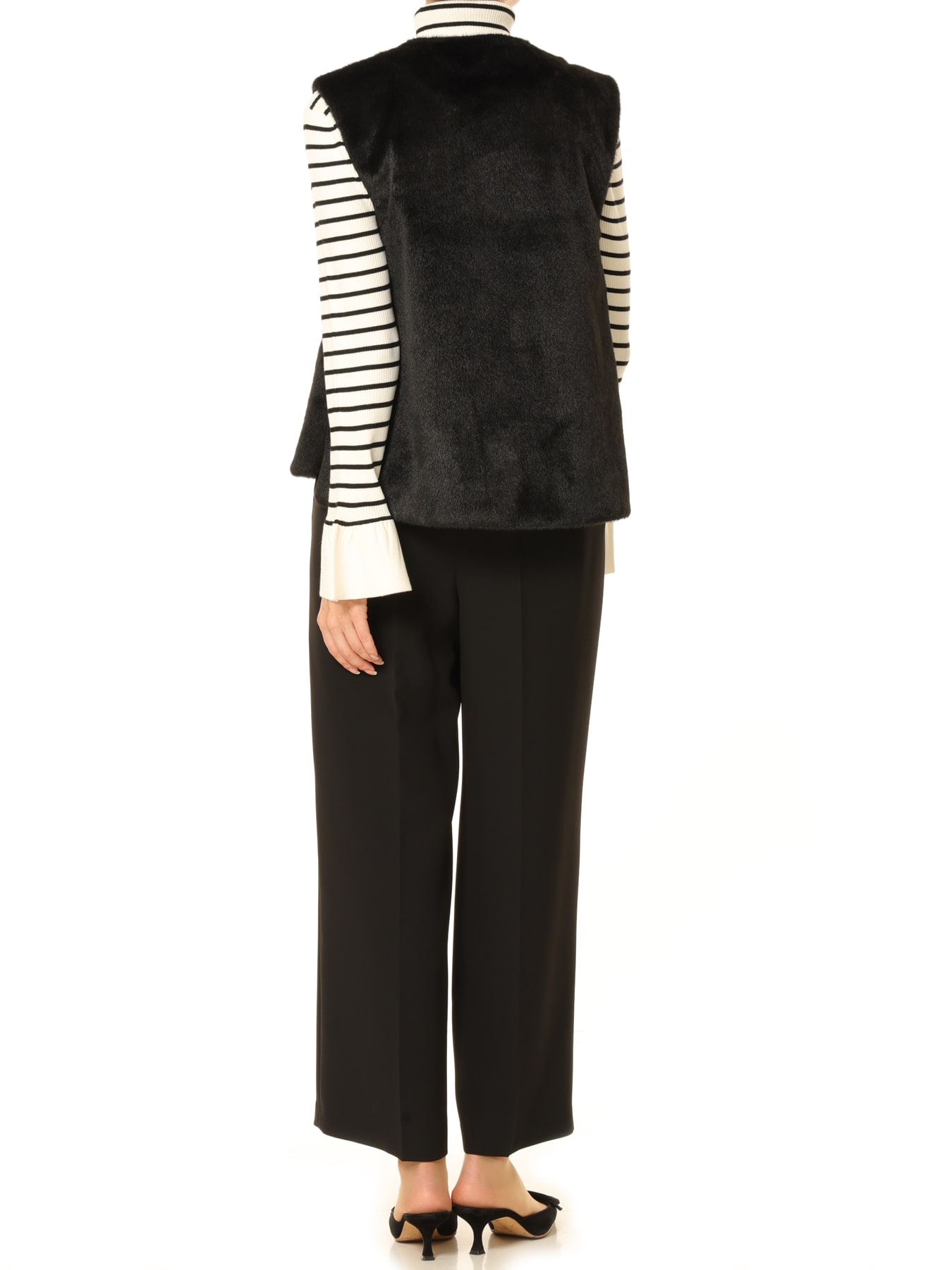 滑らかで美しい光沢感をもつエコ素材ながらも天然ファーのようなソフトな肌触りが魅力のエコファーを使用したベスト。シンプルなデザインにコンパクトな丈感で、バランスよく着こなすことができ、ファーアイテムにも挑戦しやすい一着。両裾にはスリットが入っていて、ややバックを長めに取ることで、ボリュームのあるボトムとも合わせやすいデザインです。身幅にはゆとりを持たせているのでインナーにはニットをあわせてももたつかず、幅広いコーディネートをお楽しみいただけます。 ・エコファー使用 ・中綿入り ・裏地あり ・フロントホック開き ・重量約440g ・ややゆとりのあるフィット。通常サイズをおすすめします。 ・モデル身長173cm/バスト85cm/ウエスト62cm/ヒップ90cm/38サイズ着用 【お問い合わせ品番】 S143-003
