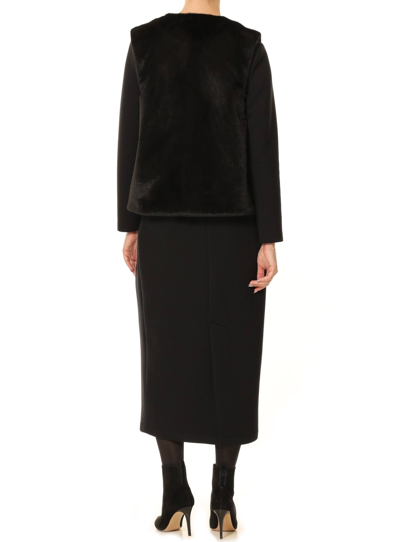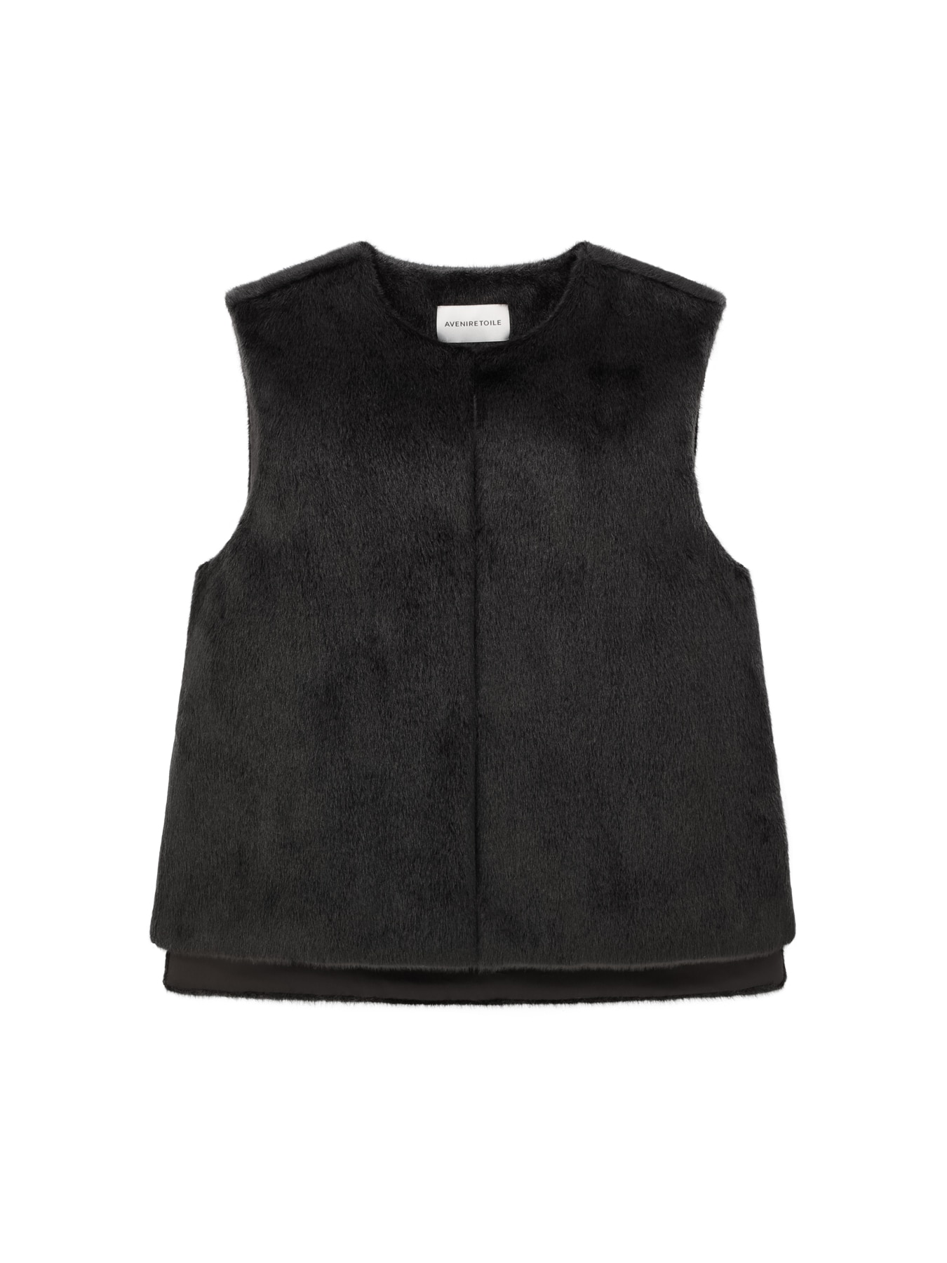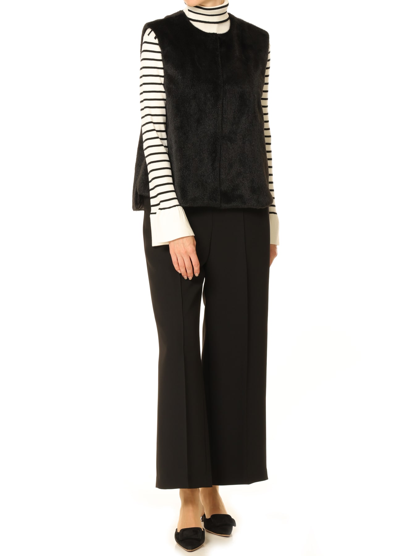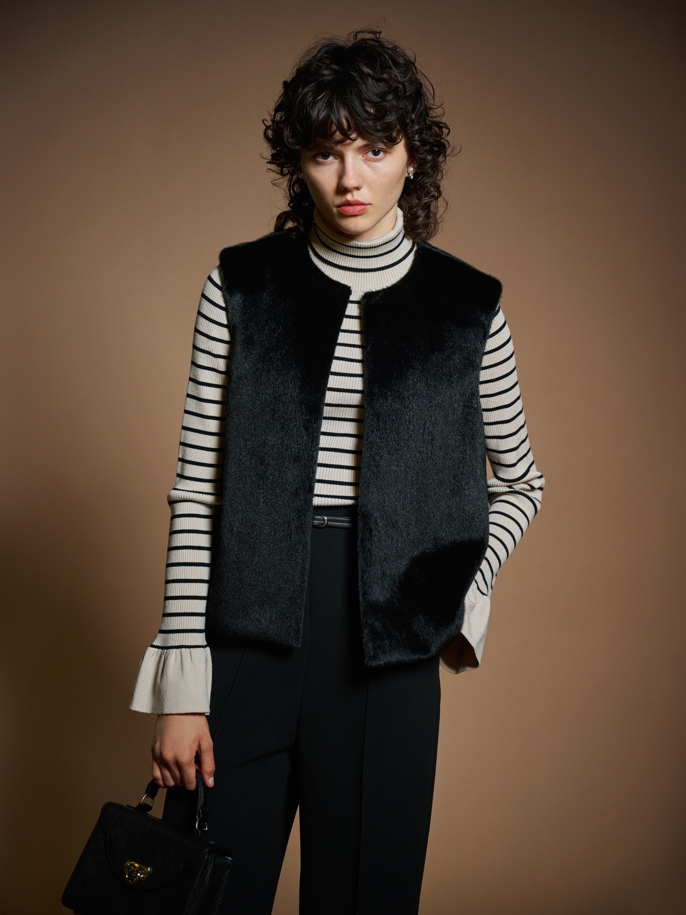 滑らかで美しい光沢感をもつエコ素材ながらも天然ファーのようなソフトな肌触りが魅力のエコファーを使用したベスト。シンプルなデザインにコンパクトな丈感で、バランスよく着こなすことができ、ファーアイテムにも挑戦しやすい一着。両裾にはスリットが入っていて、ややバックを長めに取ることで、ボリュームのあるボトムとも合わせやすいデザインです。身幅にはゆとりを持たせているのでインナーにはニットをあわせてももたつかず、幅広いコーディネートをお楽しみいただけます。 ・エコファー使用 ・中綿入り ・裏地あり ・フロントホック開き ・重量約440g ・ややゆとりのあるフィット。通常サイズをおすすめします。 ・モデル身長173cm/バスト85cm/ウエスト62cm/ヒップ90cm/38サイズ着用 【お問い合わせ品番】 S143-003
