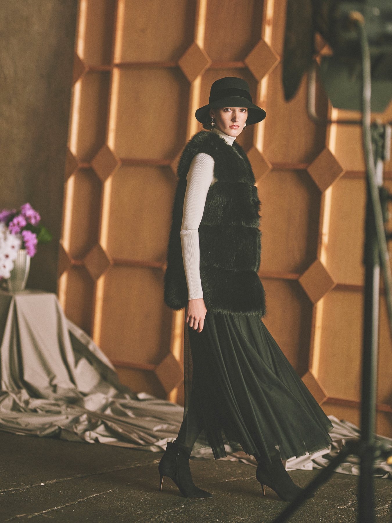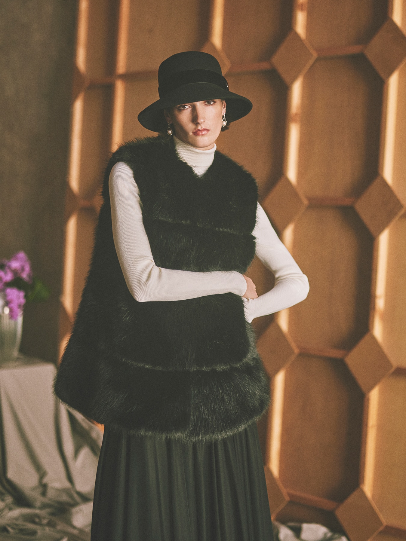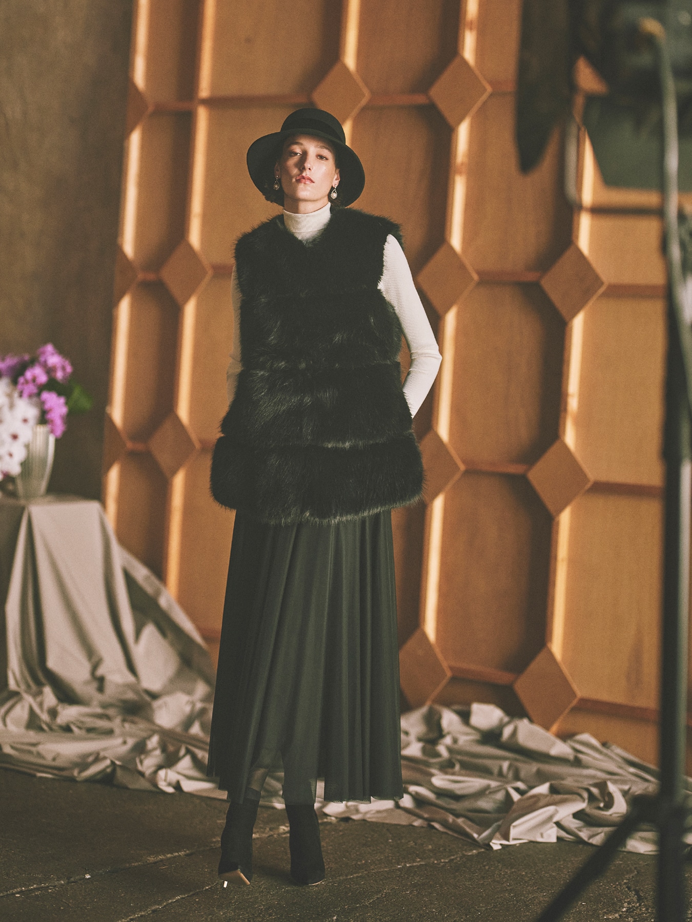 フランス・ECOPEL(エコペル)社の肌触りが良く上質なエコファーを贅沢に使用した、ボリュームのあるシルエットが高級感溢れるロングジレ。エコ素材ながらも天然ファーのような風合いが表現されたラグジュアリーな魅力を放つ一着です。切替デザインを施した部分にはスウェード調の生地を挟み込むことでリズミカルなシルエットが生まれ、コーディネートの仕上げに羽織るだけでドラマティックなムードを高めてくれます。シンプルなニットとパンツや落ち感のあるスカートに合わせてジレを主役にしたエレガンススタイルをお楽しみください。 ・エコファー使用 ・両脇ポケットあり ・裏地あり ・フロントホック開き ・重量約1090g ・ゆとりのあるフィット。通常サイズをおすすめします。 ・モデル身長173cm/バスト85cm/ウエスト62cm/ヒップ90cm/38サイズ着用 【ECOPEL(エコペル)】 2005年パリのフランス人、ジェラルド サルファティによってリュクスなエコファーブランド、エコペルは誕生しました。 地球環境保全・動物愛護に向き合い、天然のファーの美しさを再現するだけでなく、 リサイクルや機能性などエコロジーファーの可能性を追求しています。 【お問い合わせ品番】 WHITE:S143-005 BLACK:S143-006