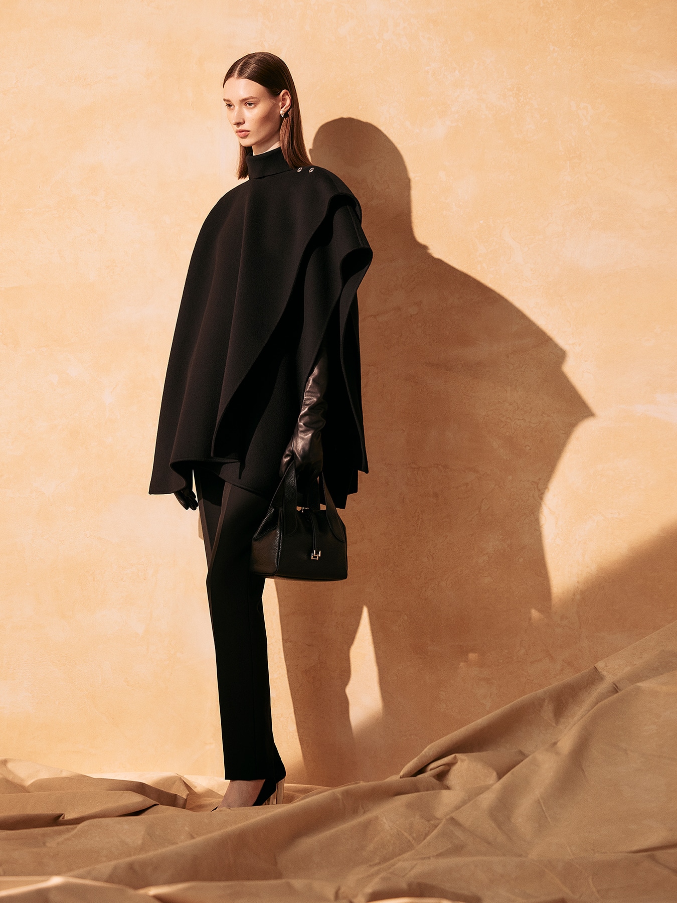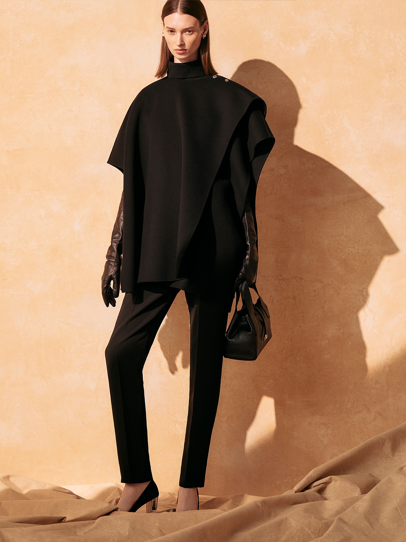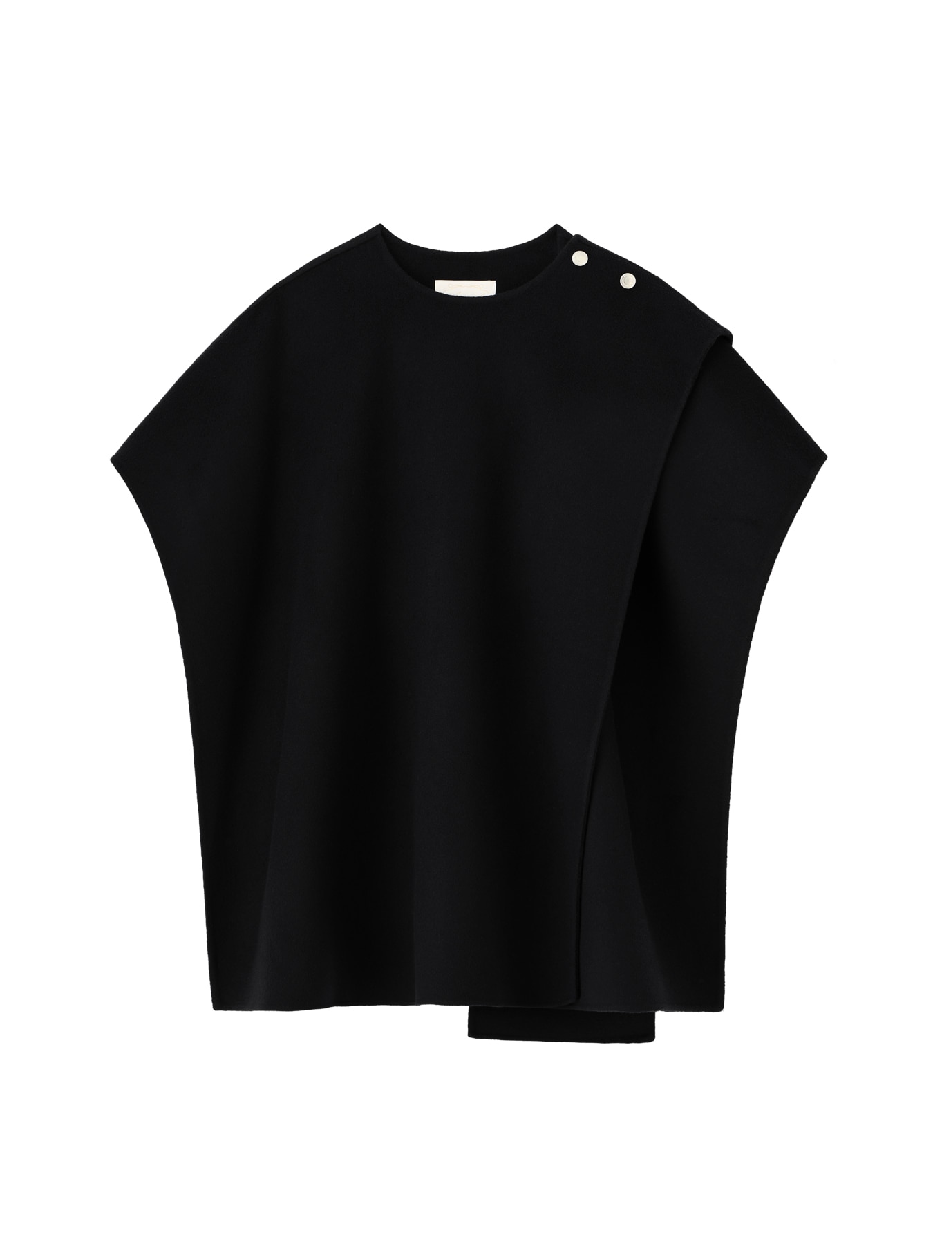 美しい光沢と滑らかな表面感をもつジーロンラムウール素材を使用した軽量で保温性に優れたリバー仕立てのケープ。左肩のスナップボタンで留めるだけのラップデザインで、シンプルなスタイルにさっと羽織るだけでエレガントな着こなしが叶います。左側にのみスリットデザインを施すことでストールを巻いているような立体的な動きが生まれ、シックな色味でも軽やかさを表現できます。上質な素材を使用したケープは大人の女性ならではのエレンガススタイルを表現でき、タイムレスにご愛用いただけます。 ・左肩スナップボタン開き ・両サイドは開いたデザイン ・裏地なし ・約740g ・ややゆとりのあるフィット。通常サイズでややゆとりをもって着用頂けます。 【お問い合わせ品番】 S241-008