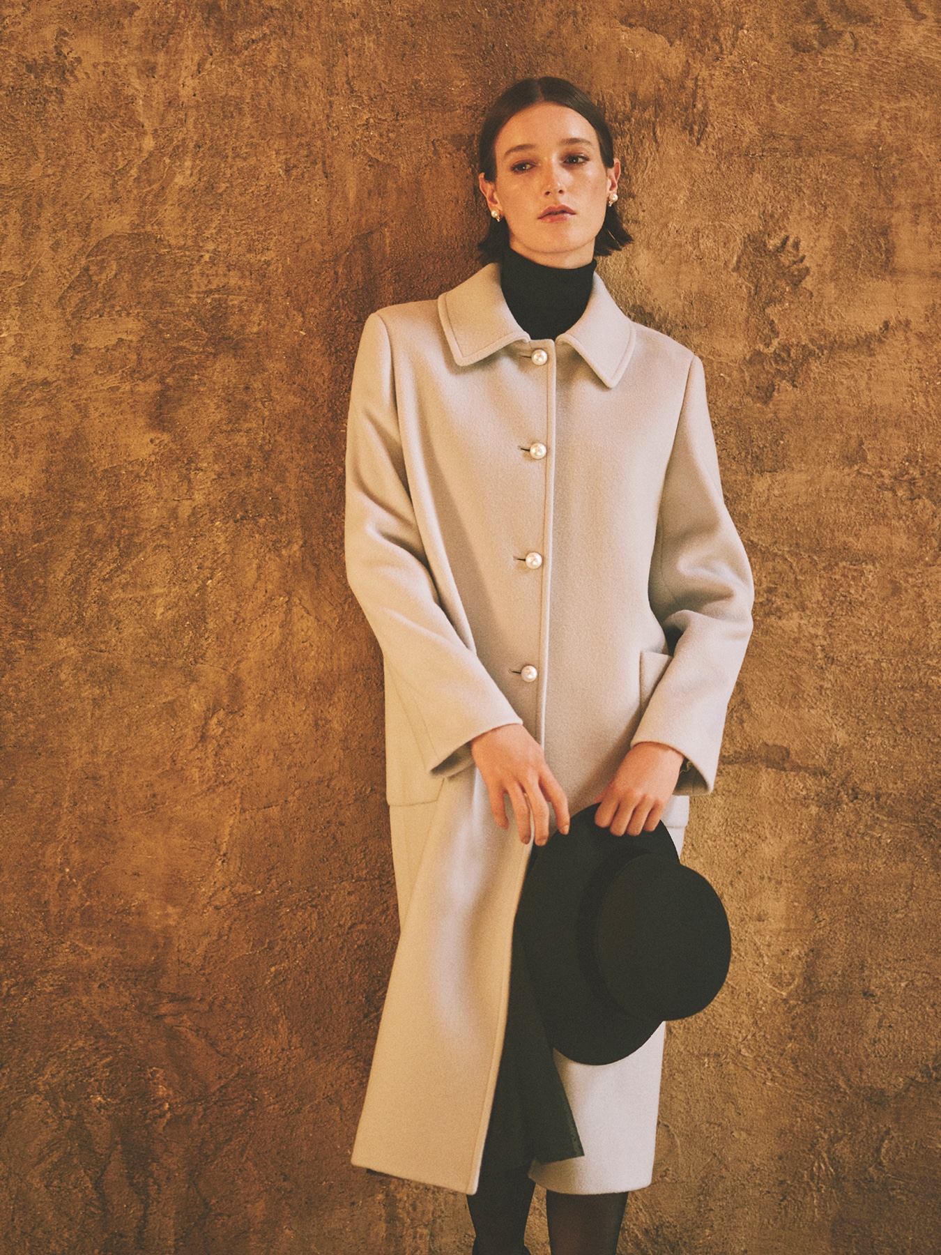 クラシカルなステンカラーが大人の女性らしい品格のある印象を与えてくれるロングコート。着こなしにしなやかで上質な印象を与えてくれる最高品質を誇るSuper170'sウールビーバー素材を使用。希少なラムウールの中でもカシミヤと同程度の15ミクロンの細さを誇り、光沢感、風合いは他のラムウールと一線を画すSuper170'sウールに、仕上げにシャルム加工を入れることで更なる光沢感と柔らかさを実現しました。フロントに施された大き目のパールボタンにはAVENIRETOILEのロゴマークの刻印を入れることで高級感漂い、エレガントさを際立たせるアクセントに。シンプルながらも一枚でラグジュアリーなスタイルを完成させてくれるロングコートはオンオフに幅広く着回していただくことができ、重宝いただけます。 ・裏地あり ・ポケットあり ・内ポケットあり ・フロントパールボタン開き ・重量約1430g ・ジャストフィット。通常サイズをおすすめします。 ・モデル身長173cm/バスト85cm/ウエスト62cm/ヒップ90cm/38サイズ着用 【お問い合わせ品番】 S243-008