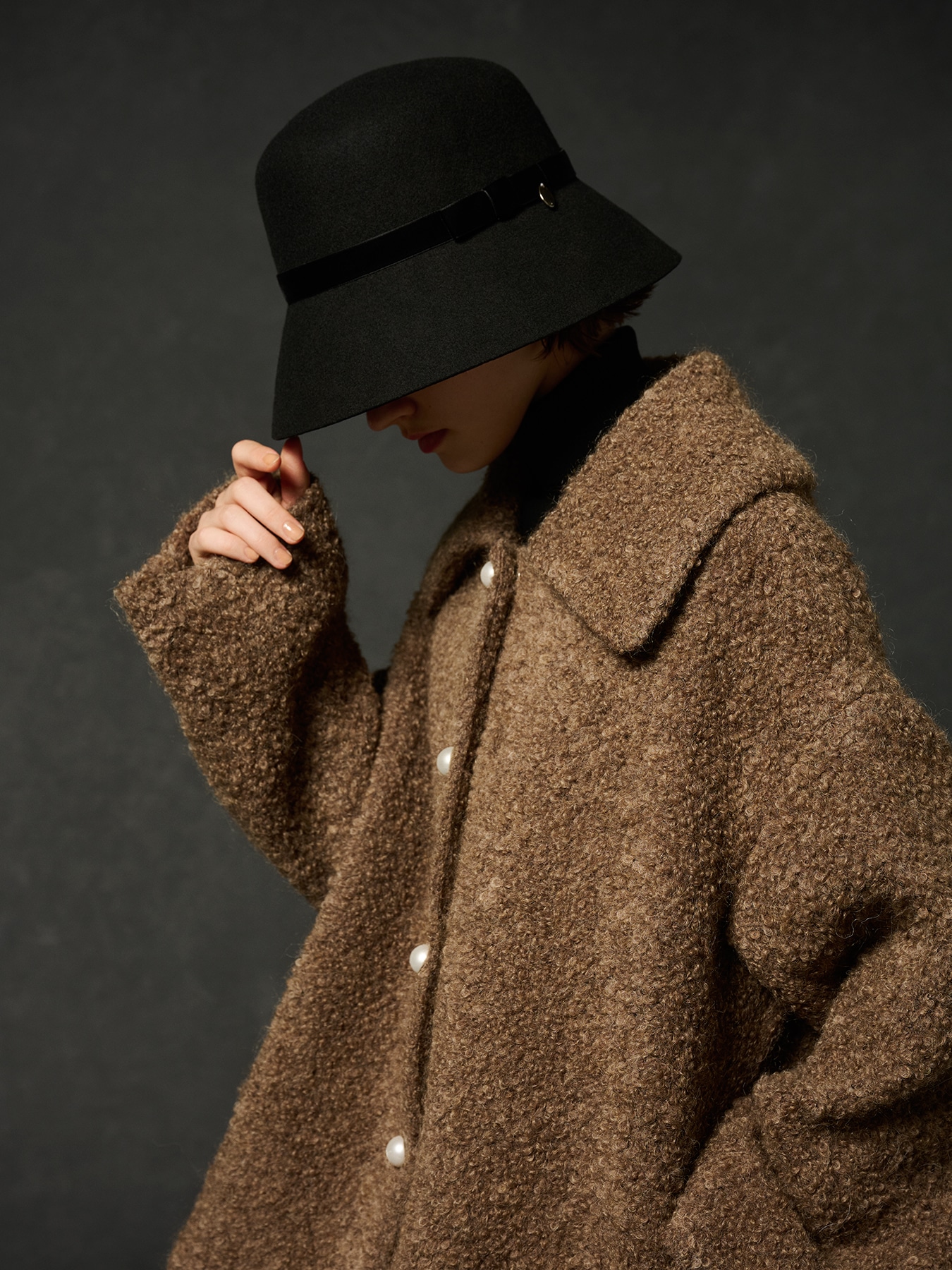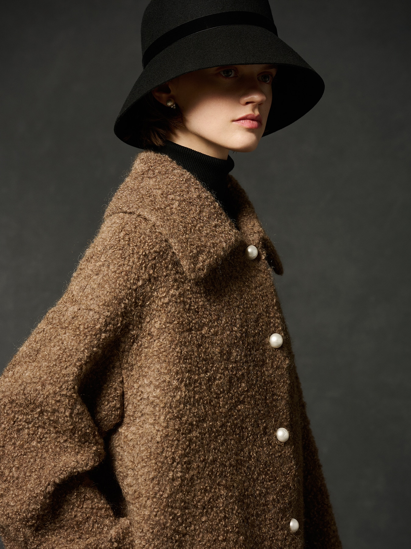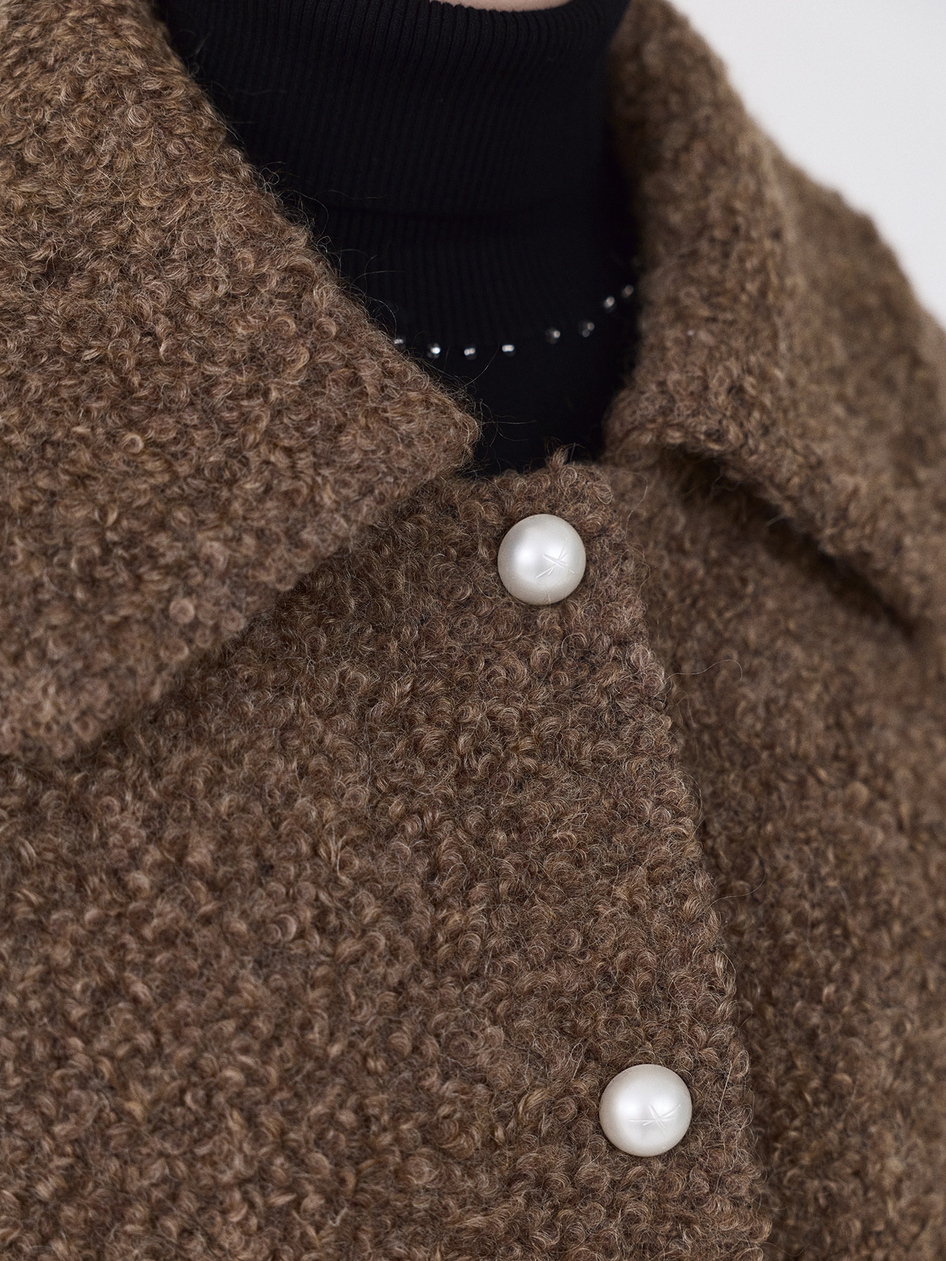 ふんわりとしたボア素材を使用した、優しい表情のショートコート。ゆとりのあるシルエットがリラックスした着心地を叶えつつ、フロントに並ぶ大粒のパールボタンがエレガントなアクセントとなり、華やぎを添えます。大きめの襟が顔まわりをすっきりと見せ、シンプルながらも洗練された印象に。スカートにもパンツにもバランスよく合わせやすい丈感で、デイリーからお出かけまで幅広いシーンに活躍する一枚です。 ・裏地あり ・フロントスナップボタン開き ・ポケットあり ・ややゆとりのあるフィット。通常サイズでゆとりをもってお召しいただけます。 【お問い合わせ品番】 S246-007