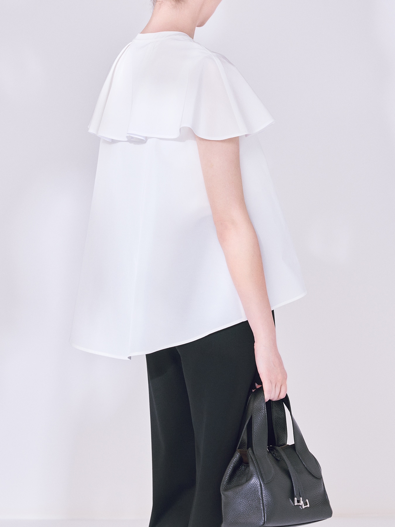 トリアセテートとポリエステルの合撚糸を用いたツイル素材で仕立てた、上品な光沢と落ち感が魅力のブラウス。しなやかで軽やかな着心地がありながら、程よいハリが美しいフォルムを保ち、エレガントな佇まいを演出します。ケープのように広がる襟デザインが肩まわりをやさしく包み込み、二の腕をさりげなくカバーしながら華やかな印象を添えてくれるのもポイントです。フロントは比翼仕立てにすることで、装飾を抑えたすっきりとした表情に仕上げ、洗練された雰囲気を引き立てています。パンツと合わせれば、素材の上質感が際立つ凛とした通勤スタイルに。テーパードやワイドシルエットとも好相性で、きちんと感がありながらも軽やかな印象を保てます。スカートと組み合わせると、ケープ風のデザインが女性らしさを一層引き立て、柔らかな華やぎのある装いに。シーンに合わせて表情を変えながら、オンオフ問わず活躍する一枚です。 ・WHITEは透け感あり ・フロント比翼ボタン開き ・パールボタン部分にアイロンをあてますと、傷が入る可能性がございますので、ご注意ください。 ・スチーム可能 ・ジャストフィット。通常サイズをお勧めします。 【お問い合わせ品番】 S347-006