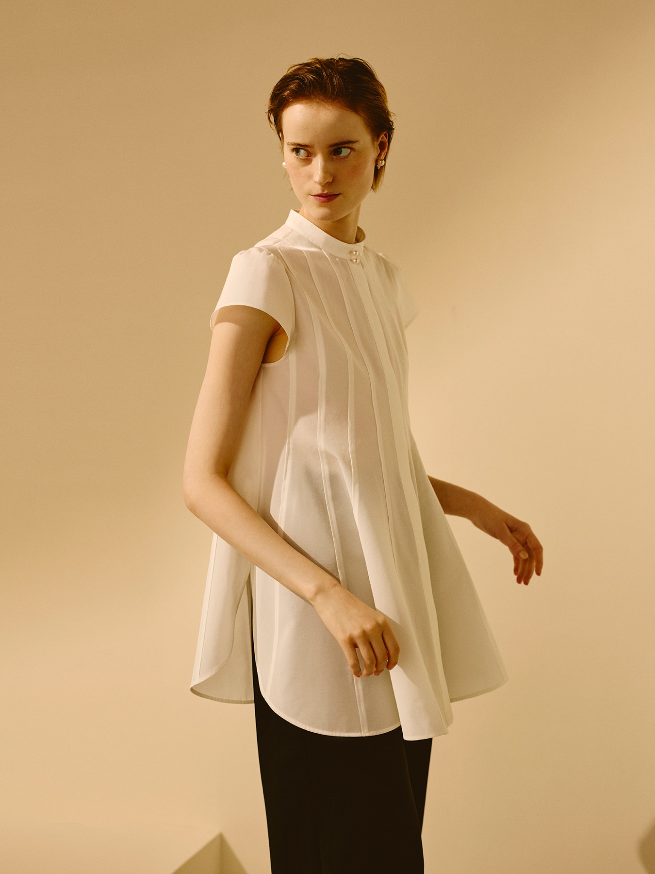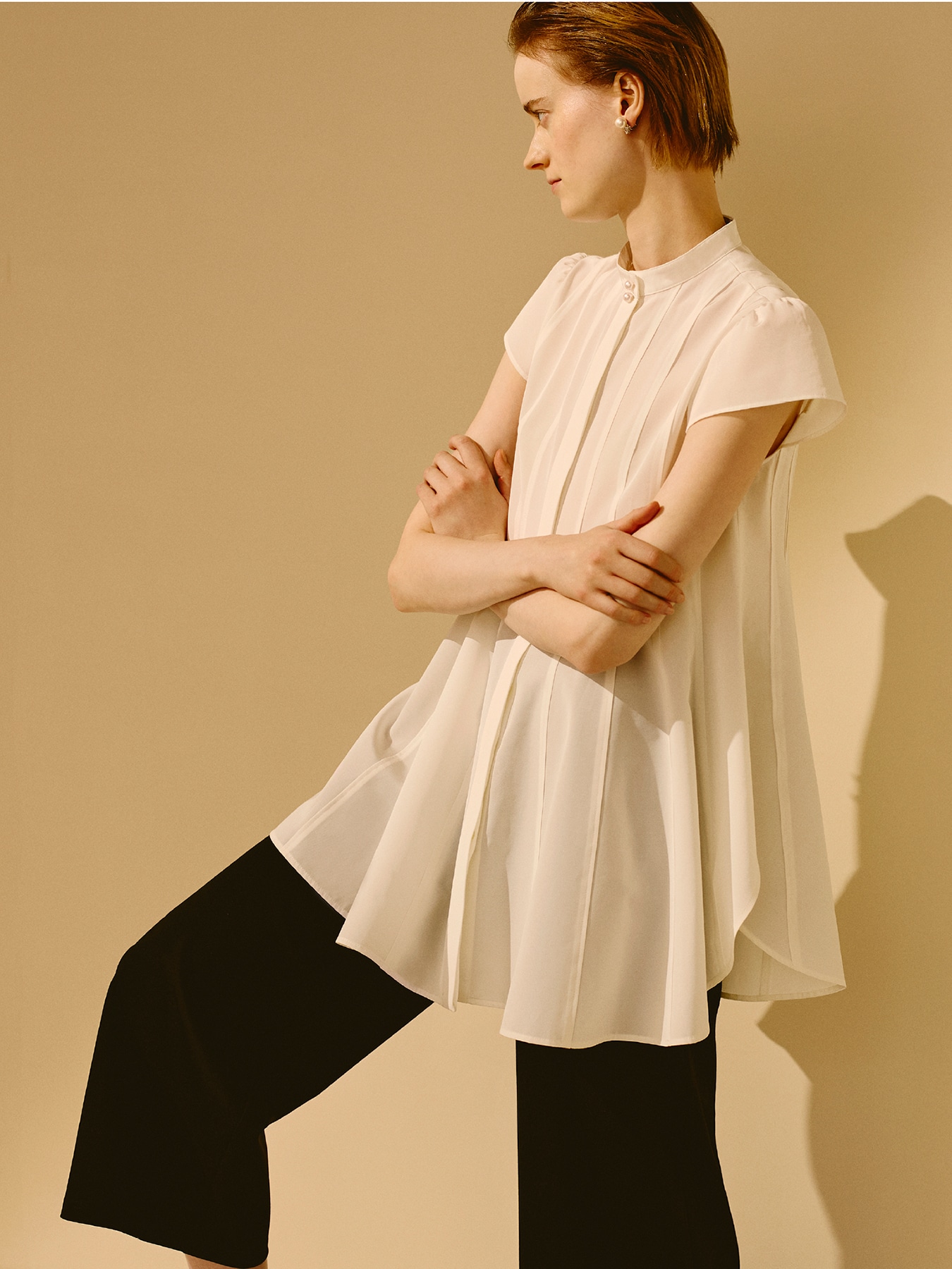ハリのあるトリアセテートをメインに使用したタイプライター生地が、美しいフォルムと上質な佇まいを引き立てるブラウス。軽やかでありながら程よい構築感を持ち、動くたびに生まれる立体的なシルエットが洗練された印象へと導きます。フロントに施された繊細なピンタックが縦のラインを強調し、すっきりとしたバランスを叶えつつ、上品なバンドカラーが顔まわりに凛とした華やぎをプラス。長めの丈感とさりげなく肩を包み込むキャップスリーブが、気になる部分をカバーしながら女性らしい柔らかさも演出してくれます。オンシーンにはテーパードパンツやセンタープレスパンツを合わせて、端正で知的な印象に。きちんと感が求められる場面でも、品格あるスタイリングが完成します。オフの日にはデニムやレギンスと合わせることで、程よく抜け感のあるエレガントカジュアルに。シンプルなパンツに合わせるだけでレディなスタイリングを完成させていただけるお勧めの一着です。 ・WHITEは透け感あり ・フロント比翼ボタン開き ・スチーム可能 ・ボタン部分にアイロンをあてますと、傷が入る可能性がございますので、ご注意ください。 ・ジャストフィット。通常サイズをお勧めします。 ・モデル身長171cm/バスト82cm/ウエスト60cm/ヒップ88cm/38サイズ着用 【お問い合わせ品番】 S347-011