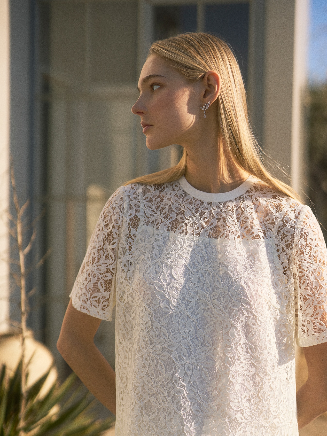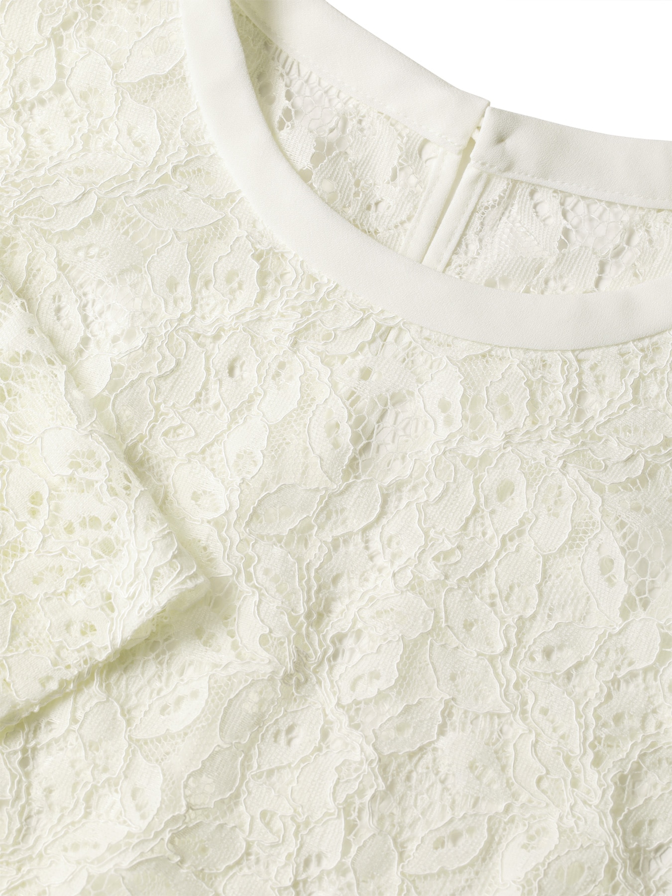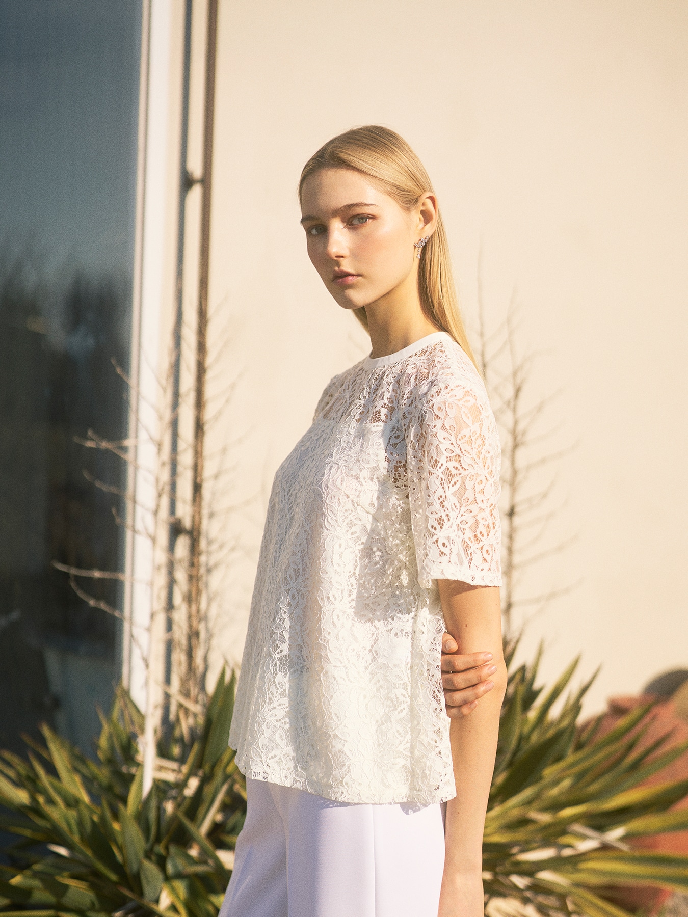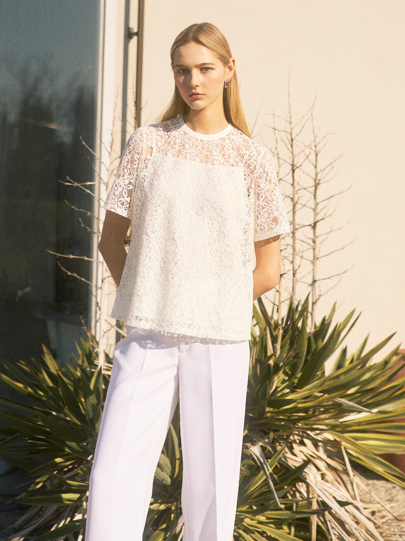 繊細なリーフ柄が全面に施された総レース素材が、上品な華やぎを纏うエレガントなブラウス。軽やかな透け感と奥行きのある表情が魅力で、シンプルなシルエットながらも存在感のある一着に仕上がっています。程よくゆとりのあるフォルムが優雅な印象を与え、着るだけで洗練されたスタイルへと導いてくれます。スカートスタイルには、フレアスカートやタイトスカートと合わせることで、レースの繊細さを引き立てた女性らしいエレガントな装いに。ワントーンでまとめることで、より品のある洗練された印象に仕上がります。パンツスタイルには、テーパードパンツやワイドパンツと合わせて、甘さを程よく抑えたモダンな着こなしに。デニムと合わせれば、レースの華やかさを活かした大人のカジュアルスタイルもお楽しみいただけます。一枚で着映えし、オンオフ問わず幅広いシーンで活躍する、上品さと華やかさを兼ね備えた一着です。 ・ご家庭で手洗いが可能 ・透け感あり ・インナーキャミソール付属 ・後ろ襟ぐりスリット開き ・スチーム可能ですが、過度なスチームを当てることにより、水分を多く含んでしまうと縮みや波打ちが発生しやすくなりますのでご注意ください。 ・ジャストフィット。通常サイズをおすすめします。 【お問い合わせ品番】 S347-037