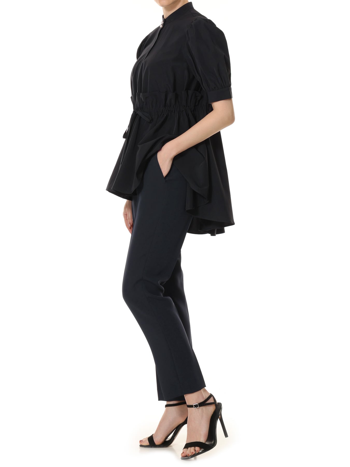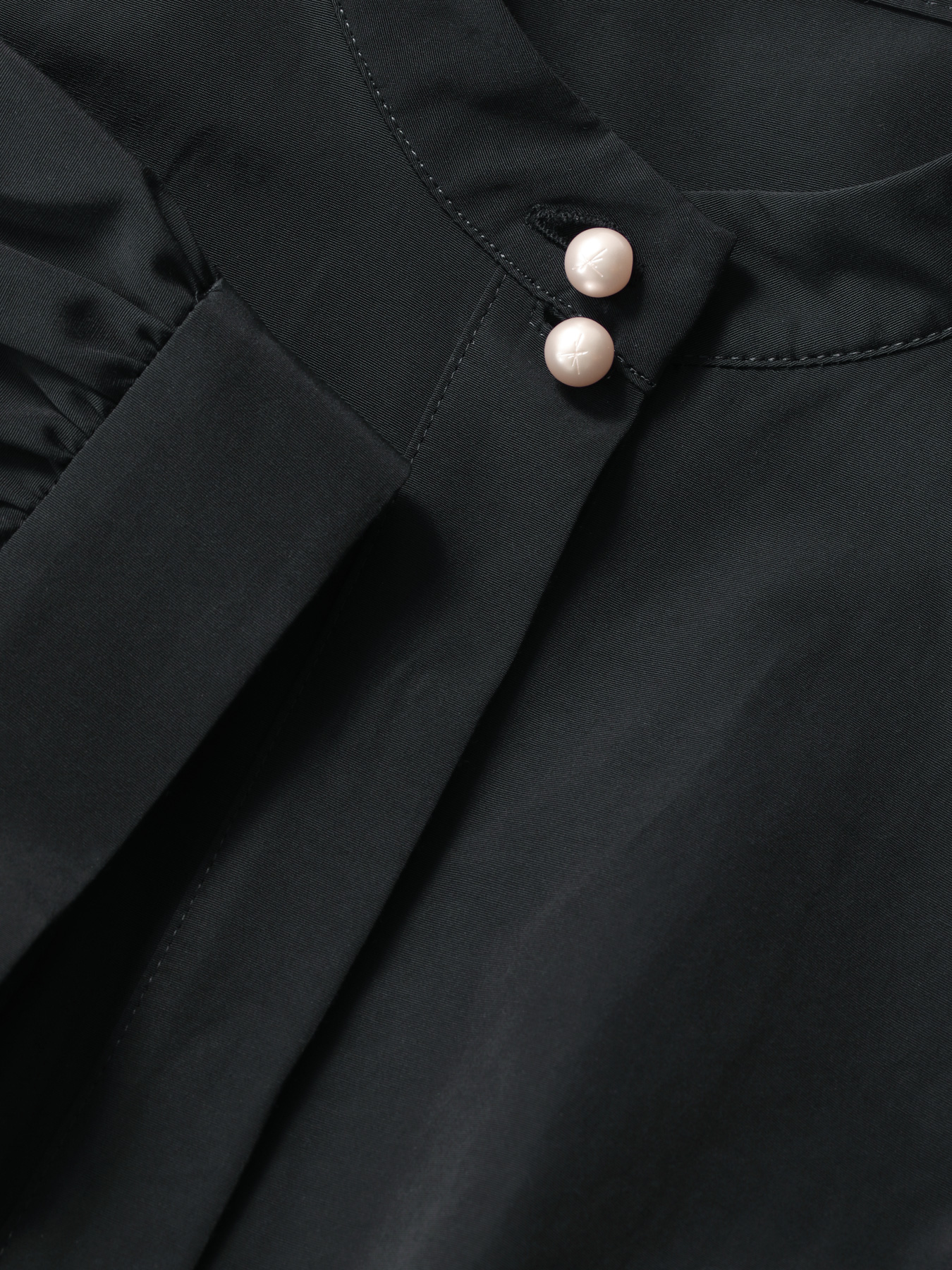ボリュームのあるギャザー切替のデザインと上品なパフスリーブが印象的なブラウス。上品なツヤ感とややハリのあるトリアセコットンタイプライター生地を使用することにより、美しいシルエットをキープしてくれます。ギャザー切替がほどこされたウエスト部分にはリボンを施すことによりフリルのようにふわりと仕上がり華やかな印象に。バンドカラーの襟デザインによってお顔周りはすっきりと、パフスリーブは袖口をカフスデザインにすることで品格あるシルエットが完成。ヒップをカバーしてくれる長めの丈感でトップスアウトでもバランスが取りやすく、パンツコーデに重宝いただけます。 ・透け感あり ・フロント比翼ボタン開き ・スチーム可能ですが、過度なスチームを当てることにより、水分を多く含んでしまうと縮みや波打ちが発生しやすくなりますのでご注意ください。 ・身幅はややゆとりのあるフィット。通常サイズでゆとりをもって着用頂けます。 ・モデル身長173cm/バスト85cm/ウエスト62cm/ヒップ90cm/38サイズ着用 【お問い合わせ品番】 S347-038