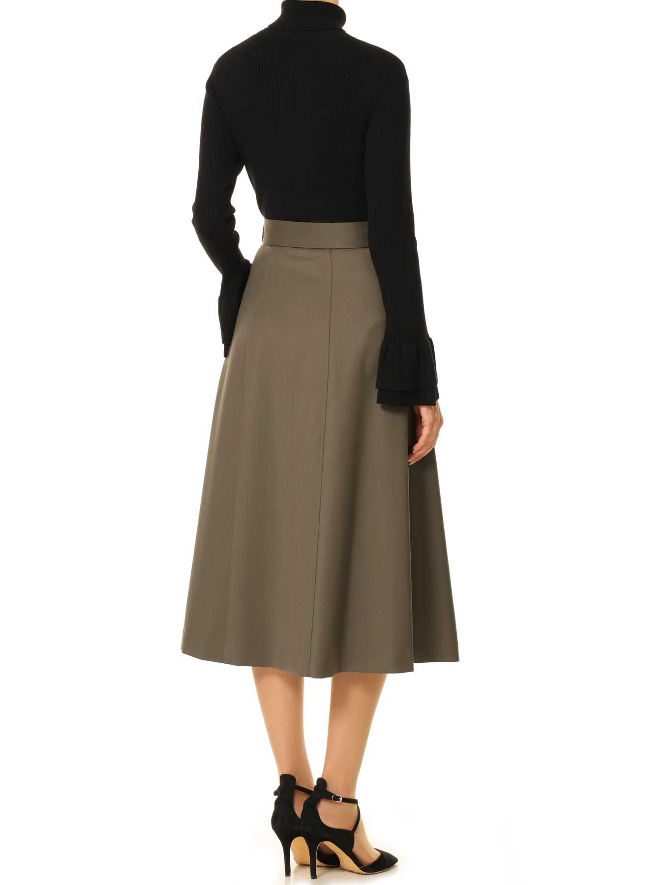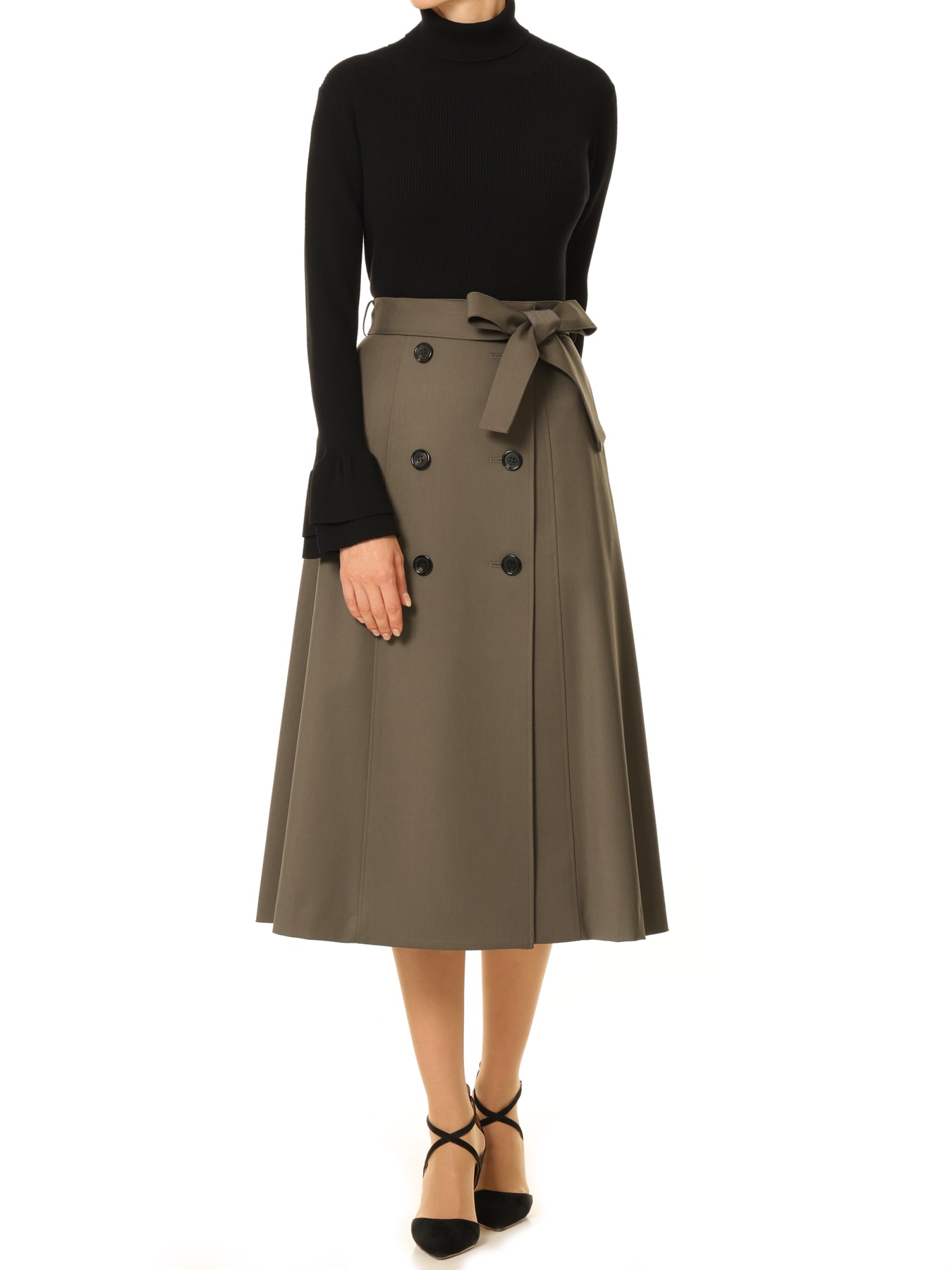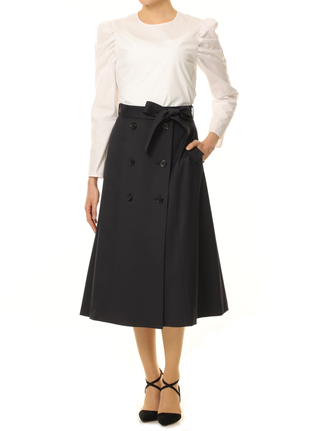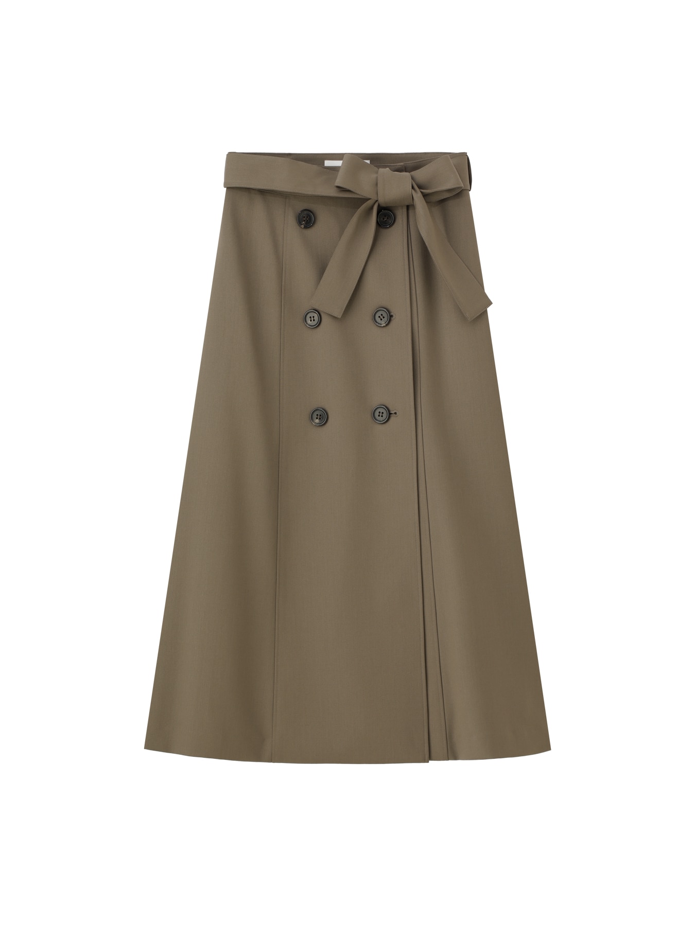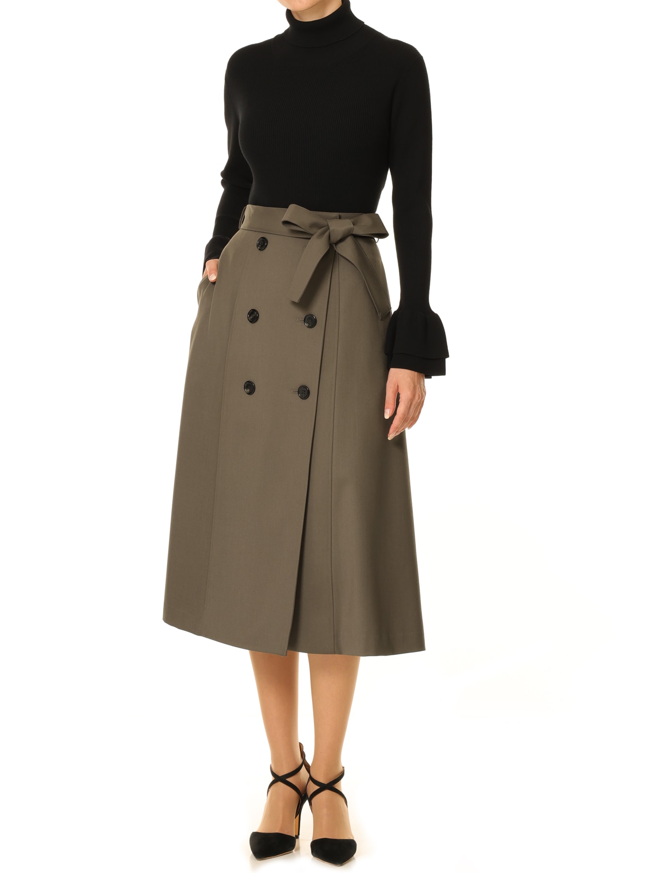 トレンチ風のデザインが品格ある印象を与えてくれるフレアスカート。クラシカルな雰囲気のボタンデザインが上品なオーラを纏い、共布のリボンでウエストマークすることでメリハリのあるシルエットが完成します。トレンド感たっぷりな着こなしを実現しながら、美しい光沢感と程よい厚みをもつウール混の生地を使用することで高級感に溢れ、行事ごとやお食事会などきちんとしたシーンにも着回していただけます。シンプルなニットやブラウスに合わせるだけでエレガントな装いを確立させてくれる主役級のスカートです。 ・裏地あり ・ウエストリボンベルト取り外し可能 ・フロントボタン開き ・両サイドシームポケットあり ・スチーム可能 ・ジャストフィット。通常サイズをお勧めします。 ・モデル身長173cm/バスト85cm/ウエスト62cm/ヒップ90cm/38サイズ着用 【お問い合わせ品番】 S443-005