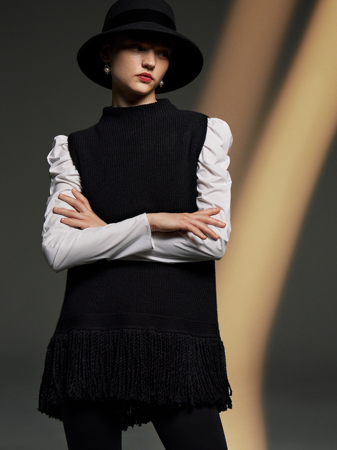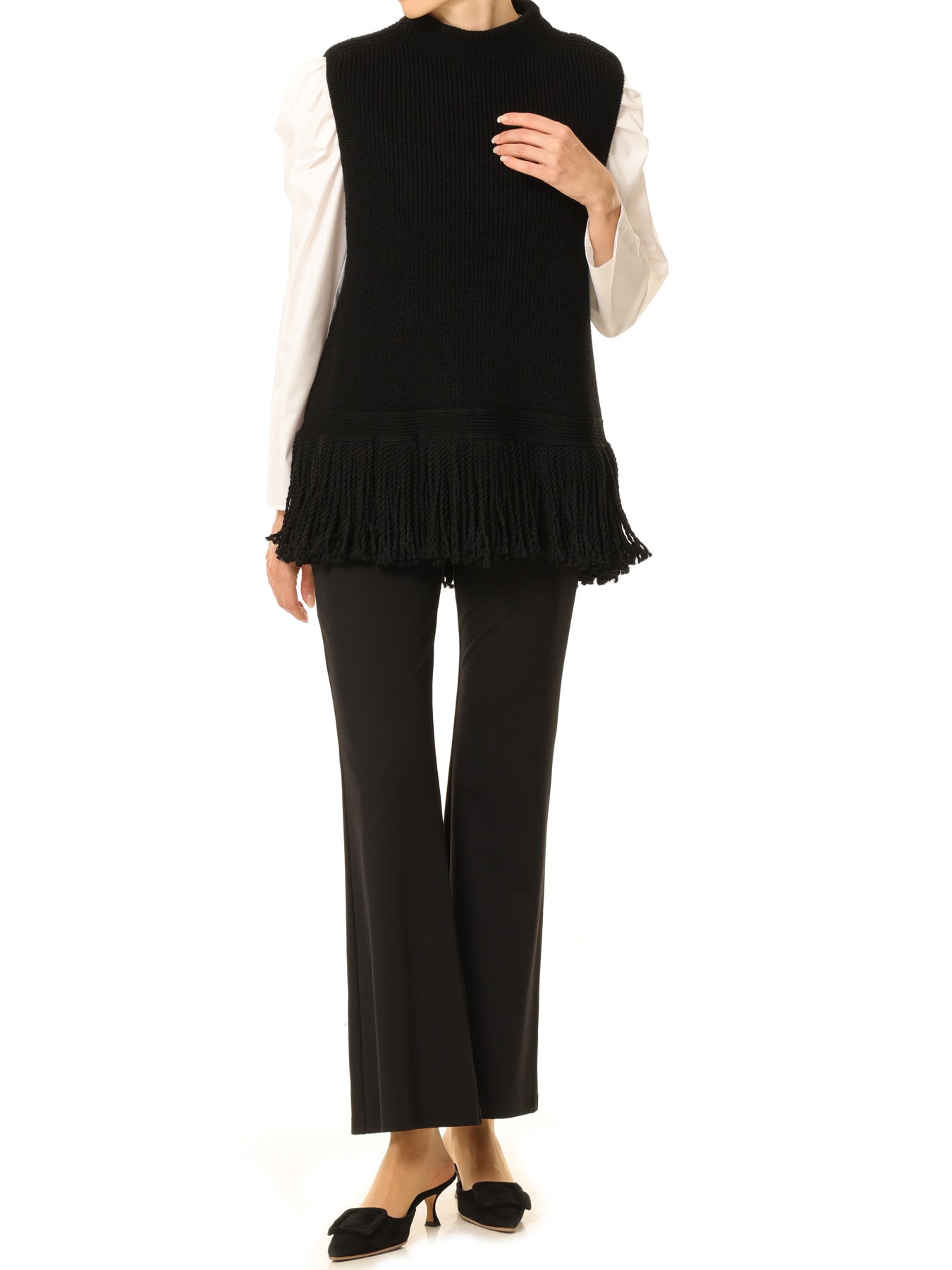 厚みのある素材感でざっくりとしたリブ編みのニットがこなれ感を演出してくれるニットジレ。裾にはフリンジを施すことで着こなしに動きが生まれ、シンプルなパンツに合わせるだけで、程よく肩の力を抜いた上質なエフォートレススタイルが完成させていただけます。ふっくらとしたウール混の素材を使用し、首元に美しく沿うハイネックが綺麗目できちんと感のある印象を与えてくれます。カットソーやブラウスなどとレイヤードするとこなれた印象が完成します。 ・ジャストフィット。通常サイズをおすすめします。 ・モデル身長173cm/バスト85cm/ウエスト62cm/ヒップ90cm/38サイズ着用 【お問い合わせ品番】 S743-061