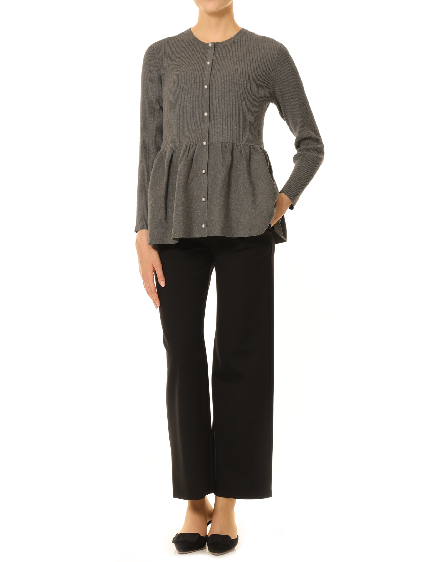 リブニットと総針ニットで切り替えた、表情豊かなペプラムカーディガン。フロントにはパールボタンをあしらい、シンプルな中にも女性らしい華やぎを添えています。ウエストからふんわり広がるペプラムシルエットがスタイルアップを叶え、エレガントな印象に仕上げてくれる一枚。オンスタイルでは、センタープレスの効いたパンツと合わせて、きちんと感と上品さを兼ね備えた通勤スタイルに。オフスタイルでは、レギンスと合わせてすっきりとしたシルエットを楽しむのはもちろん、ワイドパンツとのリラクシーなコーディネートもおすすめです。着こなし次第で幅広く活躍する、頼れるアイテムです。 ・ご家庭で手洗い可能 ・フロントパールボタン開き ・ジャストフィット。通常サイズをお勧めします。 【お問い合わせ品番】 S746-032
