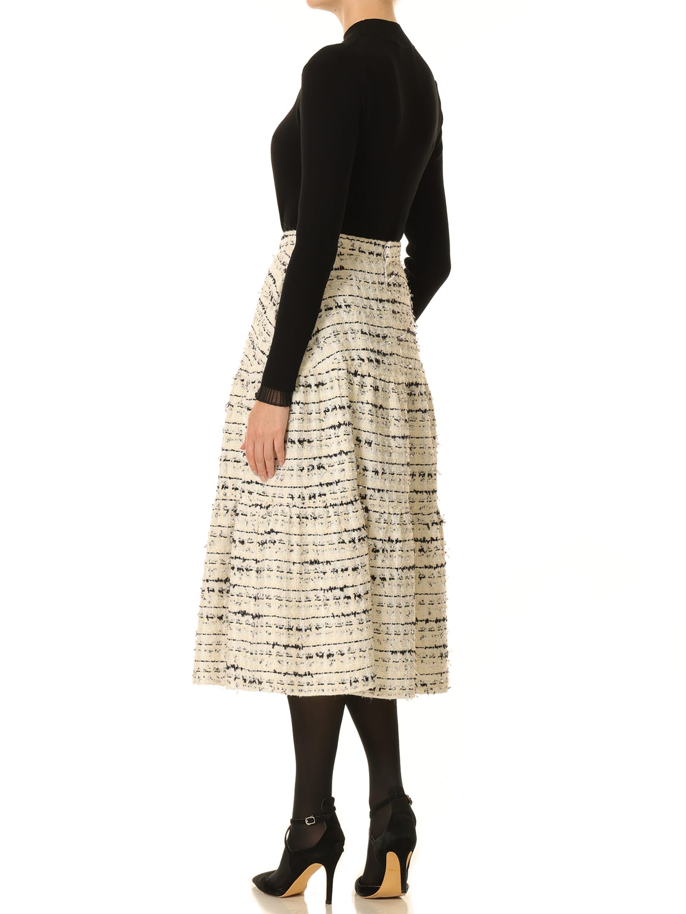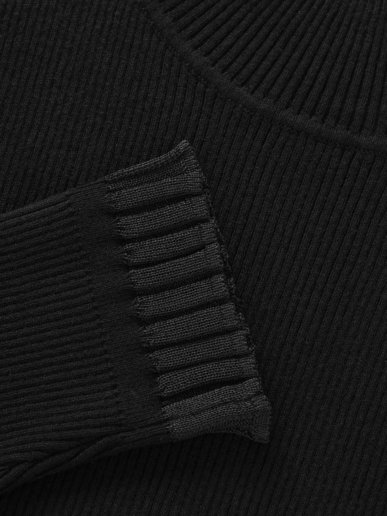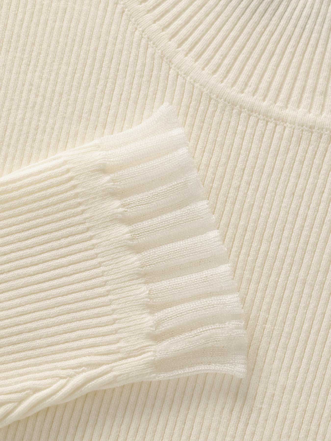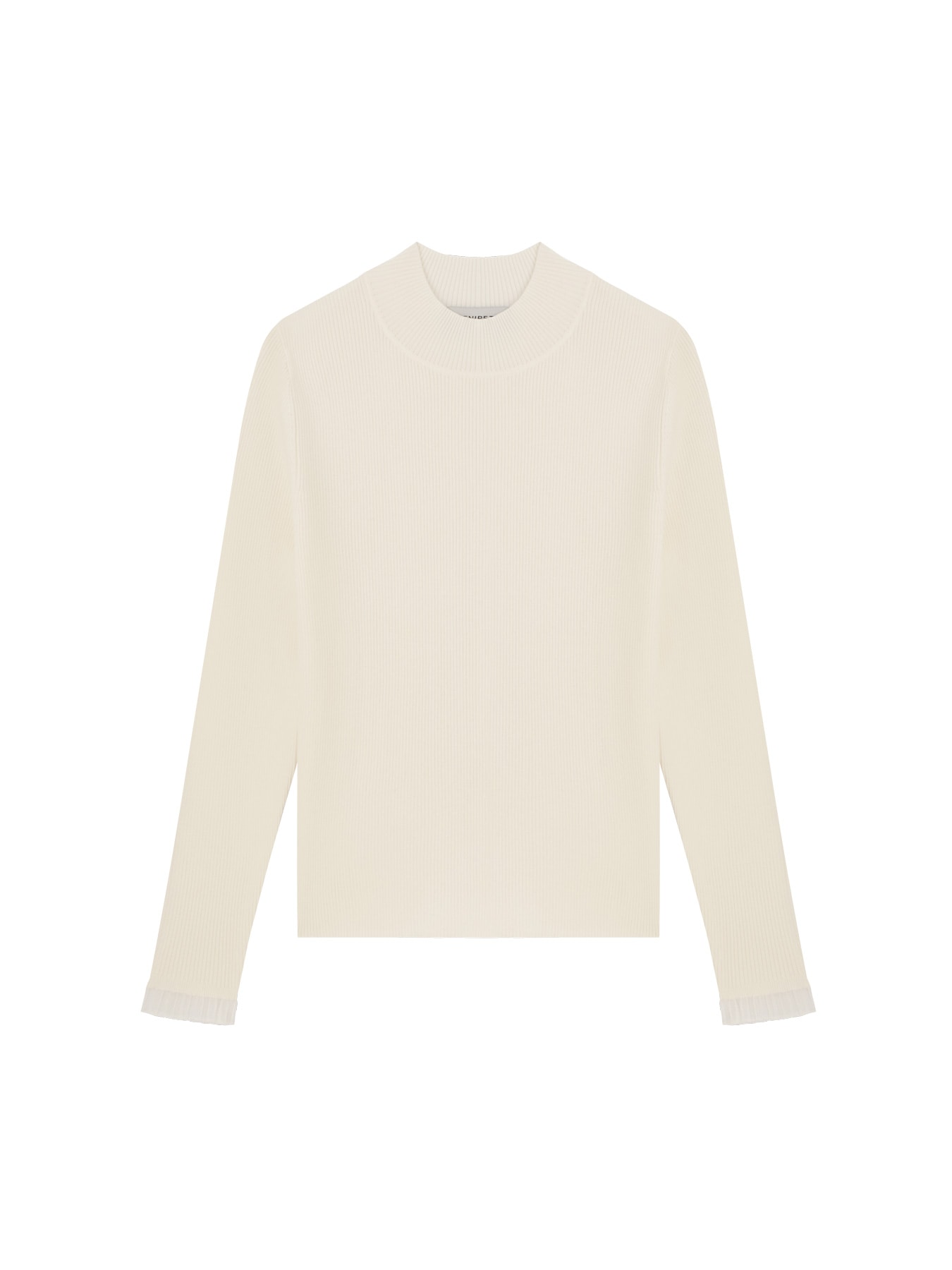 リブ編みのコンパクトなシルエットが美しいラインを引き立てる、エレガントなニットトップス。袖口には繊細なチュールのフリルをあしらい、フェミニンな華やぎを添えています。レーヨンベースの素材は柔らかく、手洗い可能な実用性も兼ね備えた一枚。スカートに合わせればフリルが際立ち、レディライクなスタイルに。パンツと合わせれば、コンパクトなシルエットがシャープさを引き立て、都会的で洗練された印象に仕上がります。オンからオフまで幅広いシーンで活躍する、ワードローブに欠かせないアイテムです。 ・ご家庭で手洗いが可能 ・OFF WHITEは透け感あり ・ジャストフィット。通常サイズをお勧めします。 【お問い合わせ品番】 S746-063