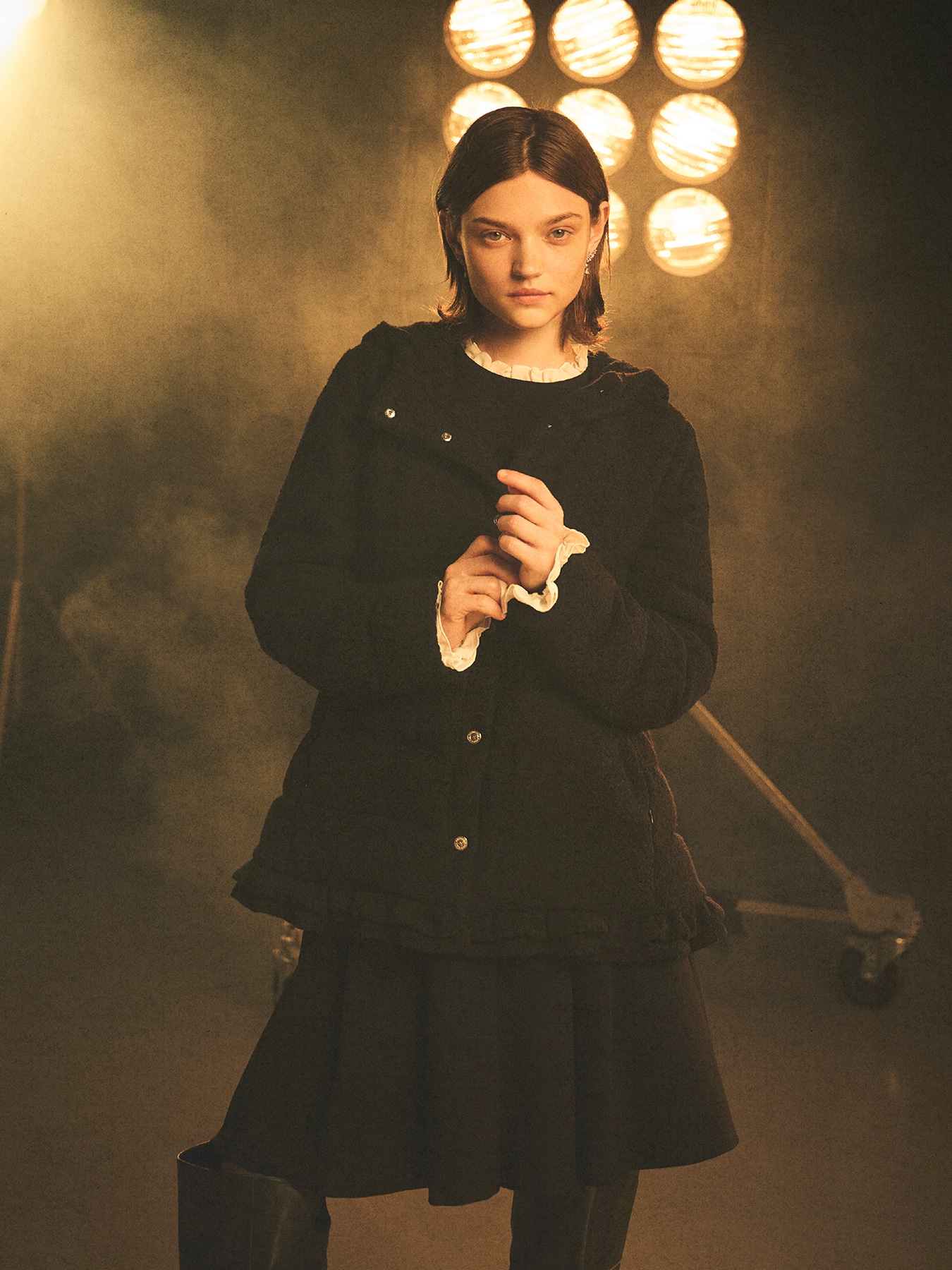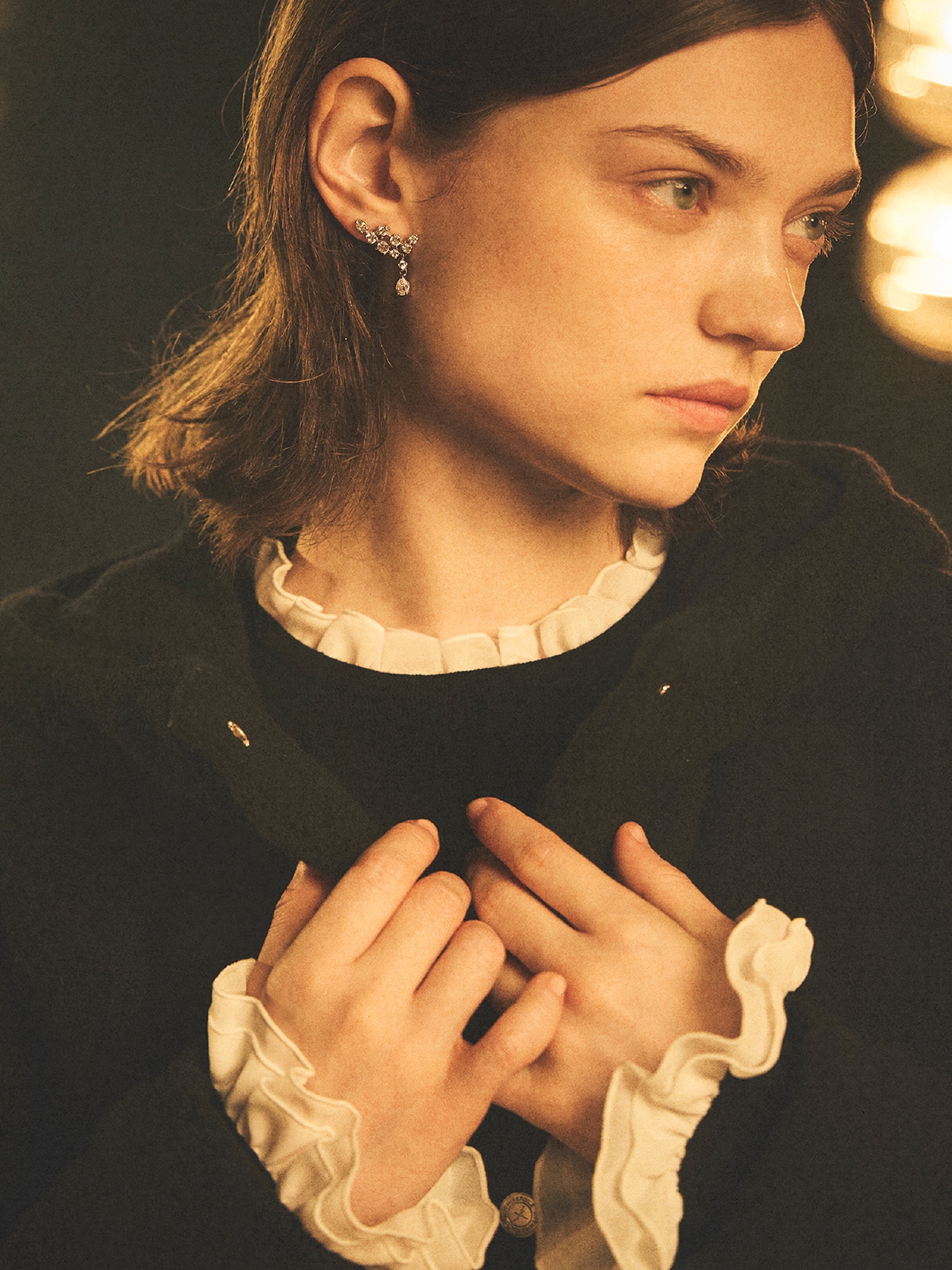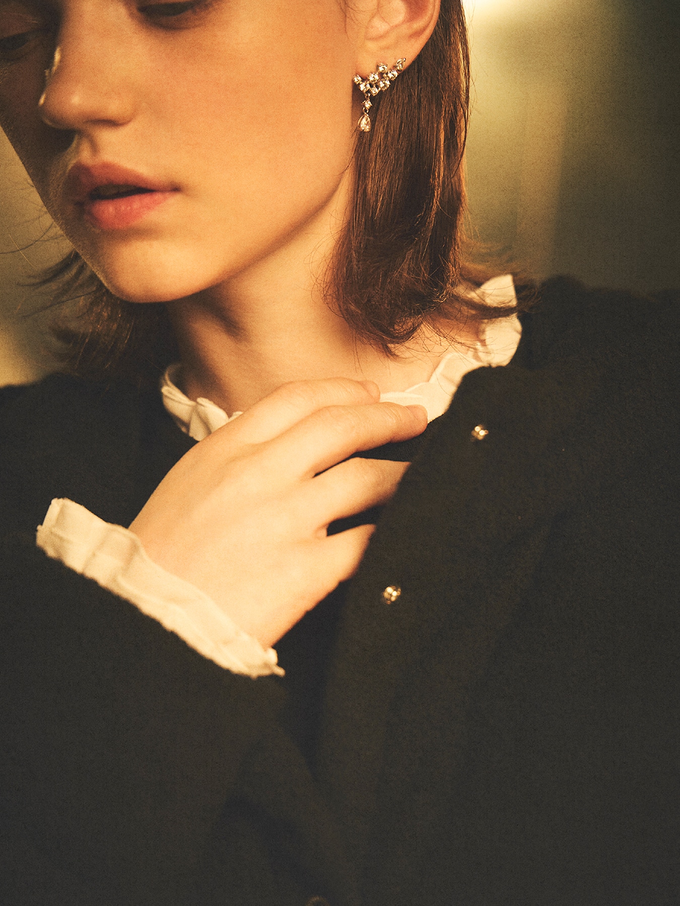 襟ぐりと袖口にシフォンのフリルをあしらった、女性らしい華やぎを添えるニットプルオーバー。薄手で柔らかな素材感が心地よく、上品で繊細なディテールが大人のエレガントな雰囲気を引き立てます。シンプルなシルエットながらも、フリルのアクセントによって一枚で着映えするデザインです。パンツと合わせれば知的で洗練された印象に、スカートと合わせればフェミニンで華やかなスタイルに。さらに、アウターからフリルを覗かせれば、さりげなく女性らしさを演出でき、コーディネート全体をクラスアップさせます。オンからオフまで幅広く活躍する、ワードローブに加えたい一枚です。 ・フリル取り外し不可 ・ジャストフィット。通常サイズをお勧めします。 【お問い合わせ品番】 S746-065
