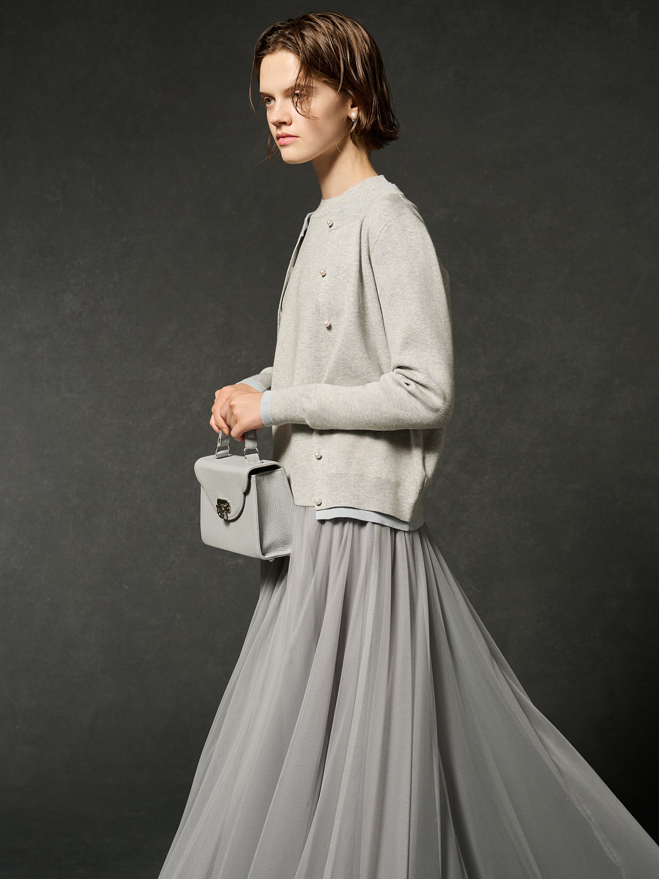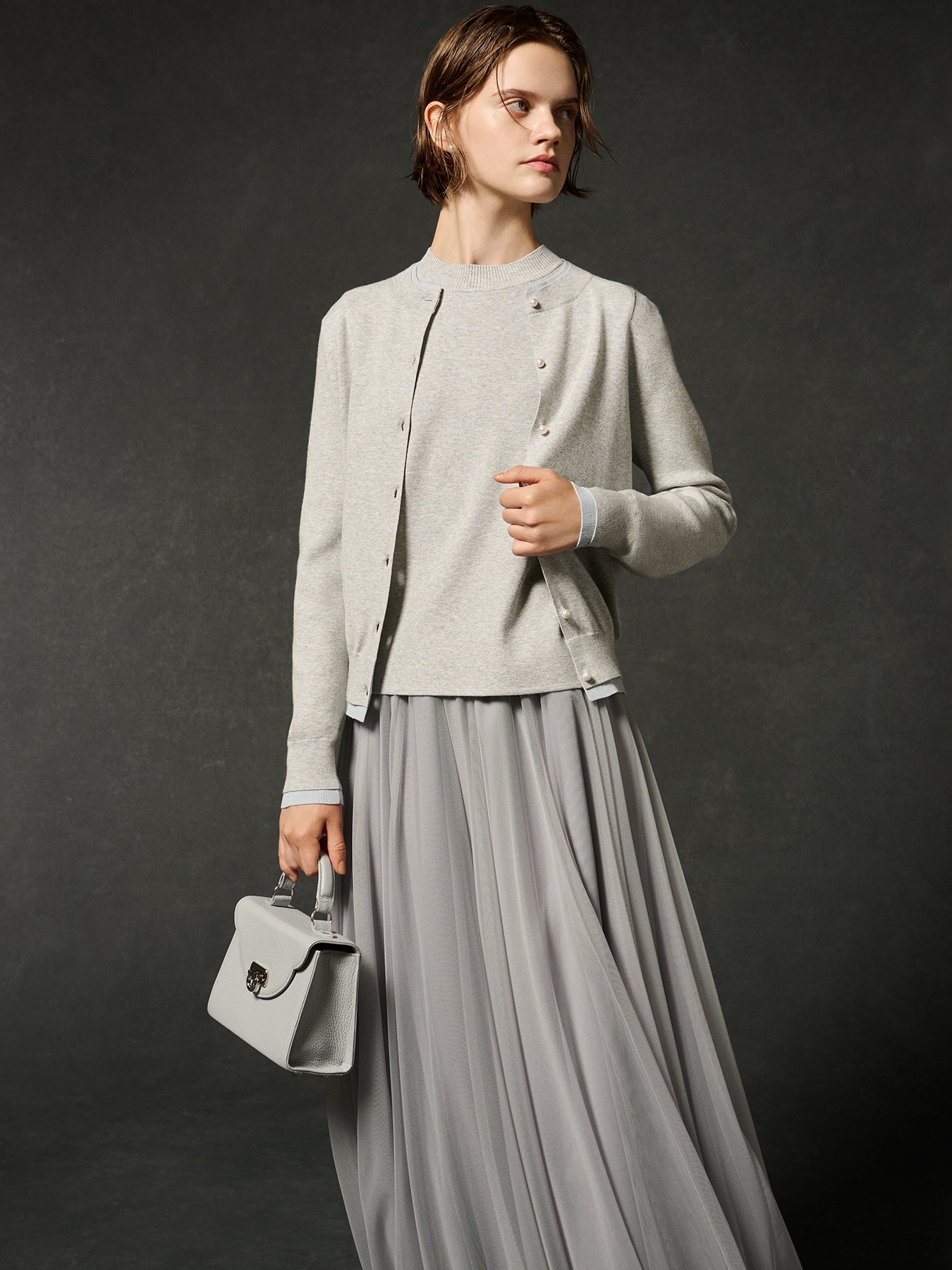 柔らかなレーヨンベース素材を使用した、上品な風合いのニットカーディガン。襟ぐり・袖口・裾のリブ部分を2重仕立てにし、さりげない配色デザインで奥行きのある表情を添えました。フロントにはブランドロゴマーク入りのパールボタンを並べ、クラシカルで華やかな印象に。スカートやワンピースに合わせればフェミニンで優雅な雰囲気を演出し、パンツスタイルに合わせれば知的で洗練された印象に。オンオフ問わず活躍し、季節を超えて着回せる万能な一枚です。ハイネック半袖ニットプルオーバー(S746-058)とアンサンブルとして着こなせば、より一層エレガントな装いに仕上がります。 ・ご家庭で手洗い可能 ・スチーム可能 ・パールボタン部分にアイロンをあてますと、傷が入る可能性がございますので、ご注意ください。 ・ややゆとりのあるフィット。通常サイズをお勧めします。 【お問い合わせ品番】 S746-053