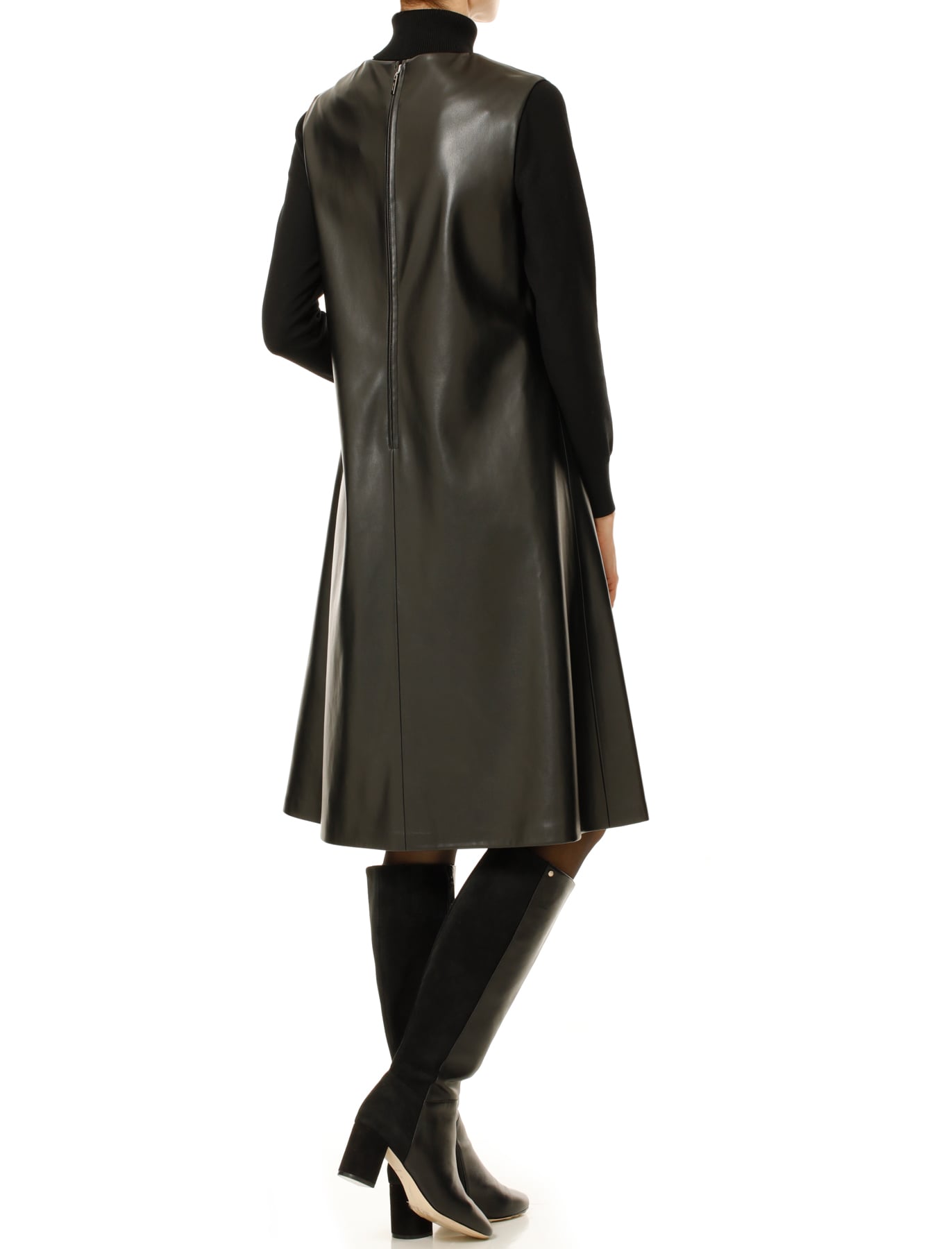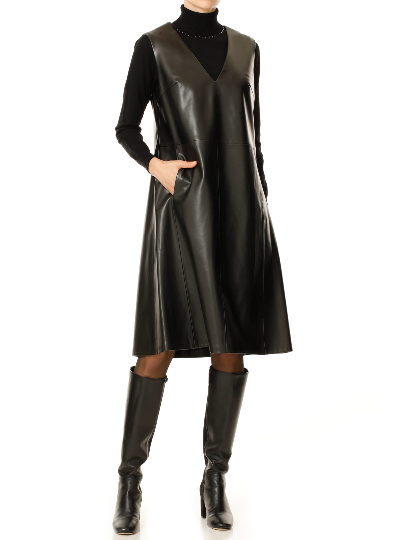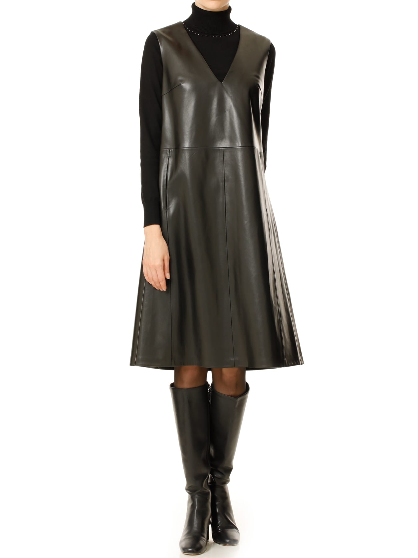ラムスキン風の質感をもつ滑らかなフェイクレザーを使用したジャンパースカート。ウエストあたりから切替デザインを施すことにより立体感が生まれ、レザーの重厚感を感じさせません。すっきりとしたVネックでにタートルネックニットとの相性も良い一着。フェイクレザーなので軽い着心地も魅力的で、デイリーに活躍させていただけます。 (モデル画像:BLACKは完売) ・この製品は永久的なものではなく、時間の経過と共に空気中の湿気や紫外線、熱や汚れ、また摩擦等を加えることにより、劣化(剥離・べたつき)します。 ・摩擦により色移りが発生いたしますので、白や淡い色との組み合わせでの着用は 出来るだけお避け下さい。 また、ベルトやバッグ等に色が移ることがございますので、ご注意下さい。 ・高温多湿や光を避けて保存し、時々風通しの良いところで陰干ししてください。 ・付属の【お取り扱い上の御注意】を必ずご確認下さい。 ・裏地付き ・ポケットあり ・バック中心ファスナー開き ・ドライクリーニング可能 ・スチーム不可 ・裾裁ち切り始末 ・伸縮性なし ・ジャストフィット。通常サイズをおすすめします。 ・約530g ・モデル身長171cm/バスト82cm/ウエスト60cm/ヒップ88cm/36サイズ着用 【お問い合わせ品番】 S938-005